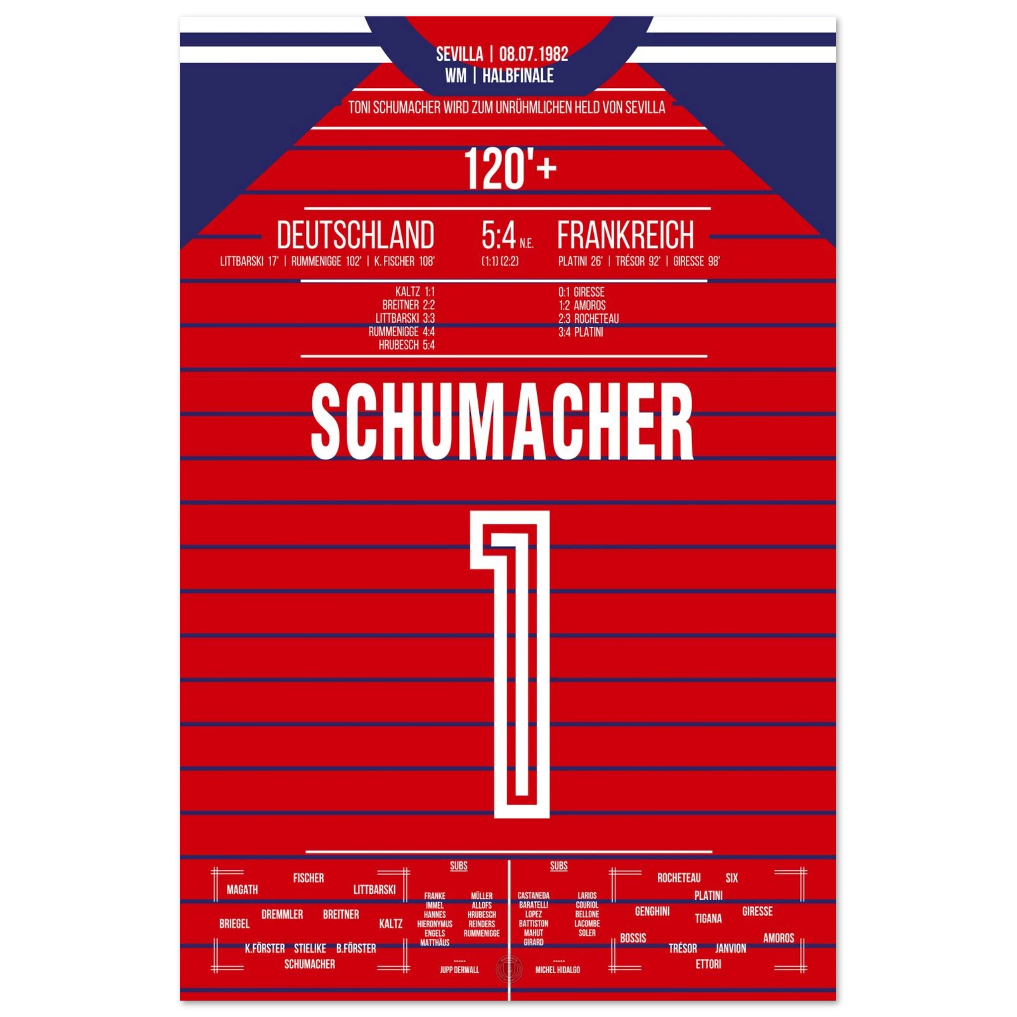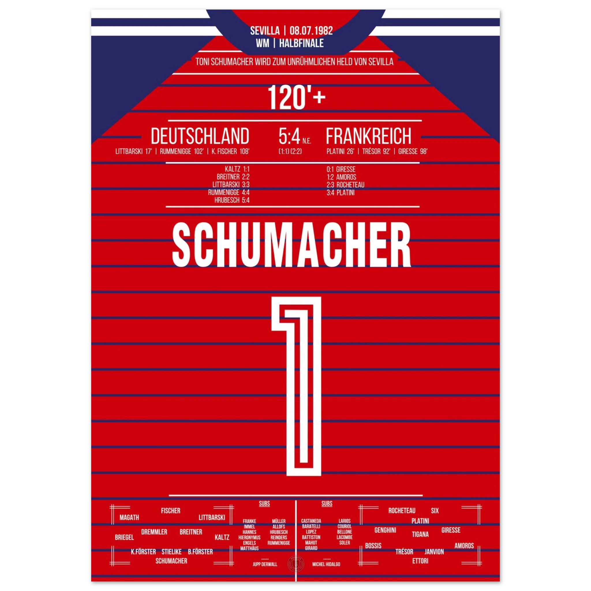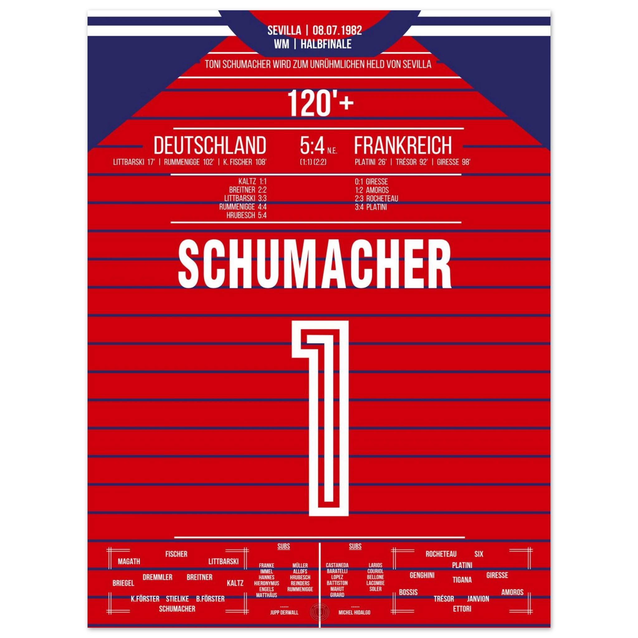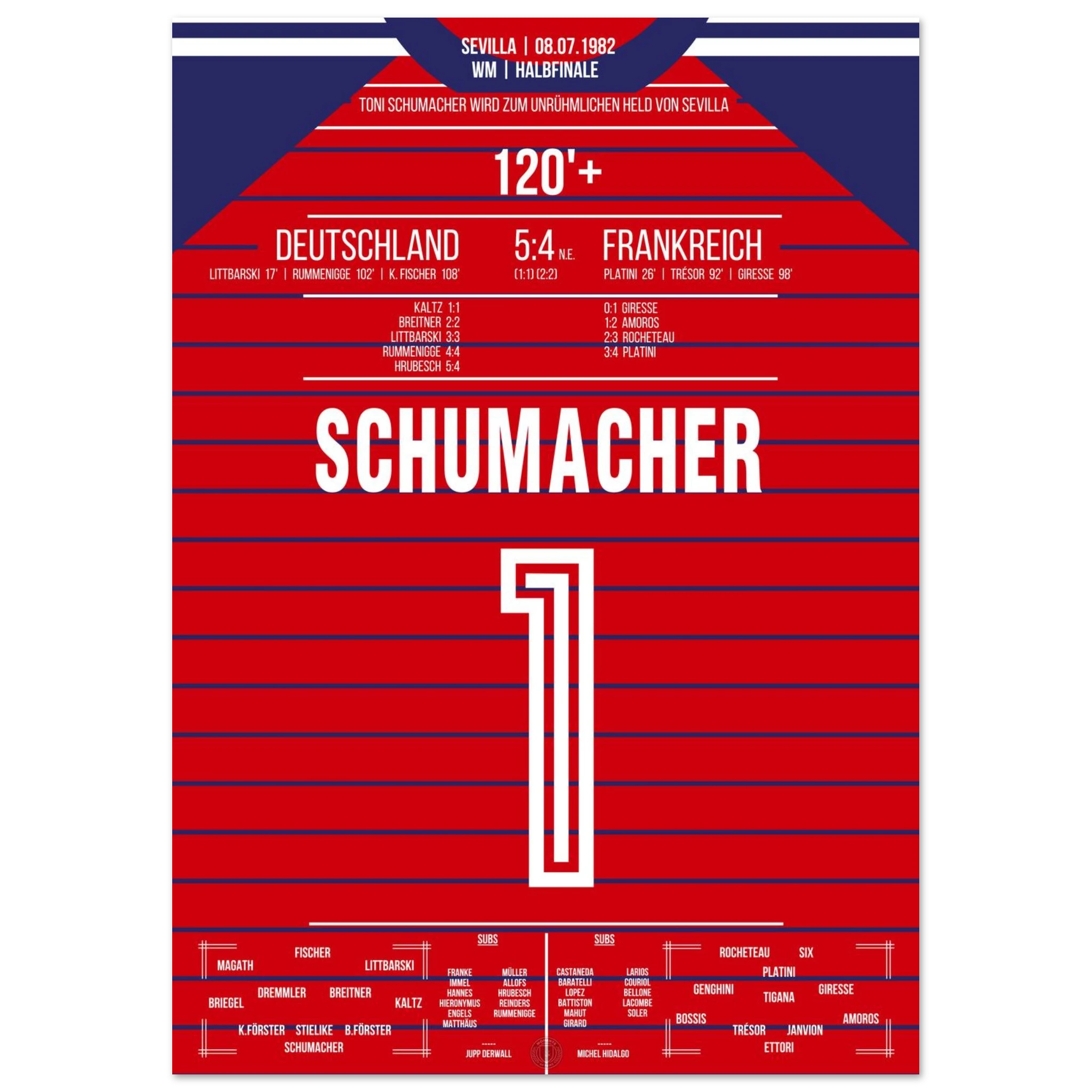 Ein Halbfinale, das Fußballgeschichte schrieb: Nach einem epischen 3:3 nach Verlängerung wird Toni Schumacher im Elfmeterschießen zum umstrittenen Helden. Mit zwei gehaltenen Strafstößen sichert er Deutschland den Finaleinzug – in einem Spiel voller Emotion, Schmerz und Kontroversen.