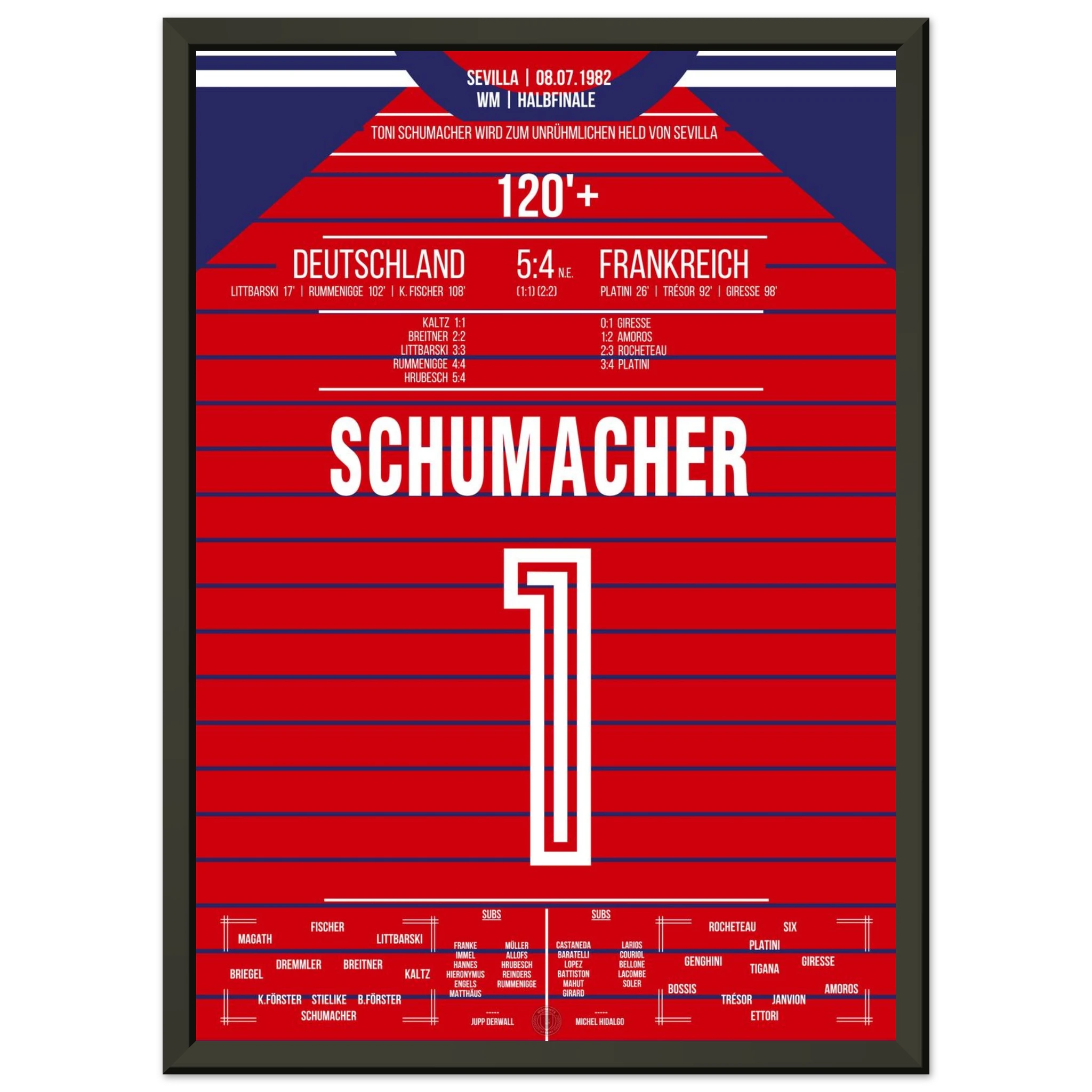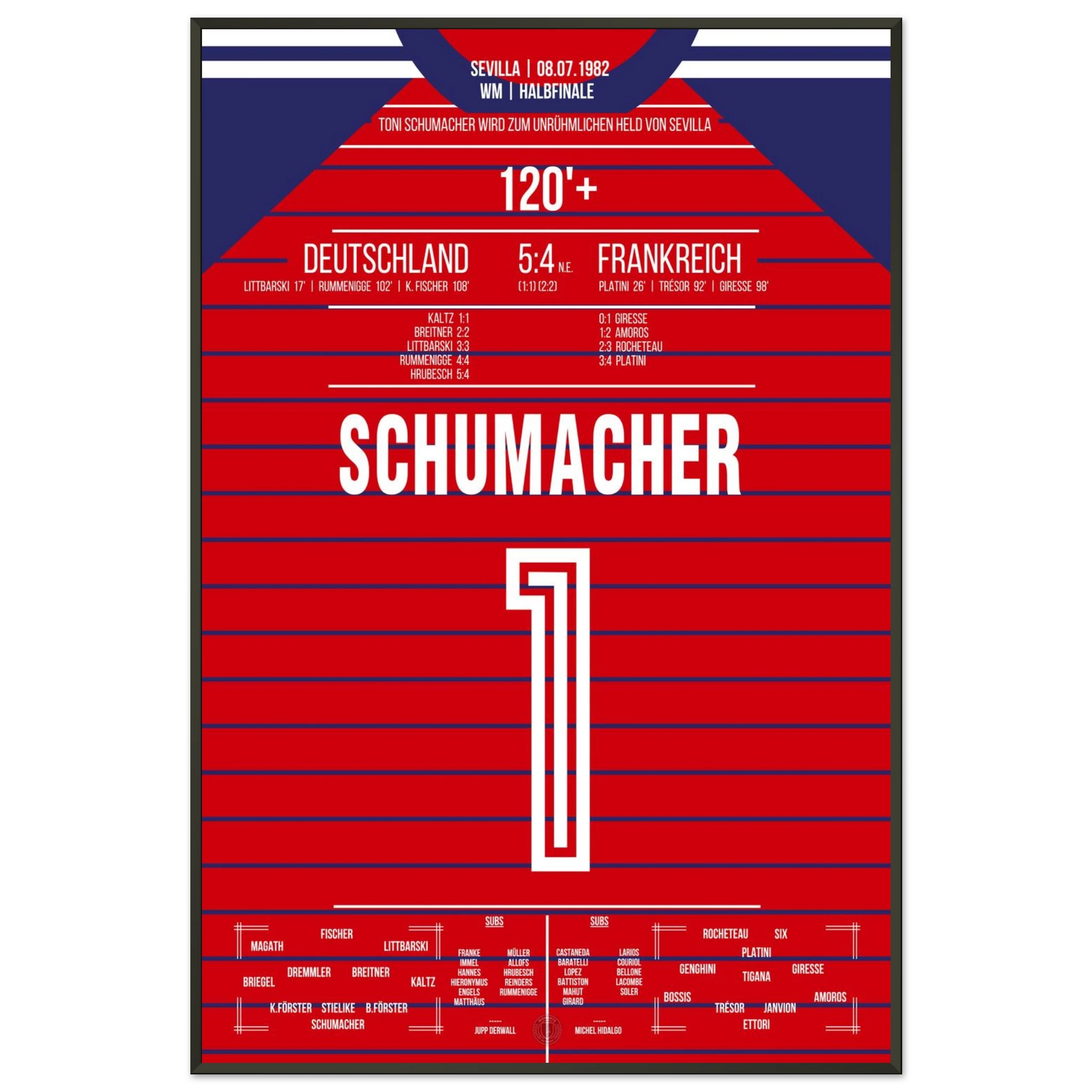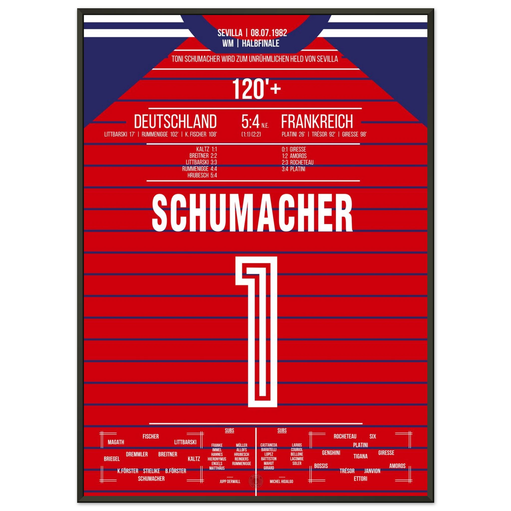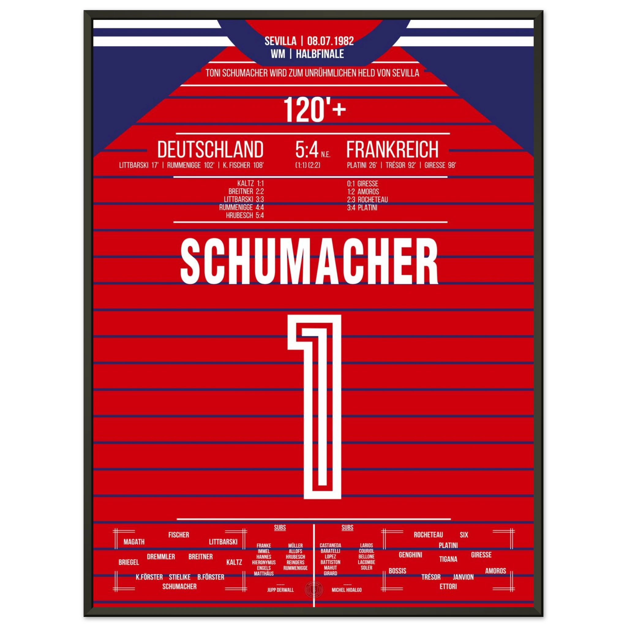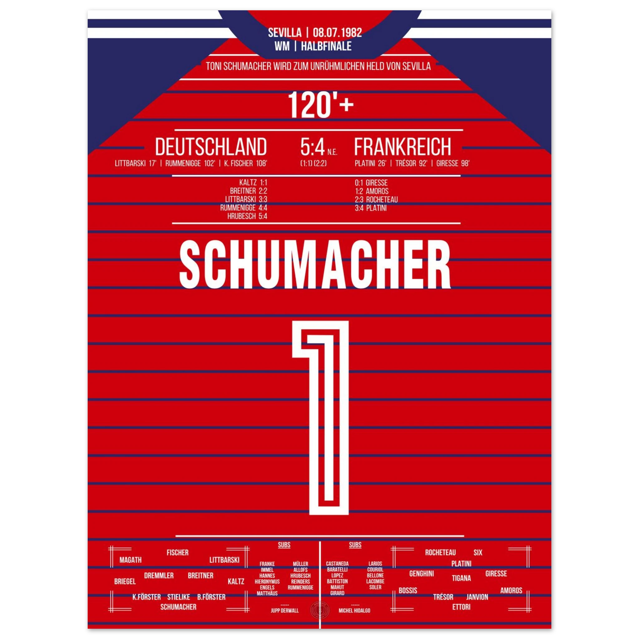 Ein Halbfinale, das Fußballgeschichte schrieb: Nach einem epischen 3:3 nach Verlängerung wird Toni Schumacher im Elfmeterschießen zum umstrittenen Helden. Mit zwei gehaltenen Strafstößen sichert er Deutschland den Finaleinzug – in einem Spiel voller Emotion, Schmerz und Kontroversen.