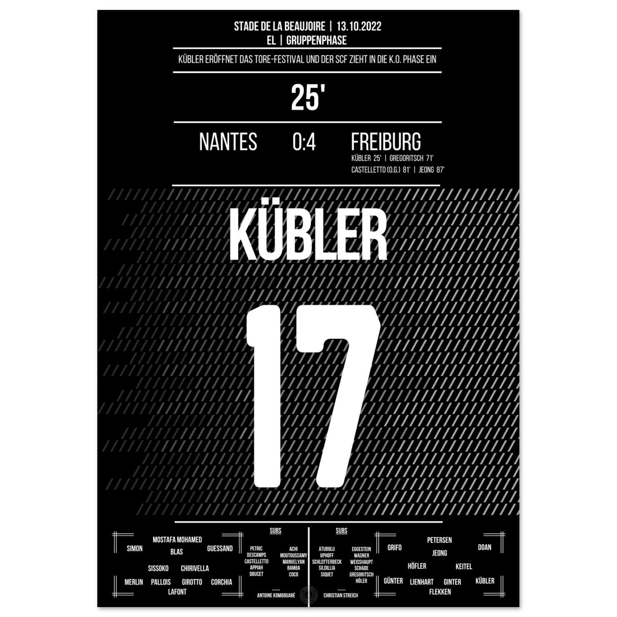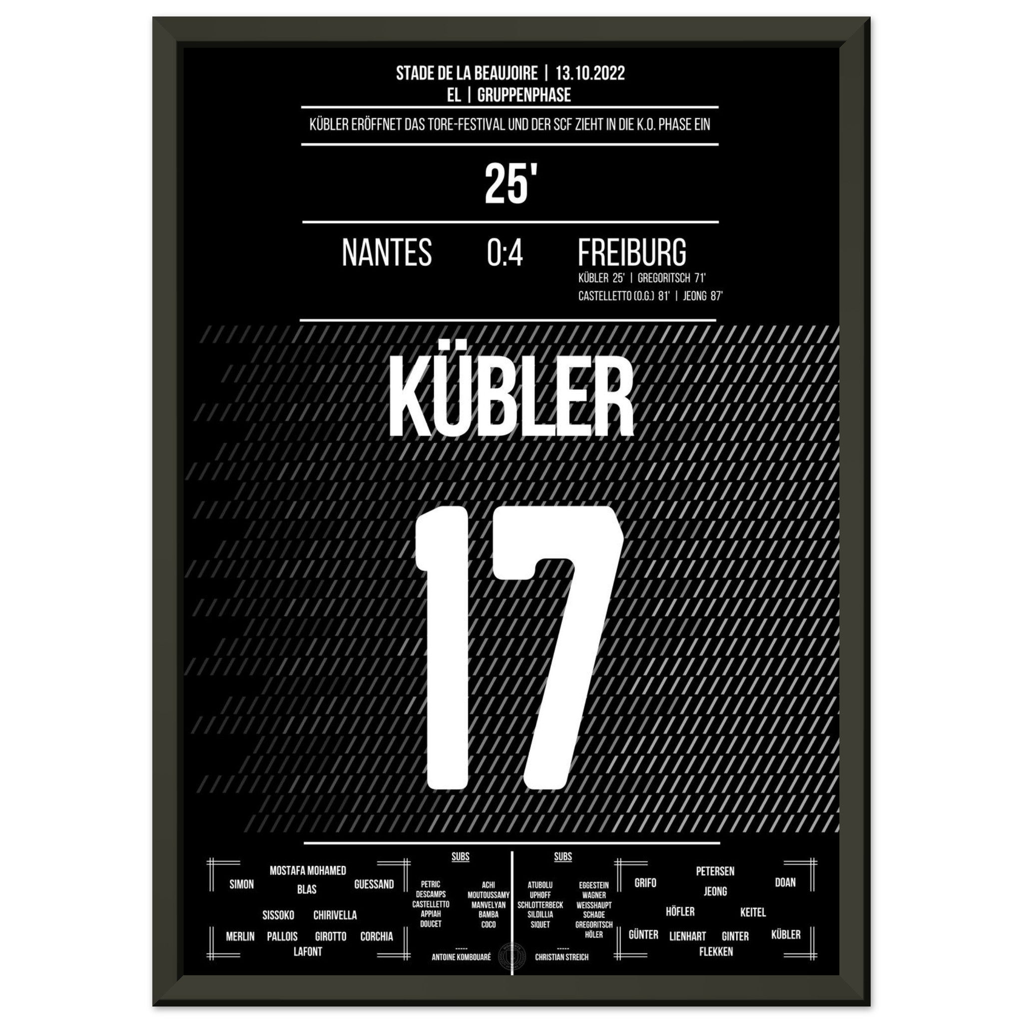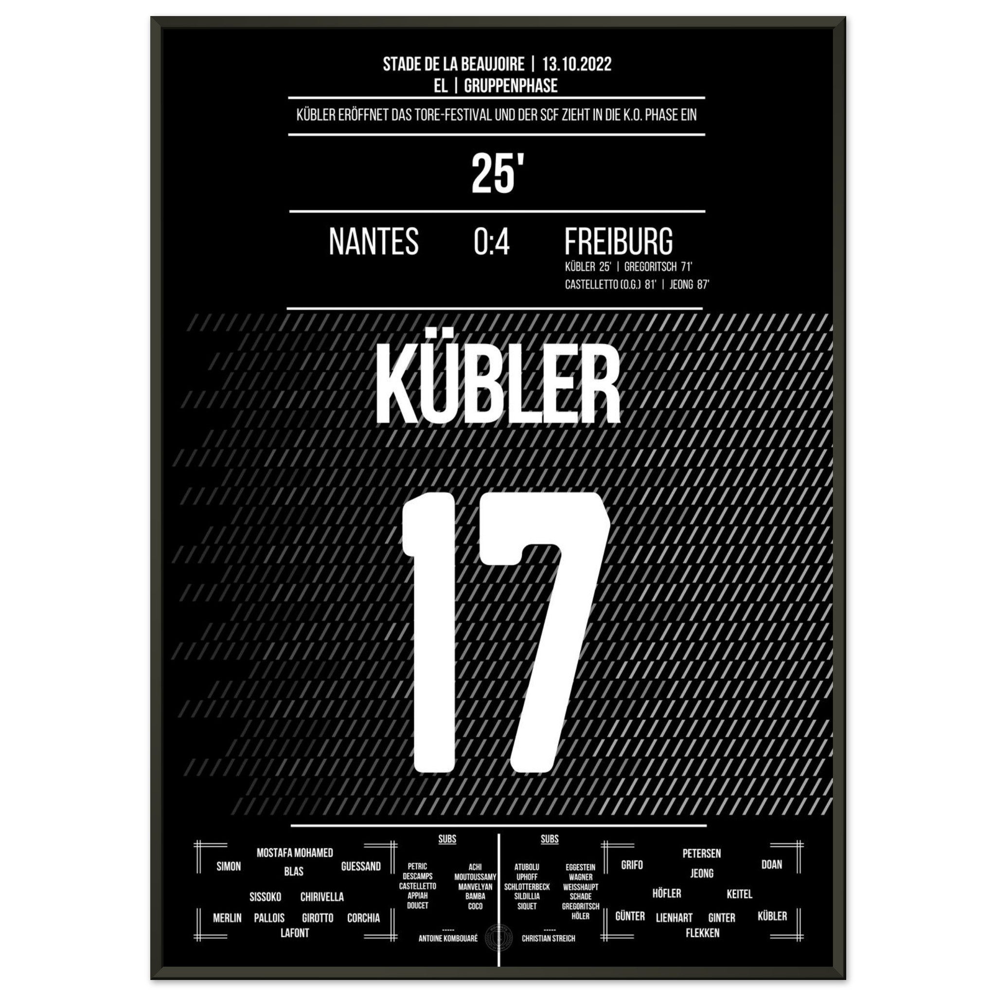 13. Oktober 2022 – Nantes vs. Freiburg 0:4: In der 25. Minute bringt Kübler Freiburg mit seinem Treffer auf die Siegerstraße in Frankreich – der Beginn eines dominanten Europapokal-Abends. Souverän, spielfreudig, historisch. Unser Poster hält diesen internationalen Moment fest.