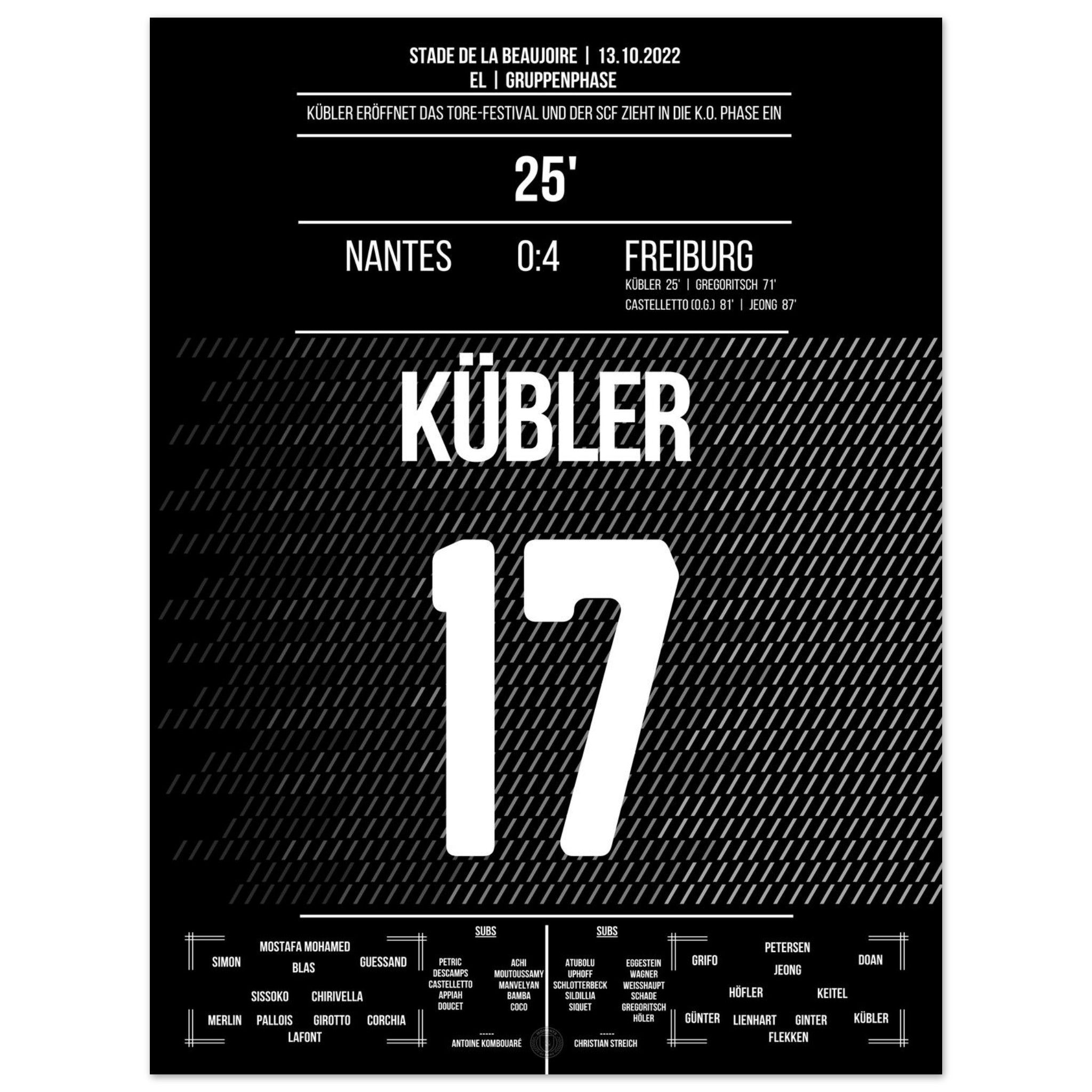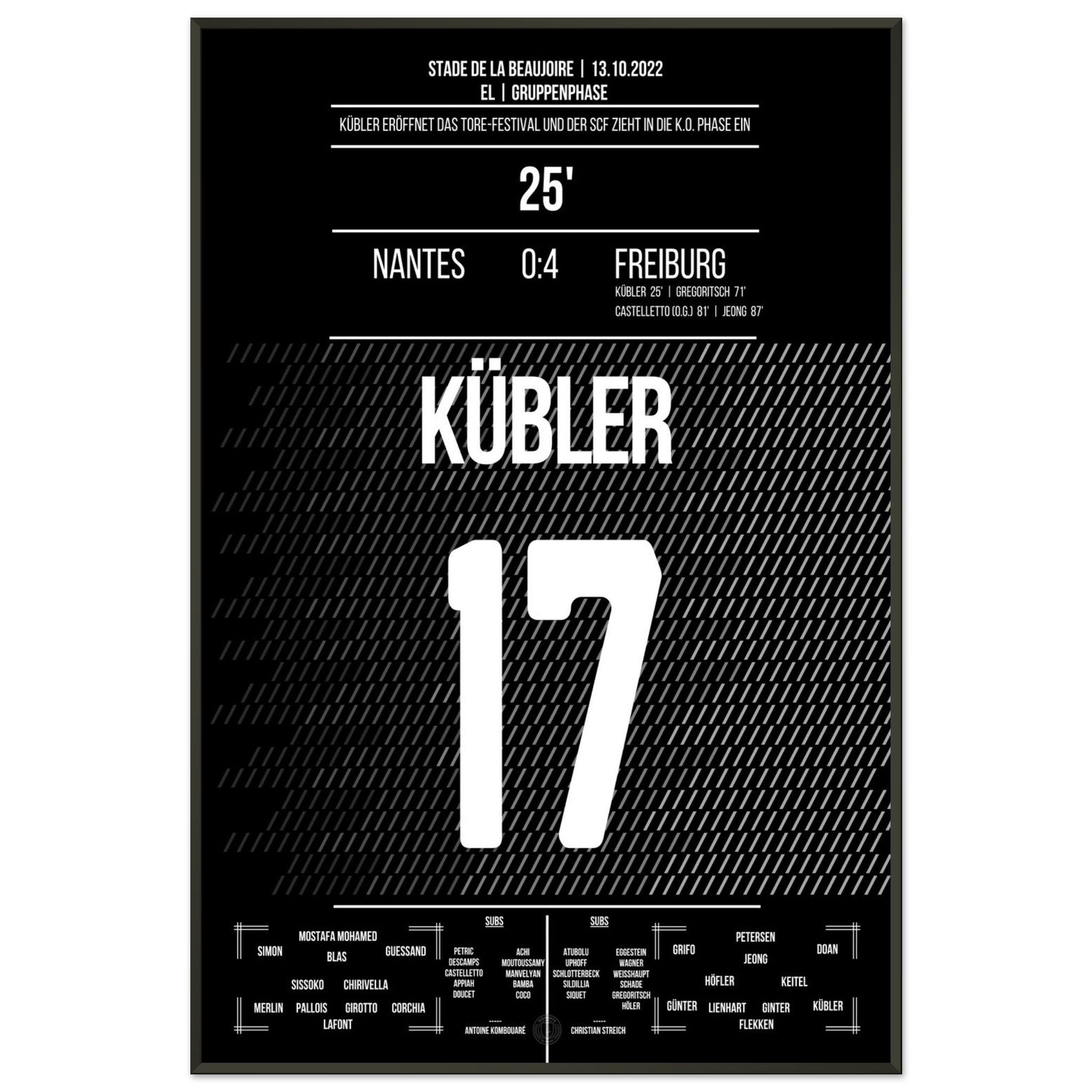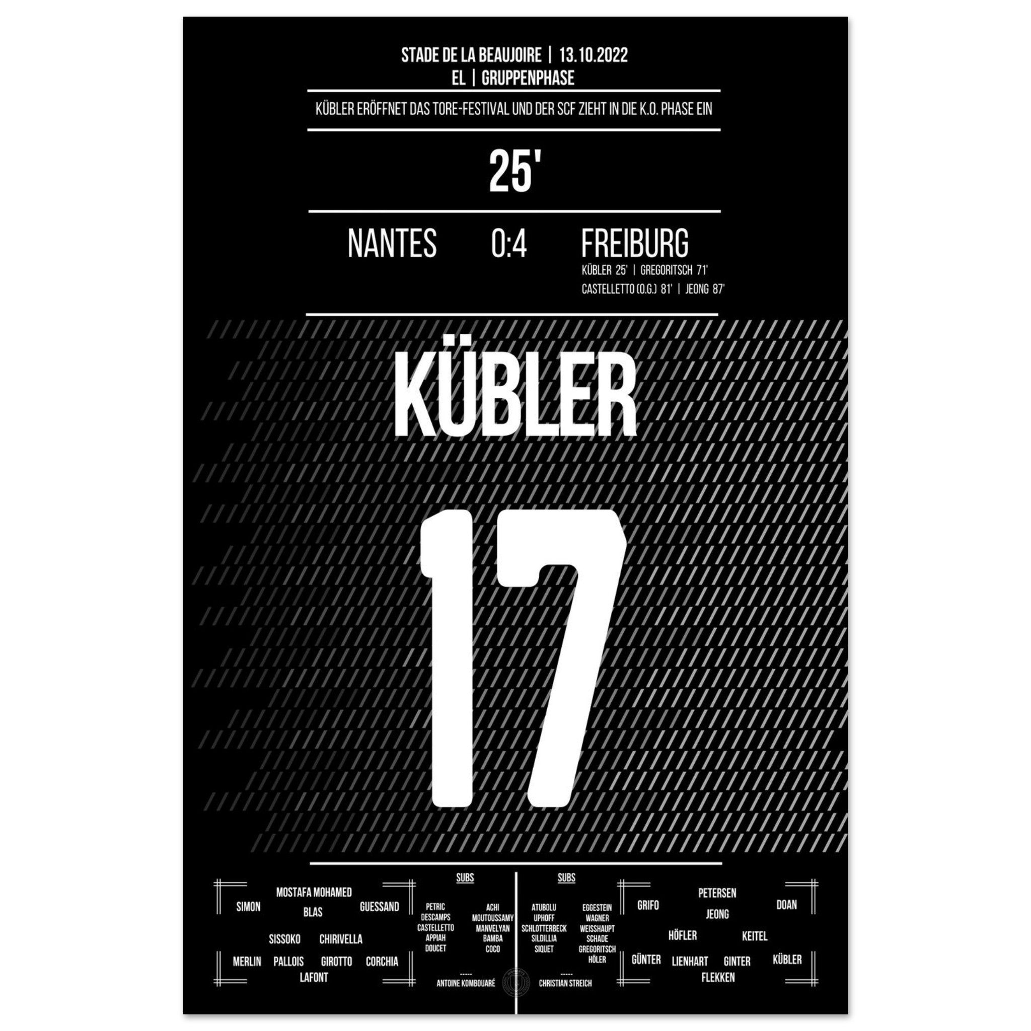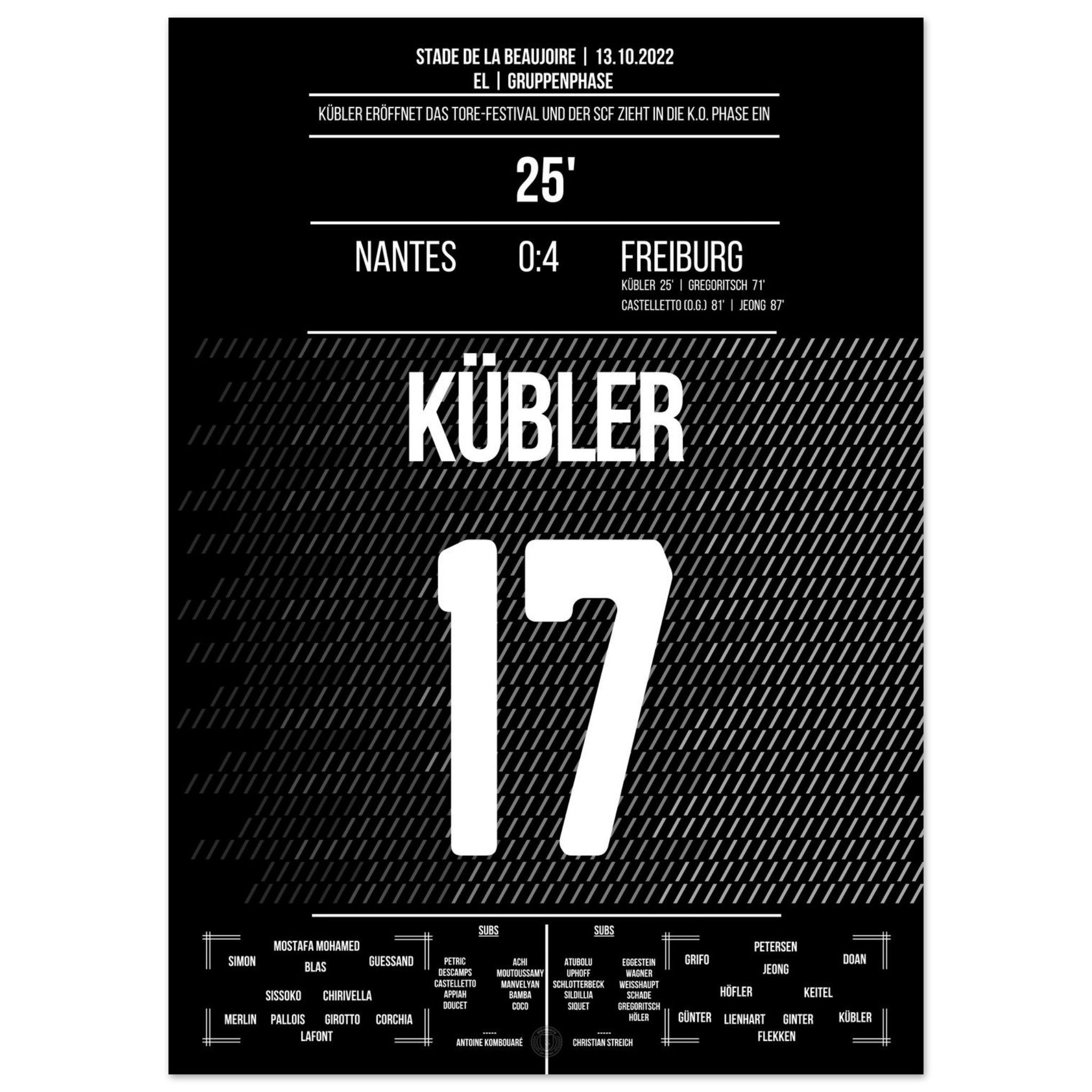13. Oktober 2022 – Nantes vs. Freiburg 0:4: In der 25. Minute bringt Kübler Freiburg mit seinem Treffer auf die Siegerstraße in Frankreich – der Beginn eines dominanten Europapokal-Abends. Souverän, spielfreudig, historisch. Unser Poster hält diesen internationalen Moment fest.