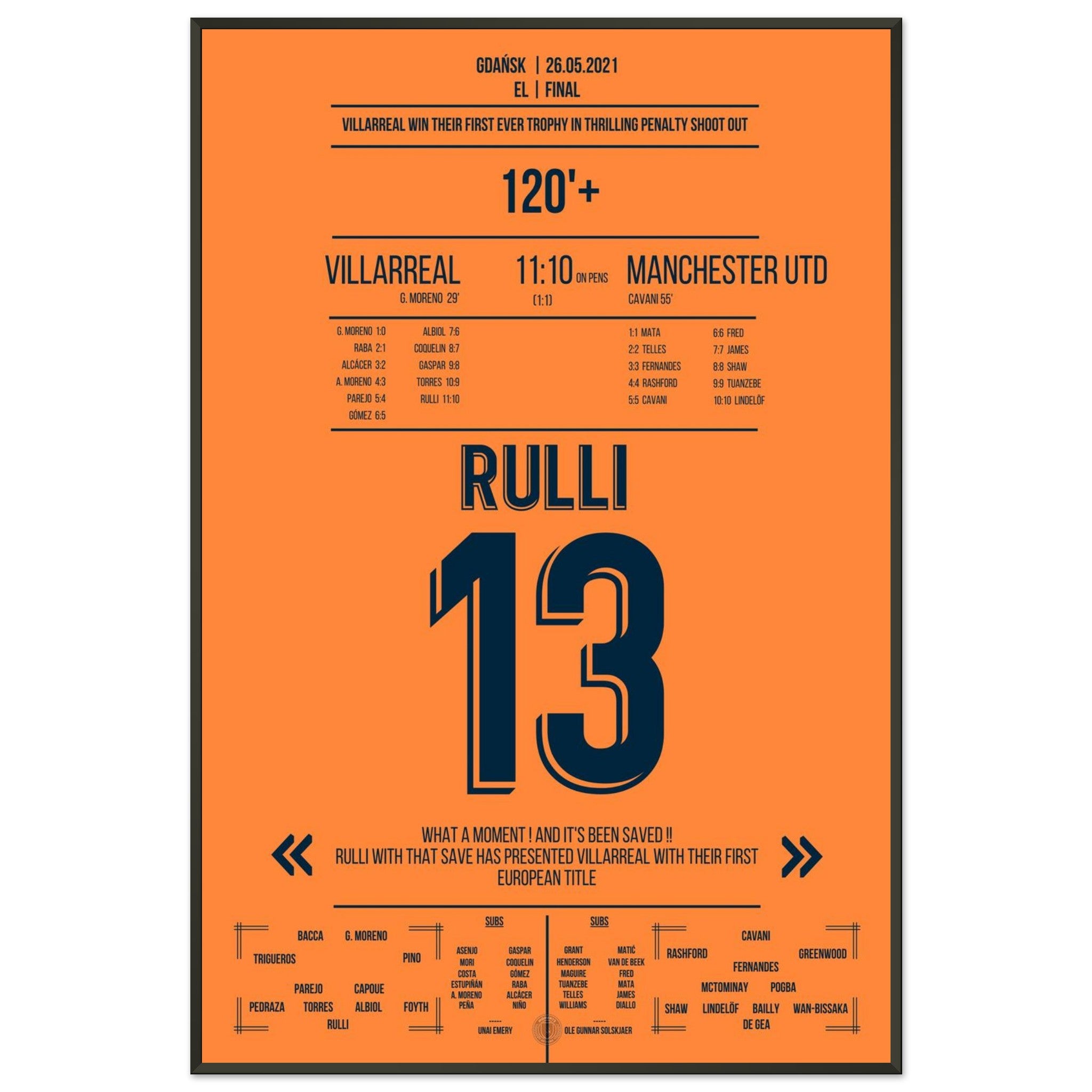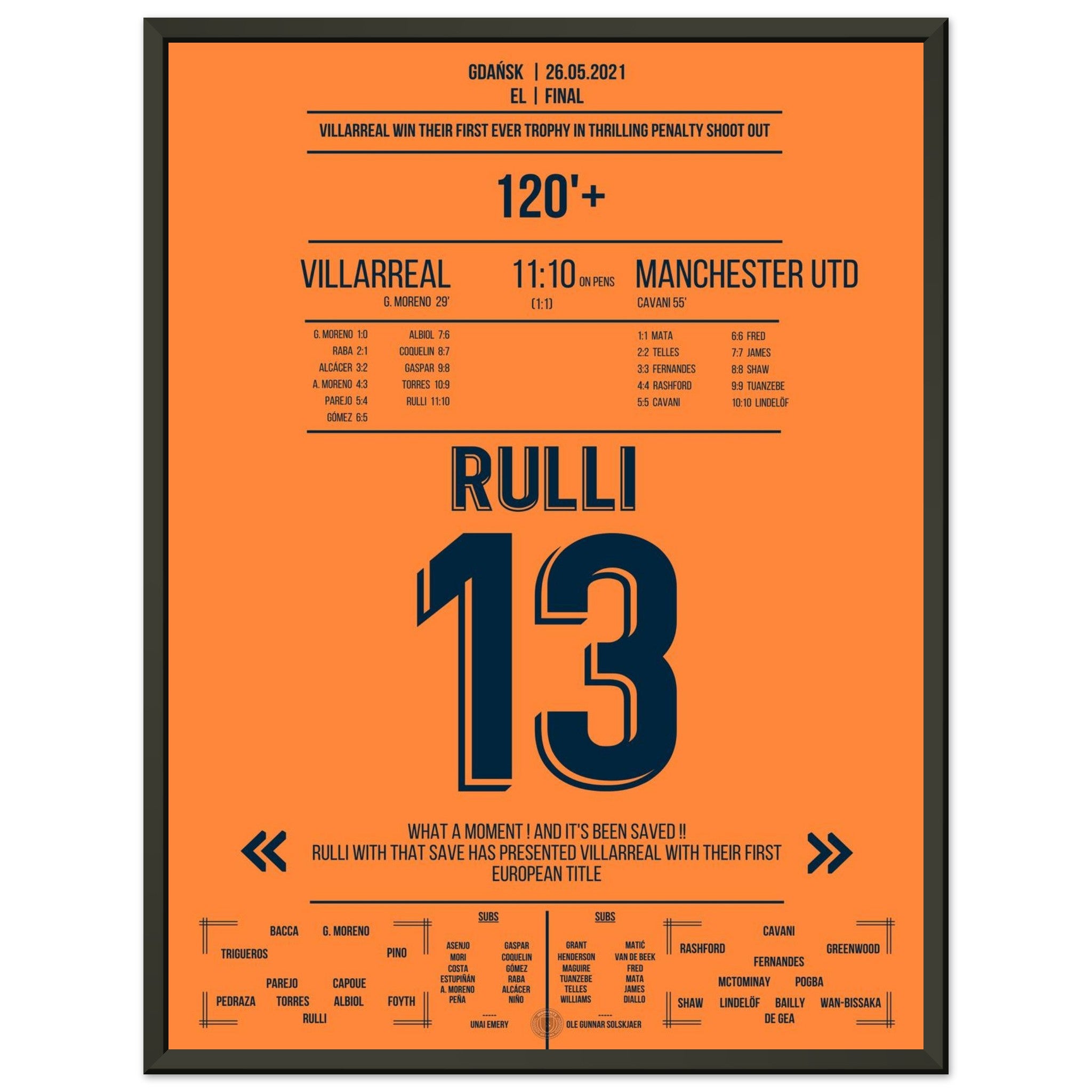 Sie können sicher sein, dass jedes Poster und jeder Rahmen in einer robusten Verpackung versandt wird, damit es in tadellosem Zustand ankommt. Es ist die perfekte Ergänzung für die Sammlung eines jeden Fußballfans oder das perfekte Geschenk für den eingefleischten Fußball-Fan ihres Freundes- oder Familienkreises.