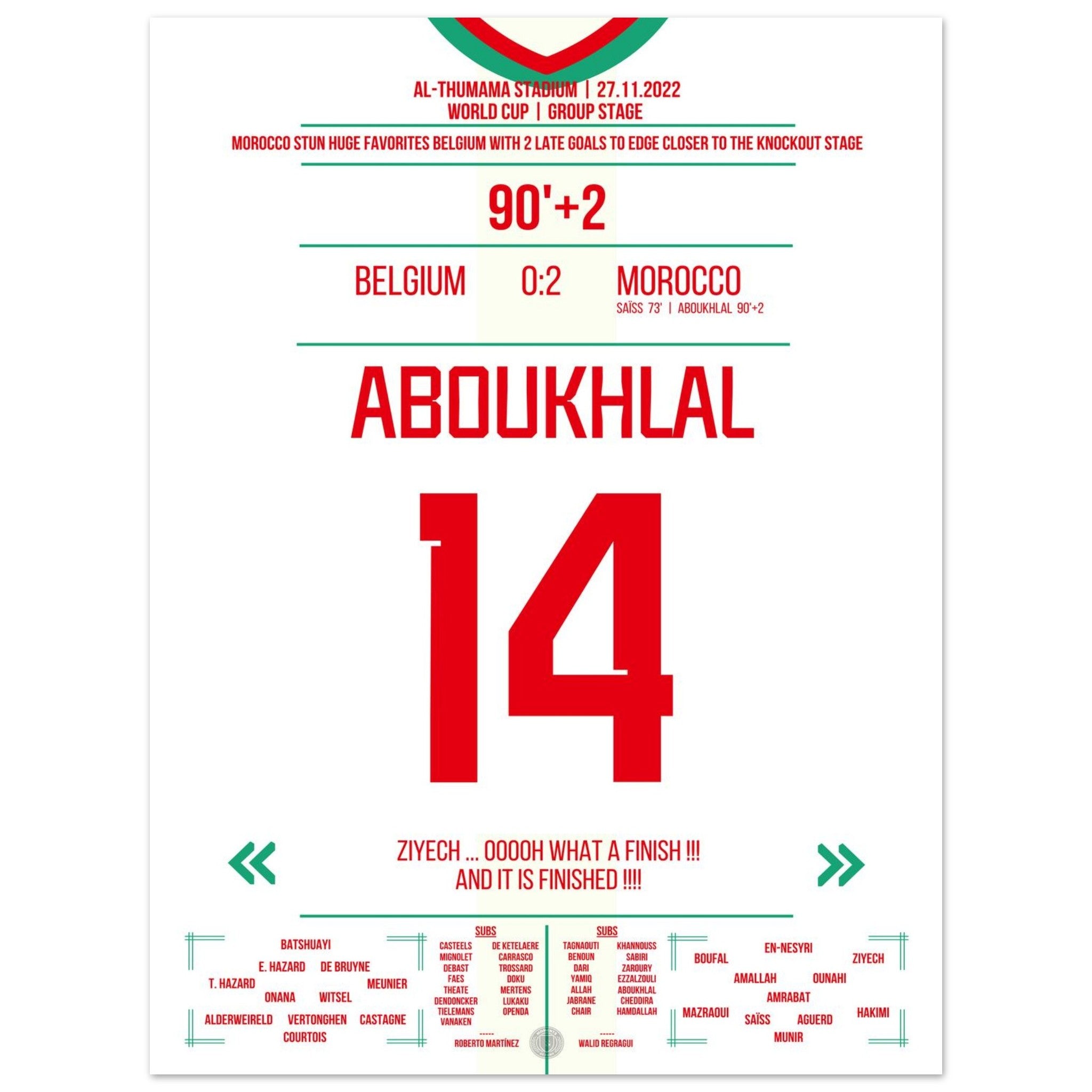 In Doha sorgt Marokko für eine der großen Überraschungen der Weltmeisterschaft. Sabiri trifft per Freistoß, Aboukhlal legt nach – und die Roten Teufel sind geschlagen. Ganz Nordafrika jubelt über einen historischen Sieg, der Stolz, Leidenschaft und Einheit verkörpert.