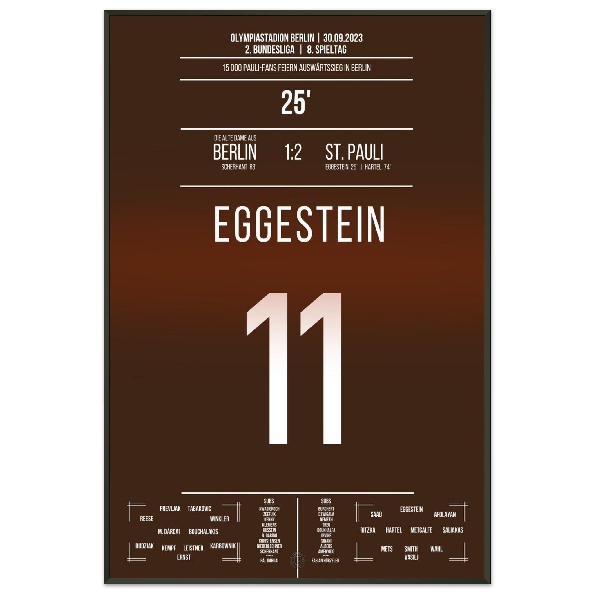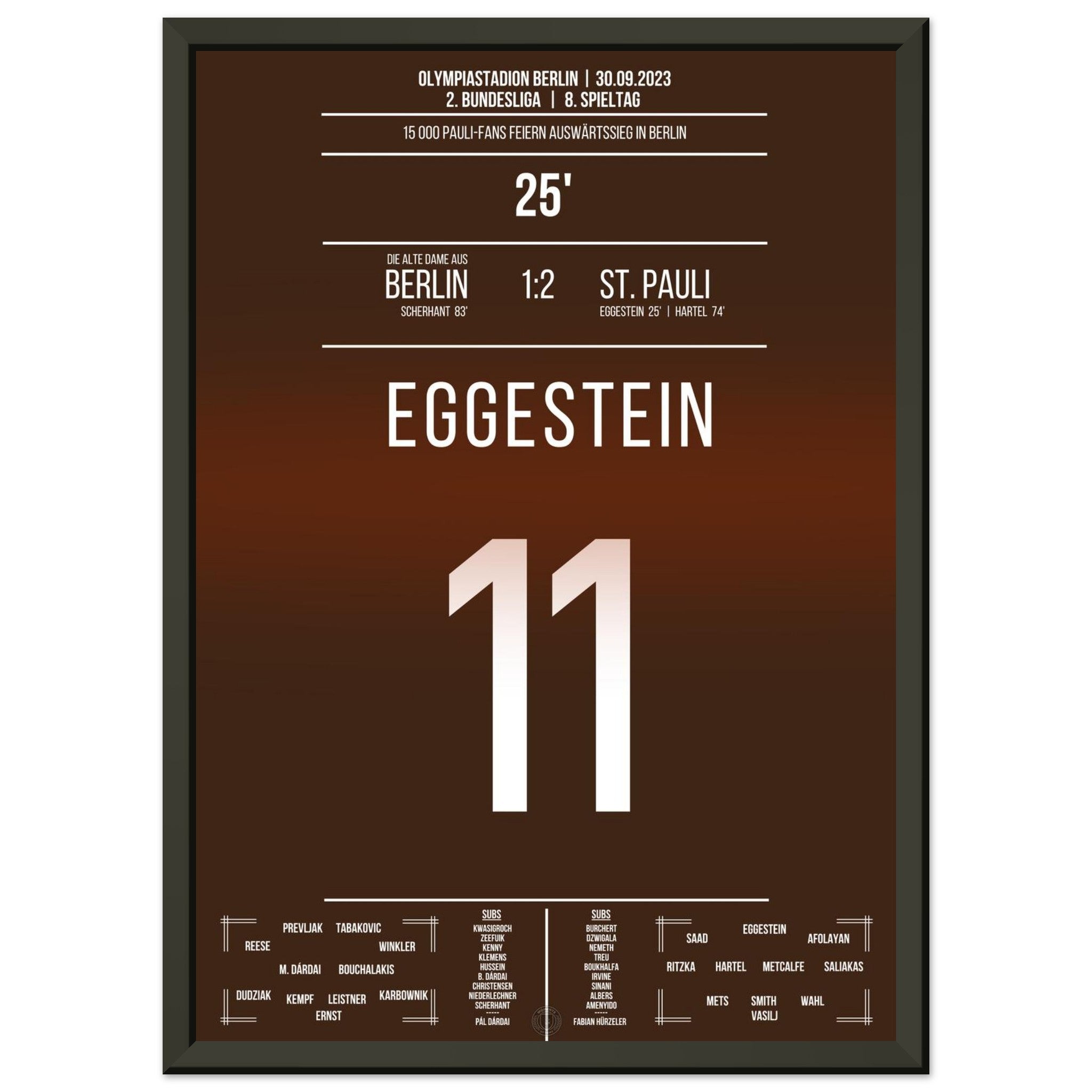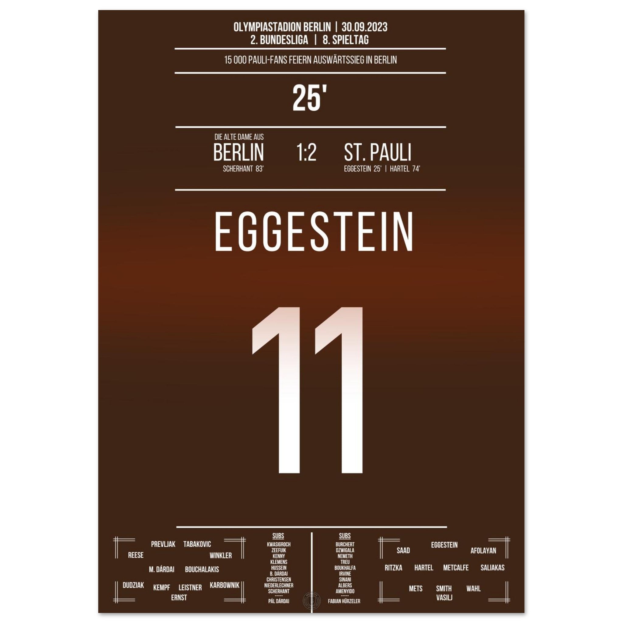 30. September 2023 – Berlin vs. St. Pauli 1:2: St. Pauli dreht die Partie in der Hauptstadt und feiert einen hart erkämpften Auswärtssieg. Ein Signal im Aufstiegskampf – und pure Ekstase bei den mitgereisten Fans. Unser Poster hält diesen starken Moment in Braun-Weiß für die Ewigkeit fest.