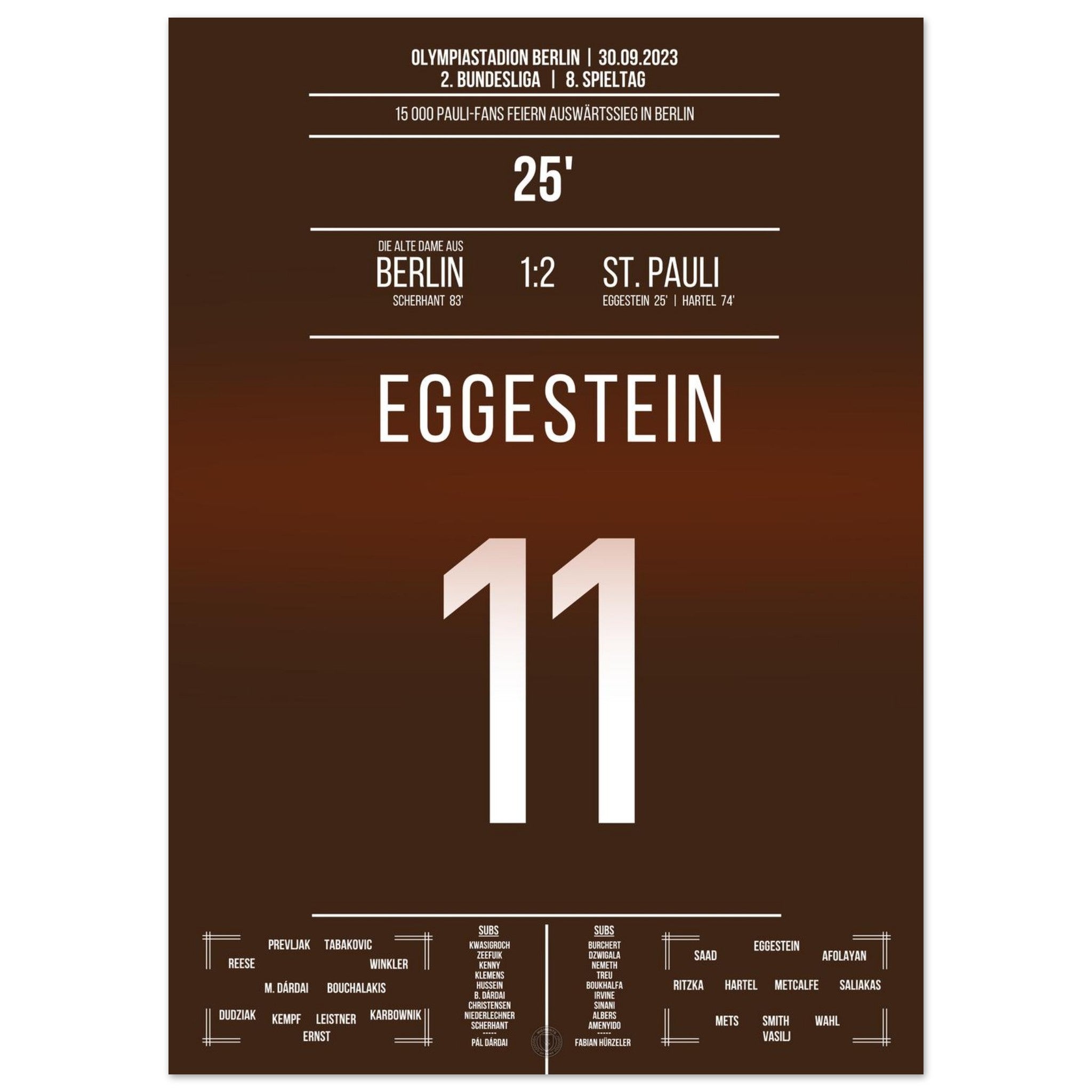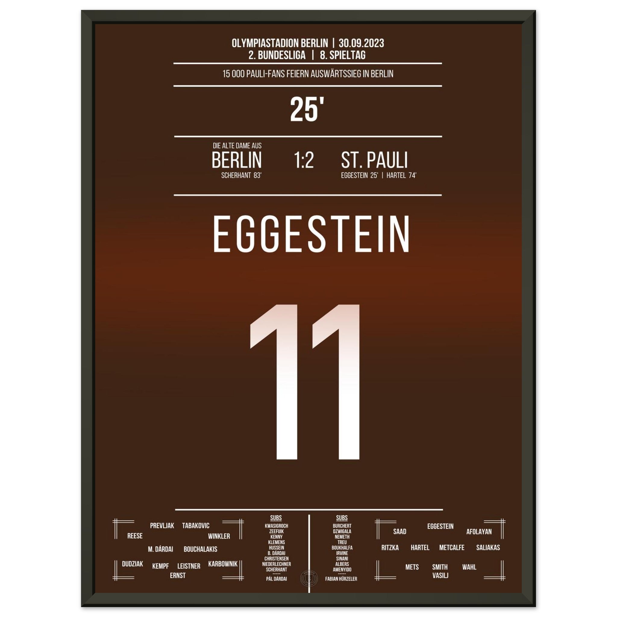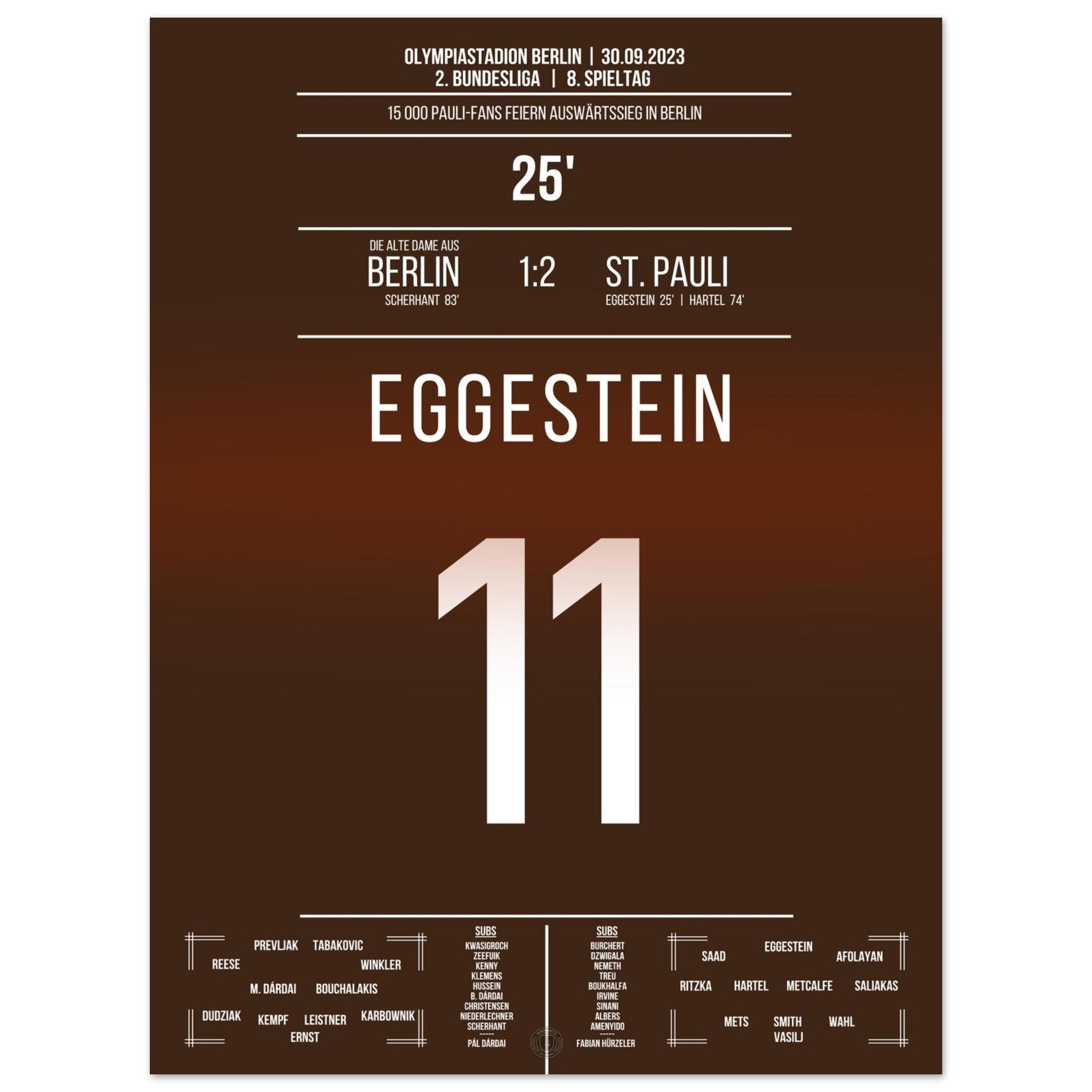 30. September 2023 – Berlin vs. St. Pauli 1:2: St. Pauli dreht die Partie in der Hauptstadt und feiert einen hart erkämpften Auswärtssieg. Ein Signal im Aufstiegskampf – und pure Ekstase bei den mitgereisten Fans. Unser Poster hält diesen starken Moment in Braun-Weiß für die Ewigkeit fest.
