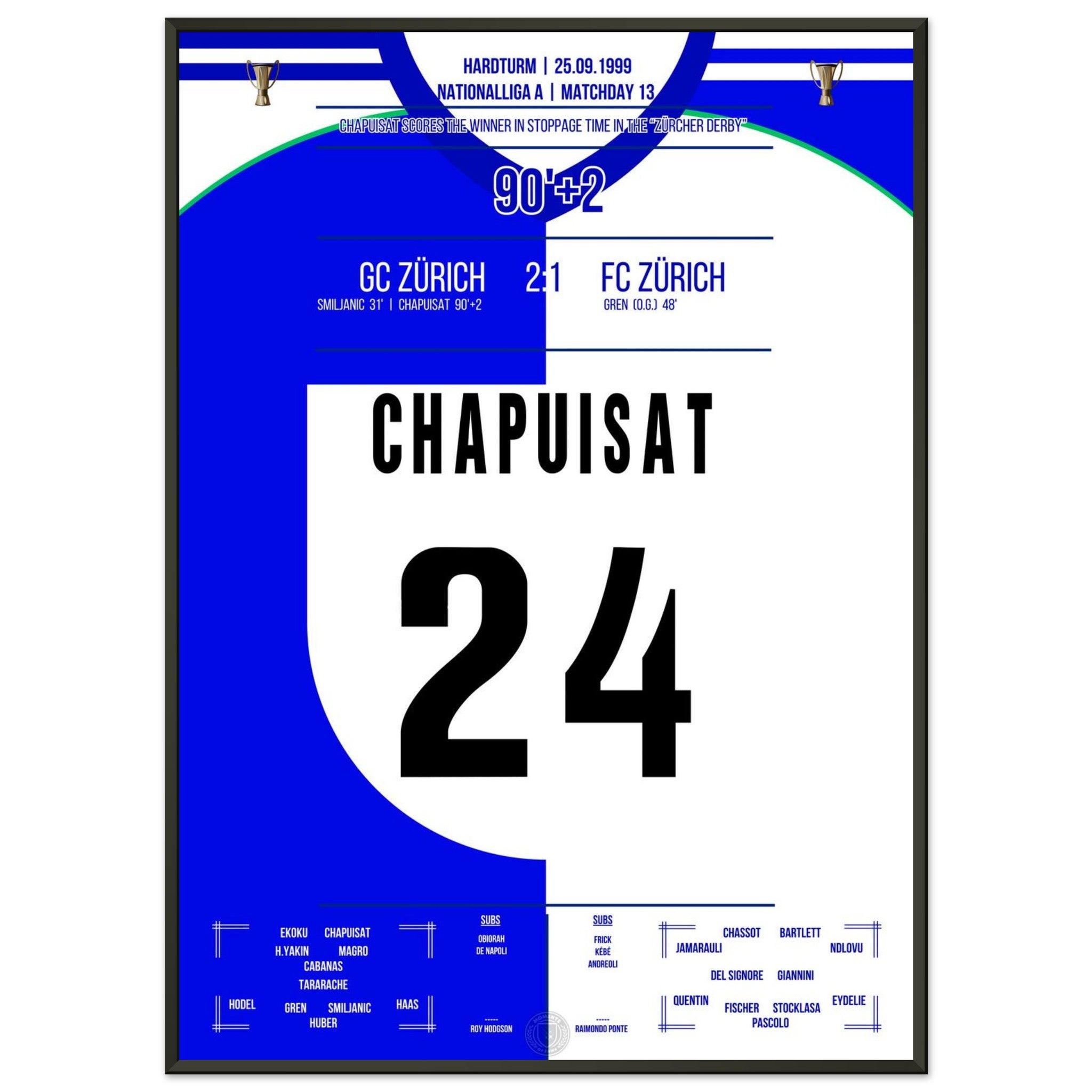 Sie können sicher sein, dass jedes Poster und jeder Rahmen in einer robusten Verpackung versandt wird, damit es in tadellosem Zustand ankommt. Es ist die perfekte Ergänzung für die Sammlung eines jeden Fußballfans oder das perfekte Geschenk für den eingefleischten Fußball-Fan ihres Freundes- oder Familienkreises.