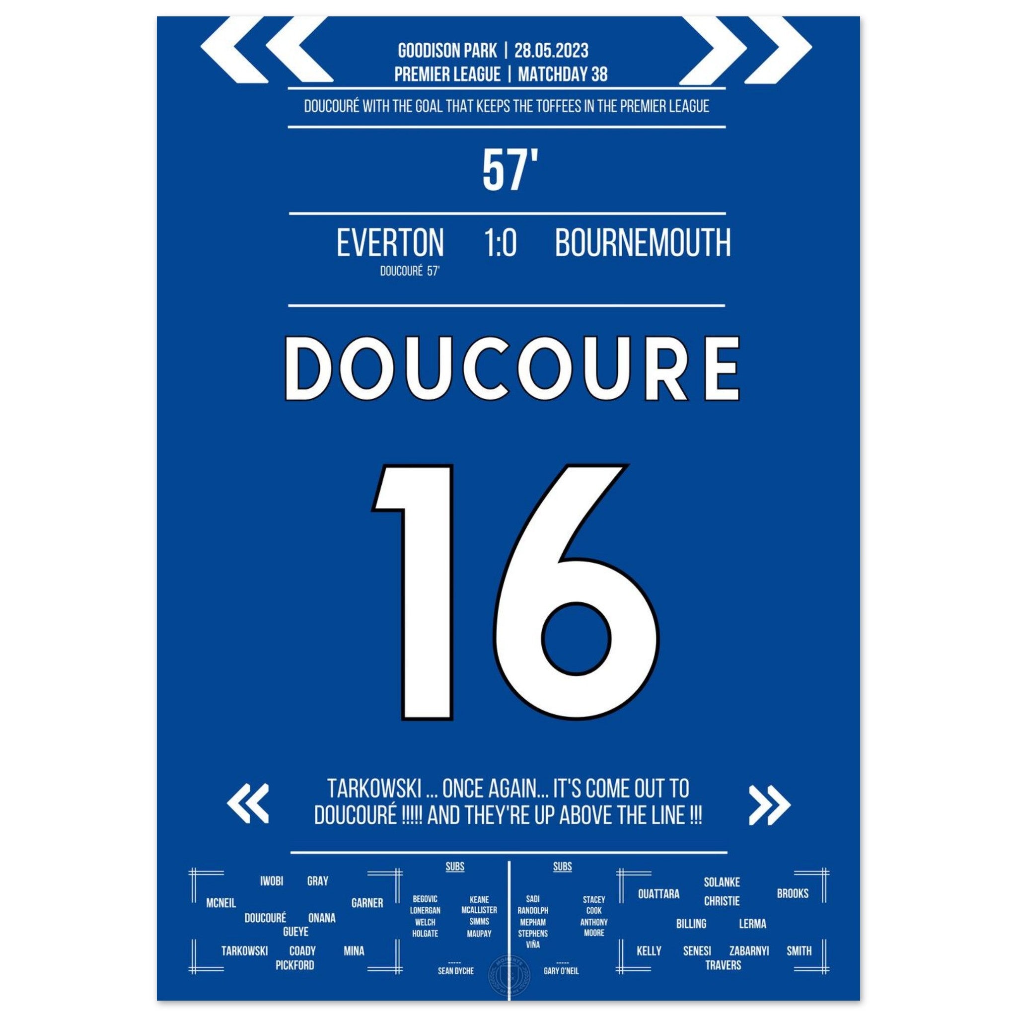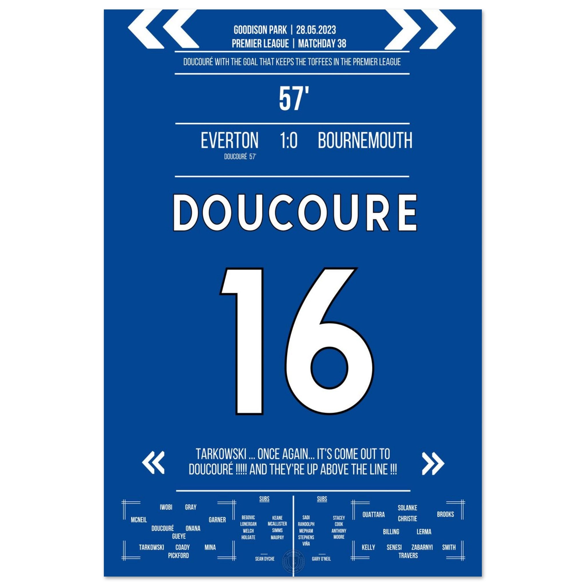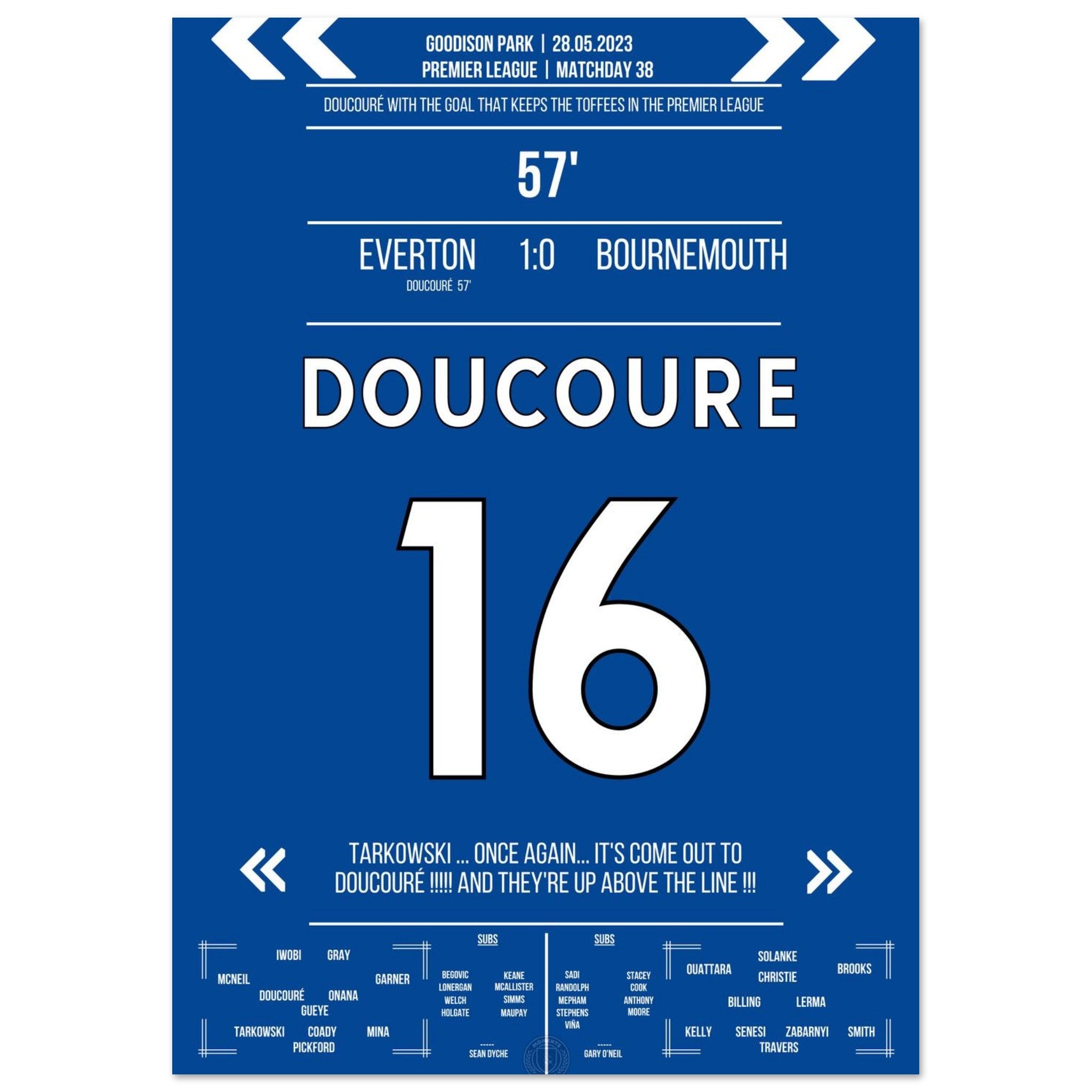 Mit einem Strahl in der 57. Minute erlöst Doucouré das ganze Stadion. Sein Treffer zum 1:0 gegen Bournemouth sichert der Stadt den Klassenerhalt – und lässt ganz Everton beben.