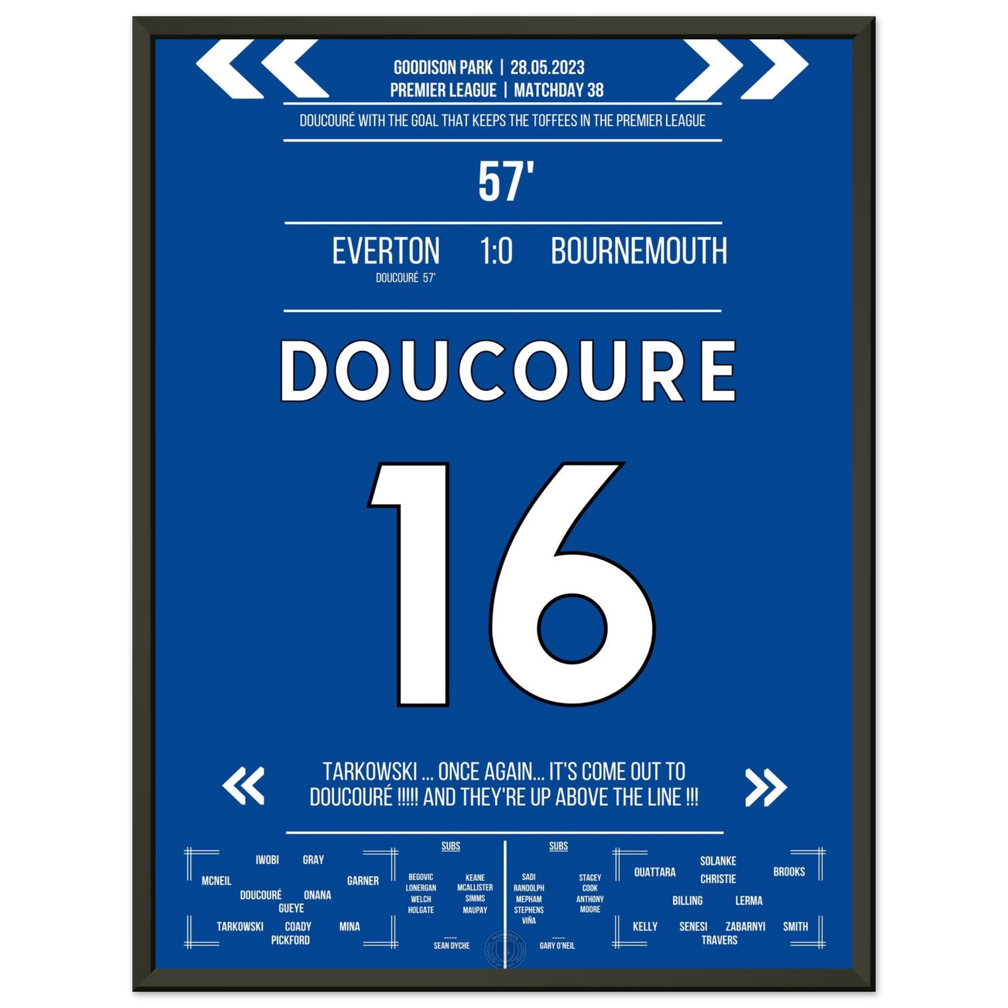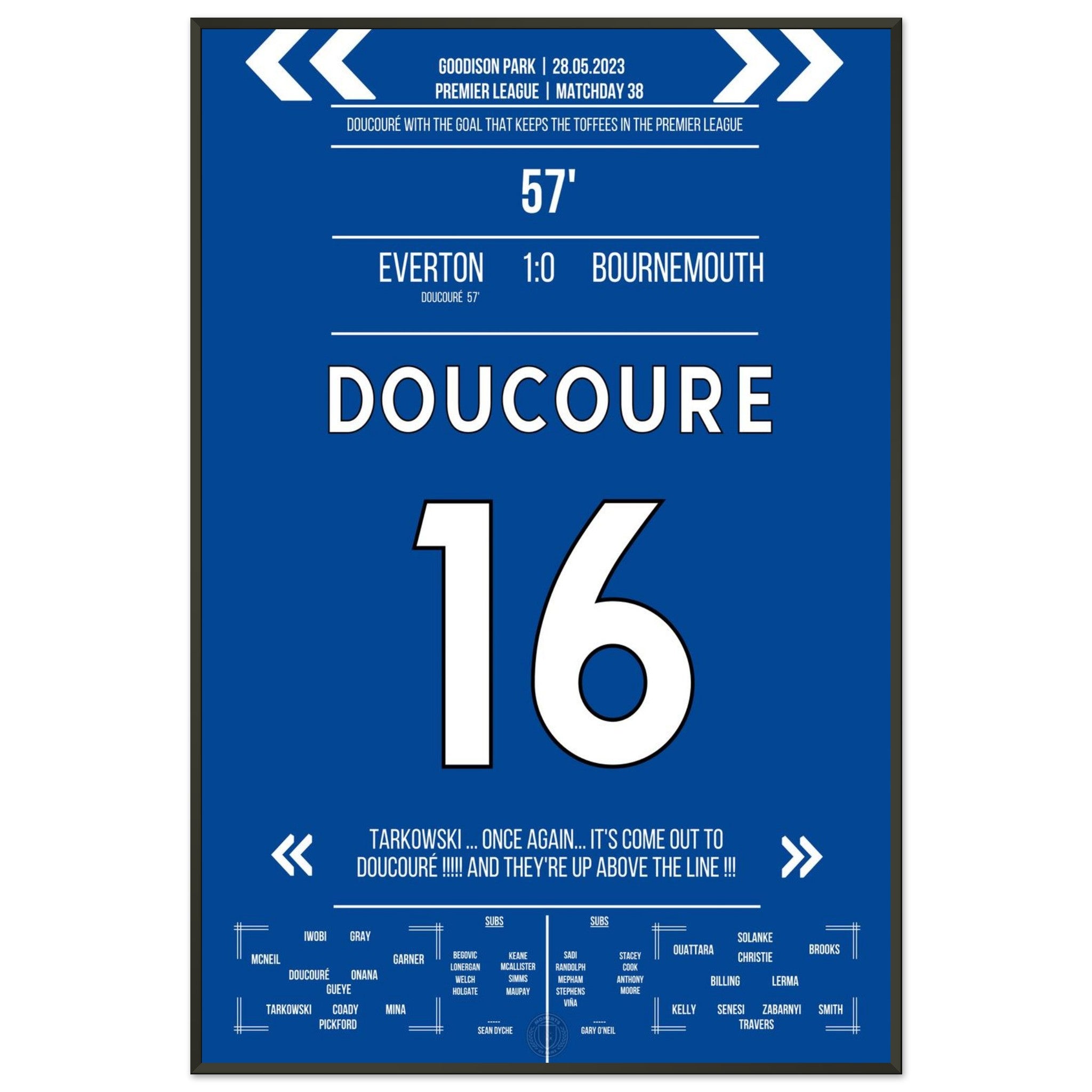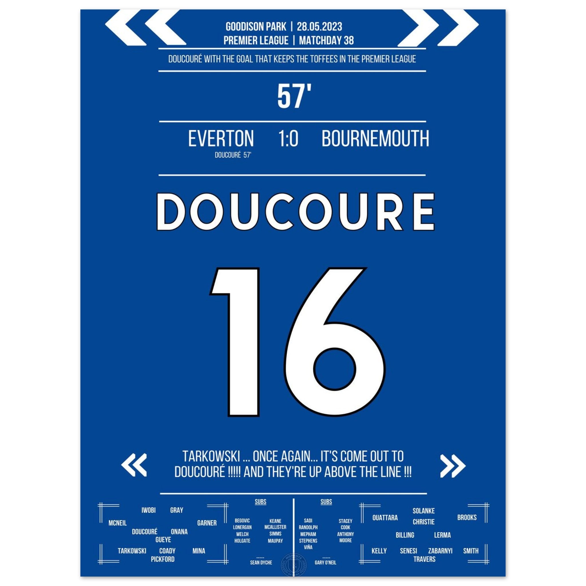 Mit einem Strahl in der 57. Minute erlöst Doucouré das ganze Stadion. Sein Treffer zum 1:0 gegen Bournemouth sichert der Stadt den Klassenerhalt – und lässt ganz Everton beben.
