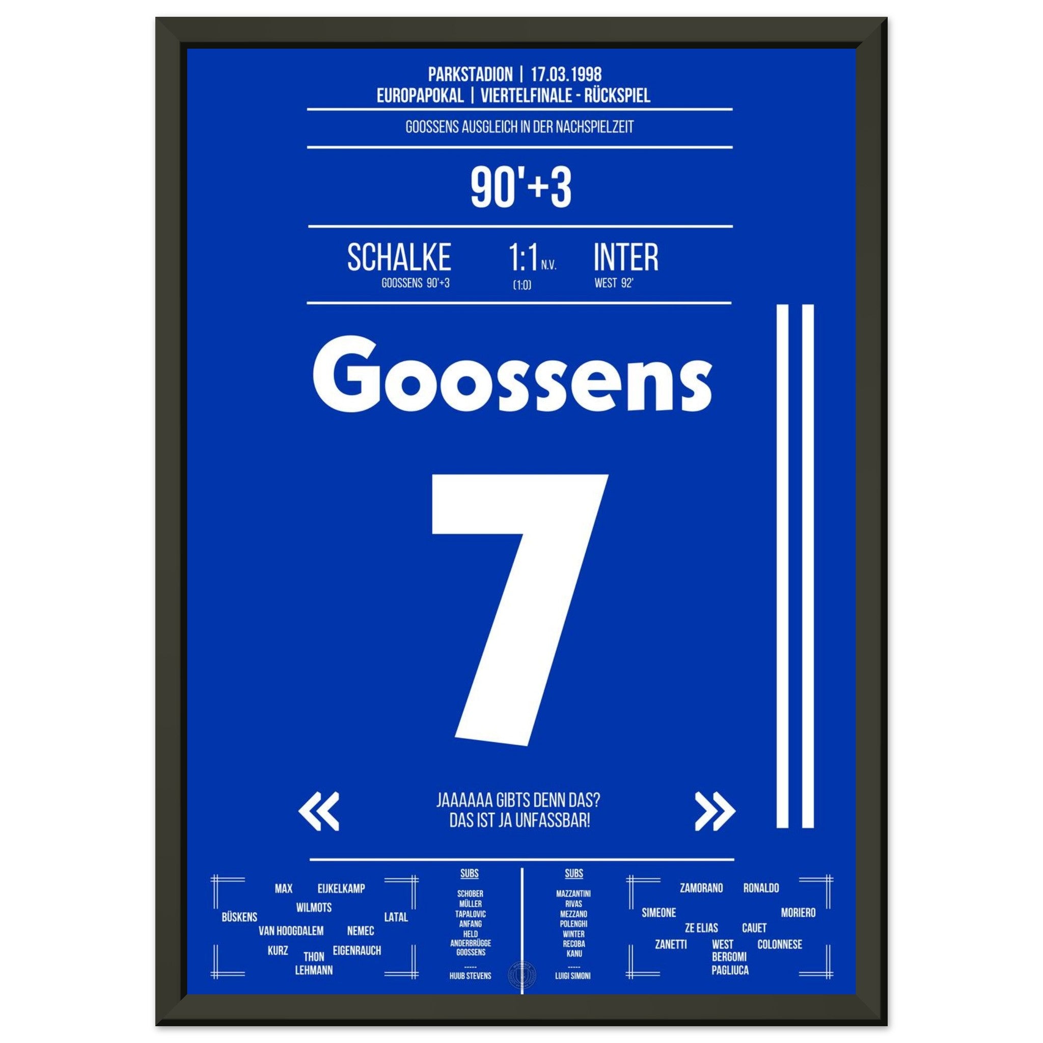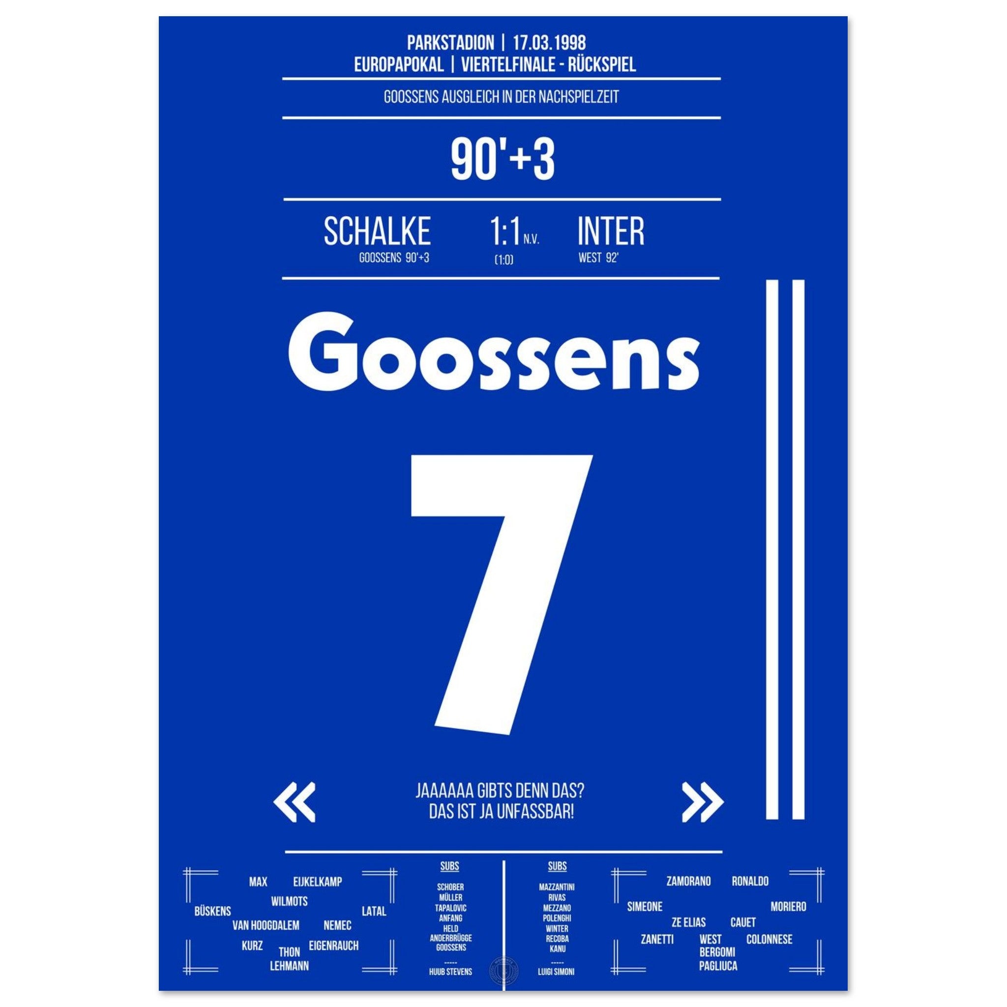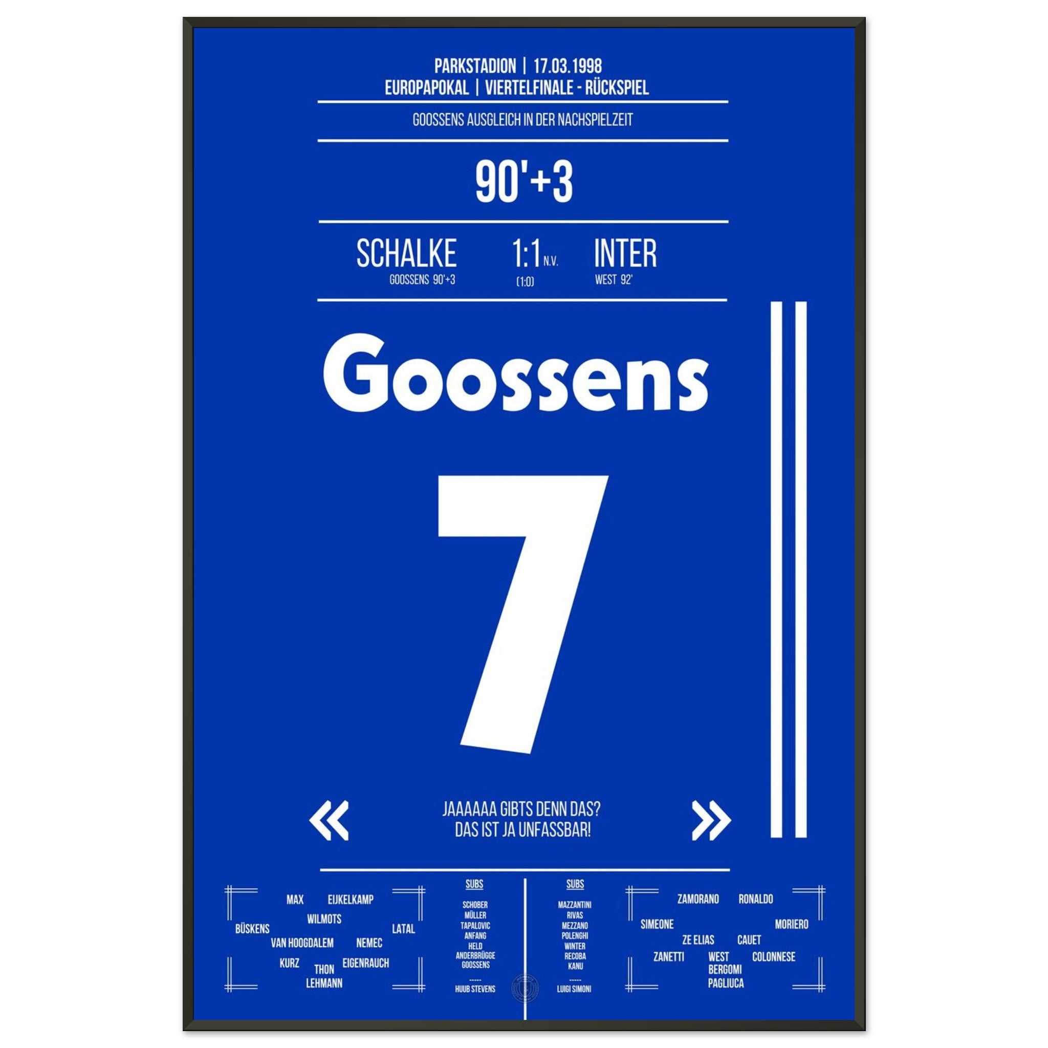 17. März 1998 – Schalke vs. Inter 1:0: Goossens bringt Schalke dramatisch gegen Inter in die Verlängerung im Europapokal-Viertelfinale. Unser Poster verewigt diesen legendären Moment in Königsblau.