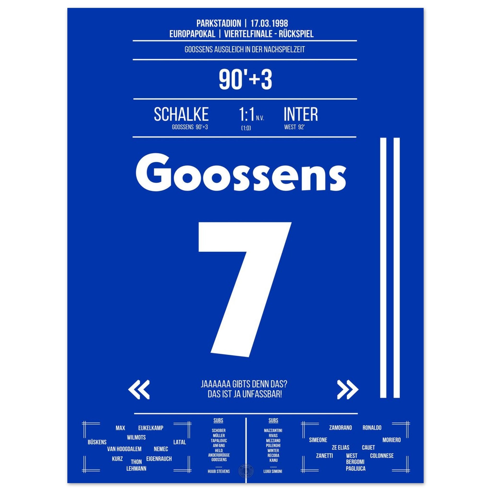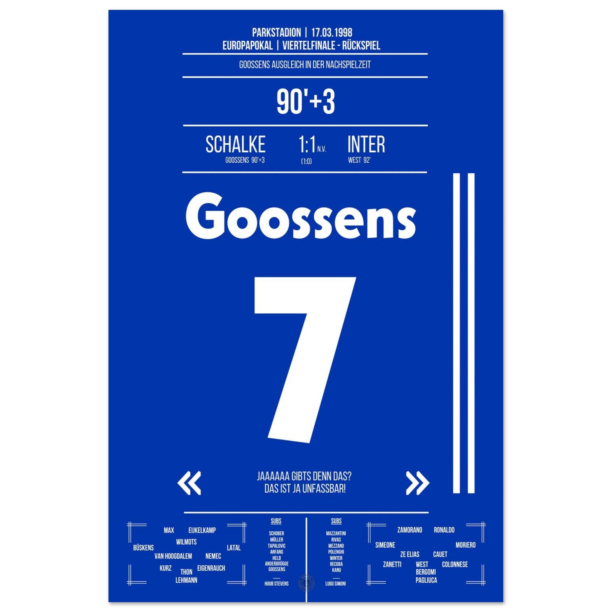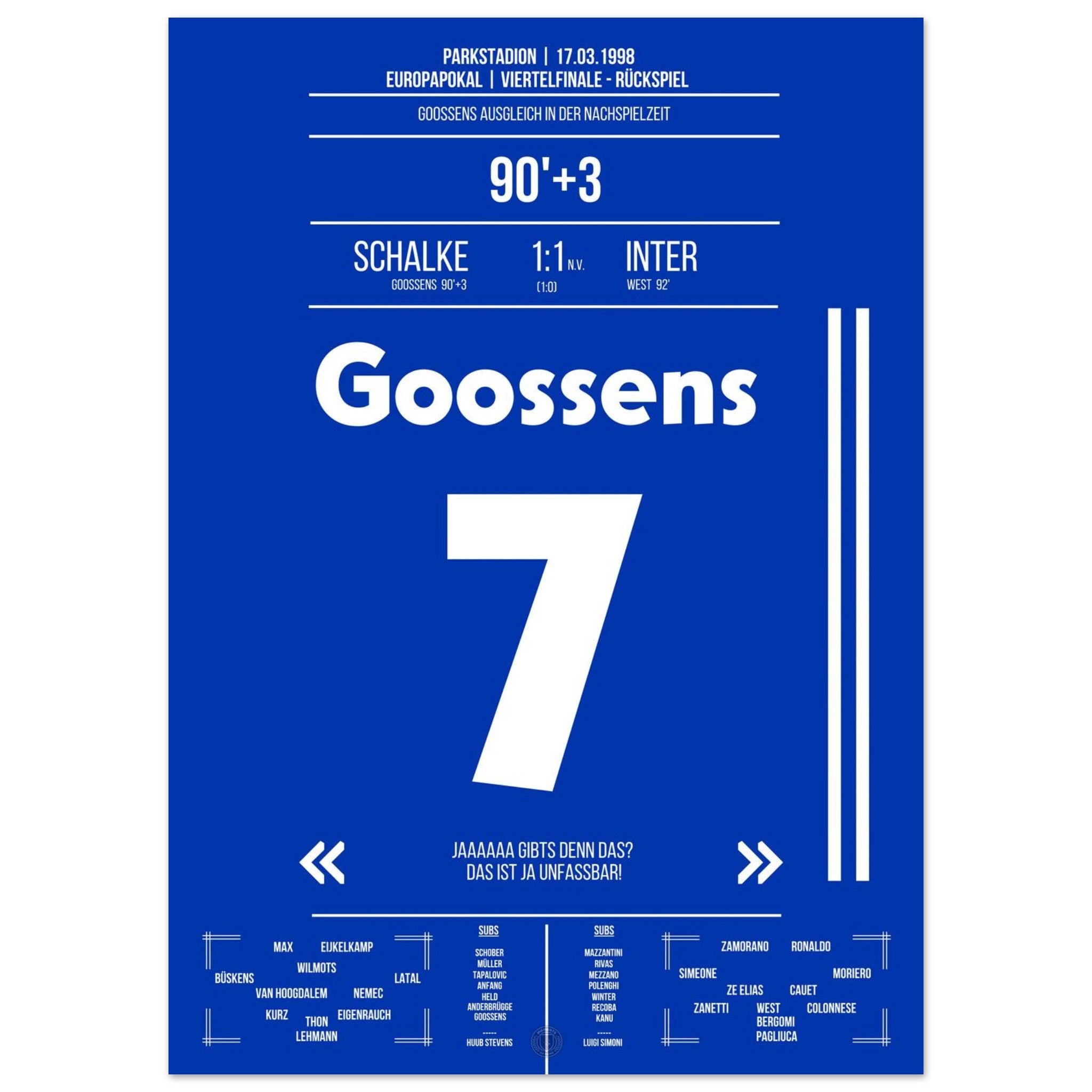 17. März 1998 – Schalke vs. Inter 1:0: Goossens bringt Schalke dramatisch gegen Inter in die Verlängerung im Europapokal-Viertelfinale. Unser Poster verewigt diesen legendären Moment in Königsblau.