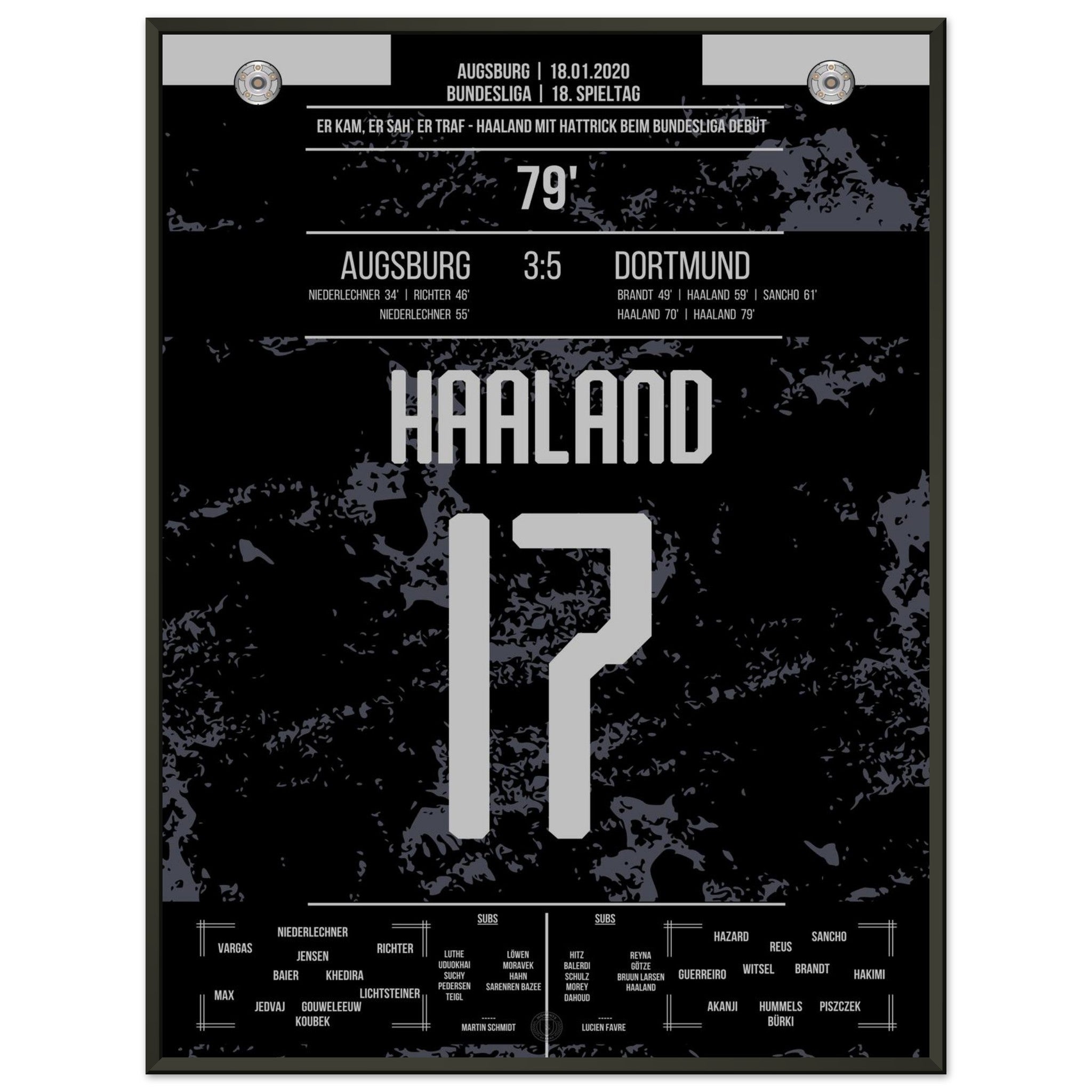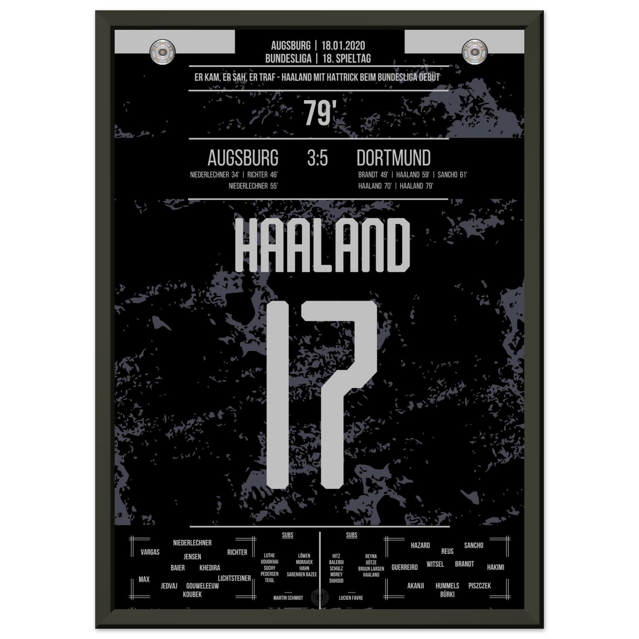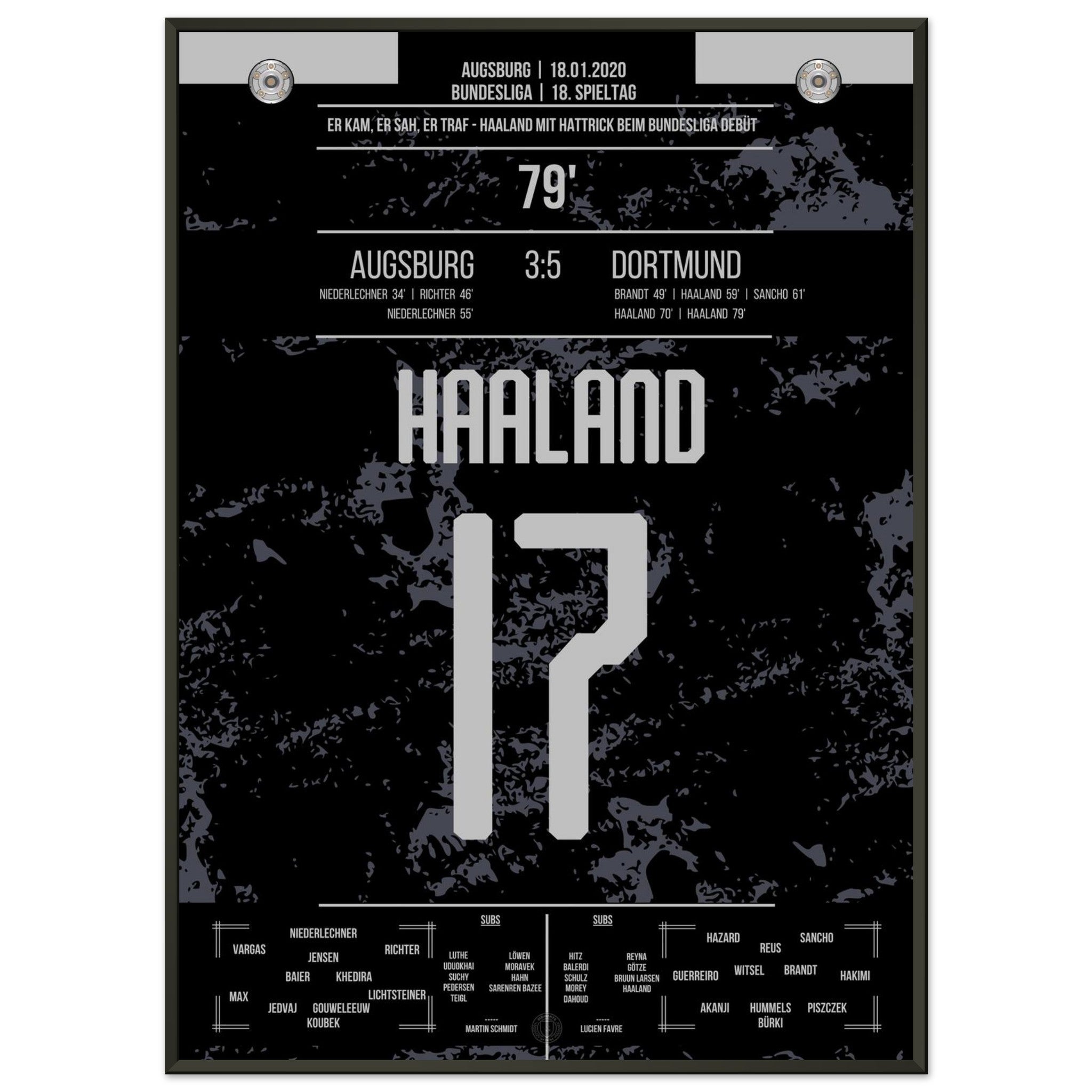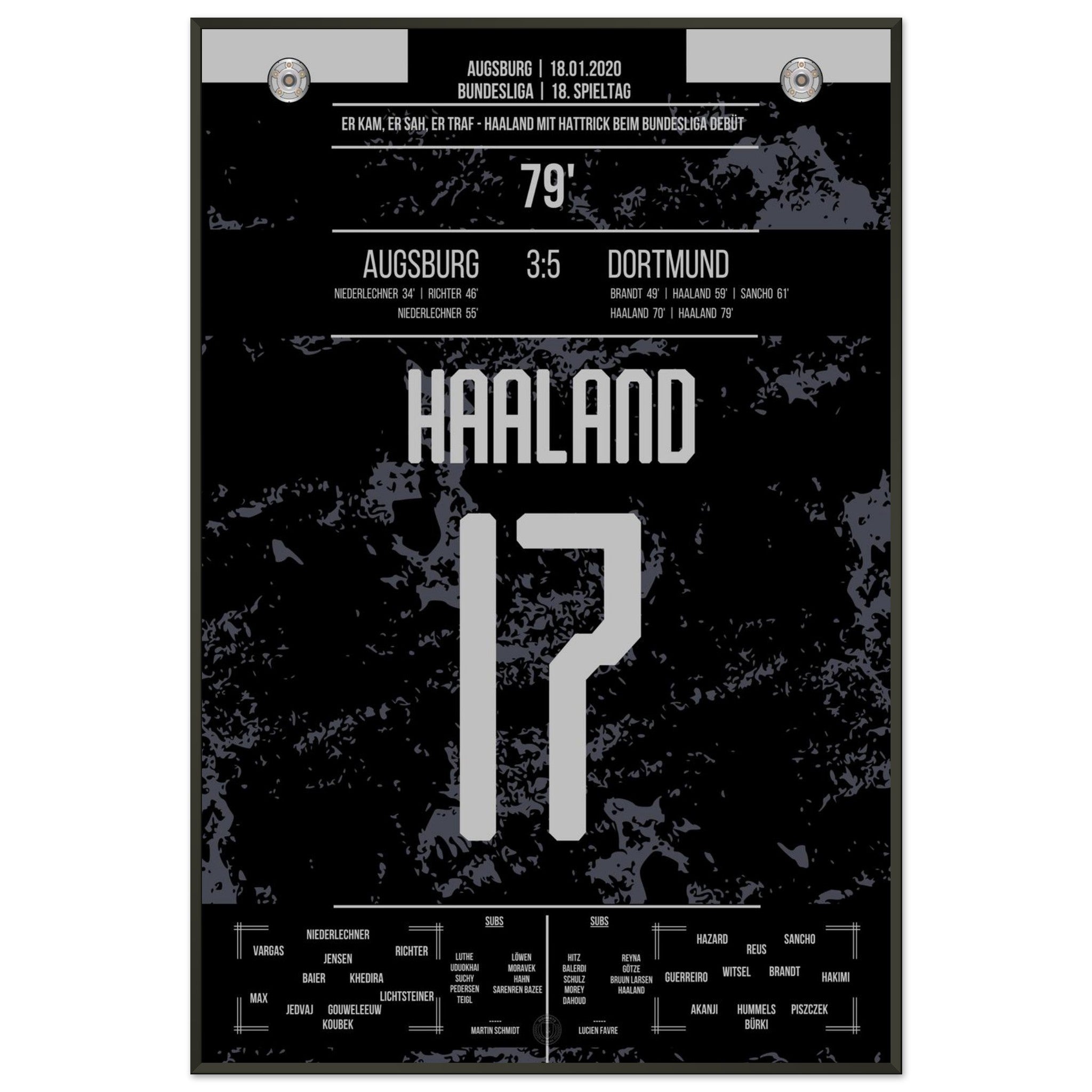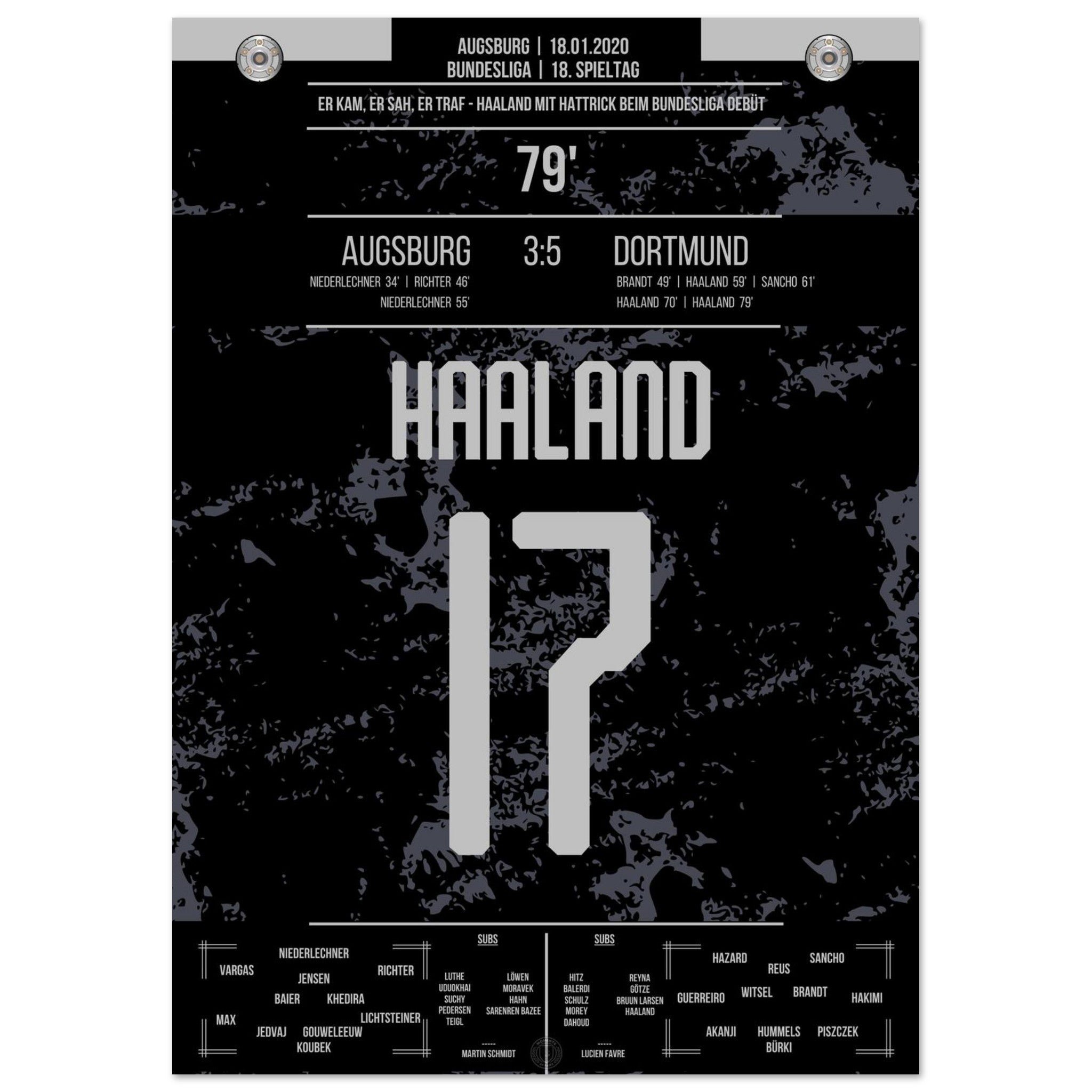 18. Januar 2020 – Augsburg vs. Dortmund 3:5: Erling Haaland betritt die Bundesliga-Bühne – und explodiert. In nur 23 Minuten erzielt der Norweger einen Hattrick nach Einwechslung und dreht das Spiel im Alleingang. Ein Debüt für die Geschichtsbücher. Unser Poster verewigt diesen brachialen Bundesliga-Start für die Ewigkeit.