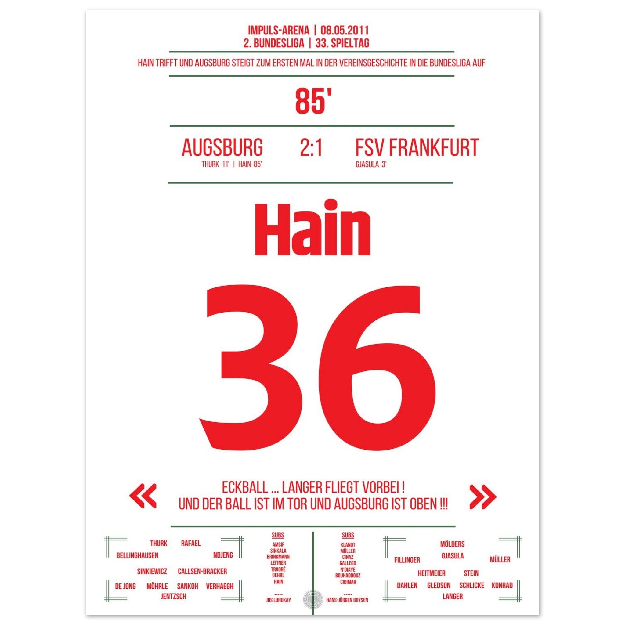 In der 85. Minute trifft Hain und schreibt damit Geschichte. Augsburg feiert den ersten Aufstieg in die Bundesliga – die Arena steht Kopf!