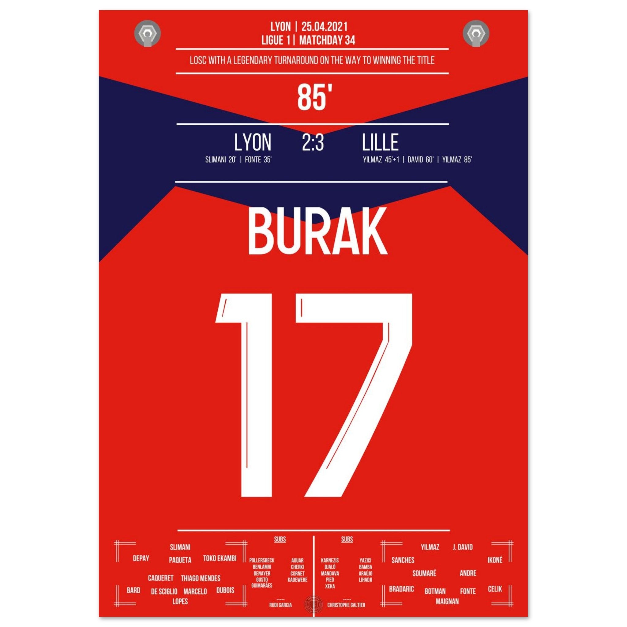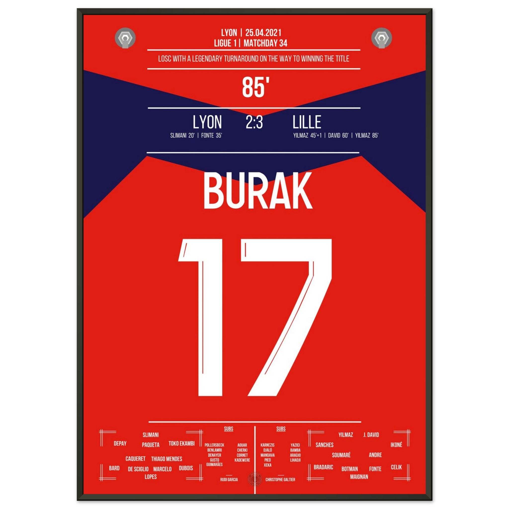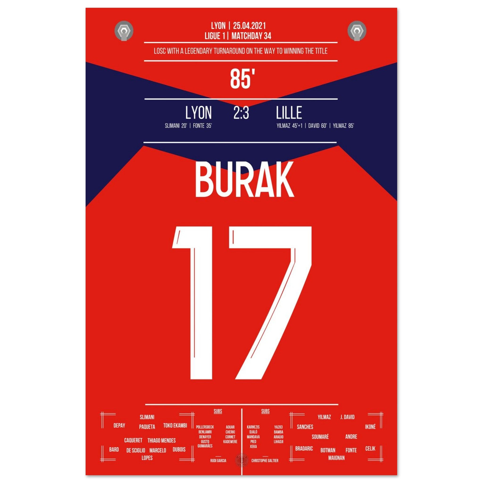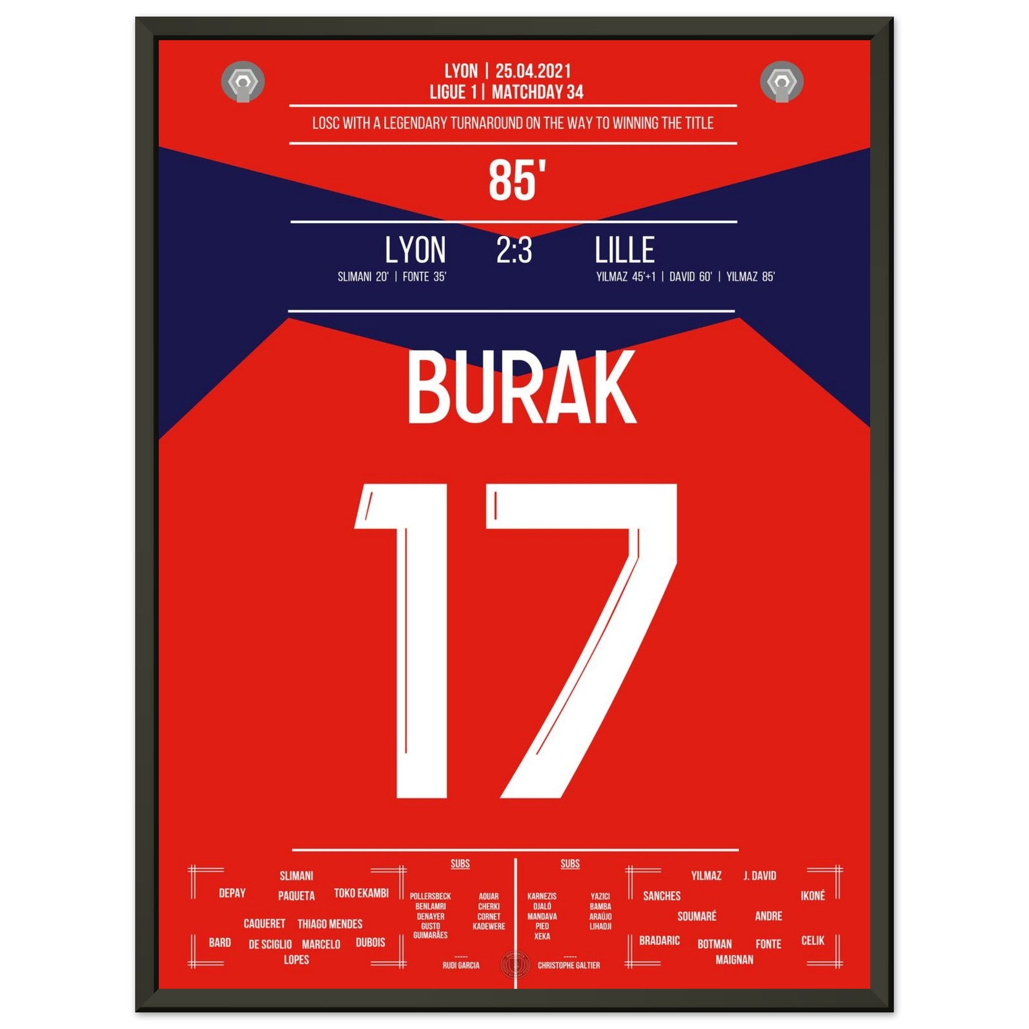 25. April 2021 – Lyon vs. Lille 2:3: In einem wilden Topspiel bringt Burak Yılmaz Lille zurück ins Titelrennen. Mit einem Doppelpack und unbändigem Willen dreht der türkische Torjäger das Spiel fast im Alleingang. Sein legendärer Freistoß – pure Entschlossenheit. Ein Poster für echte Meister-Momente.