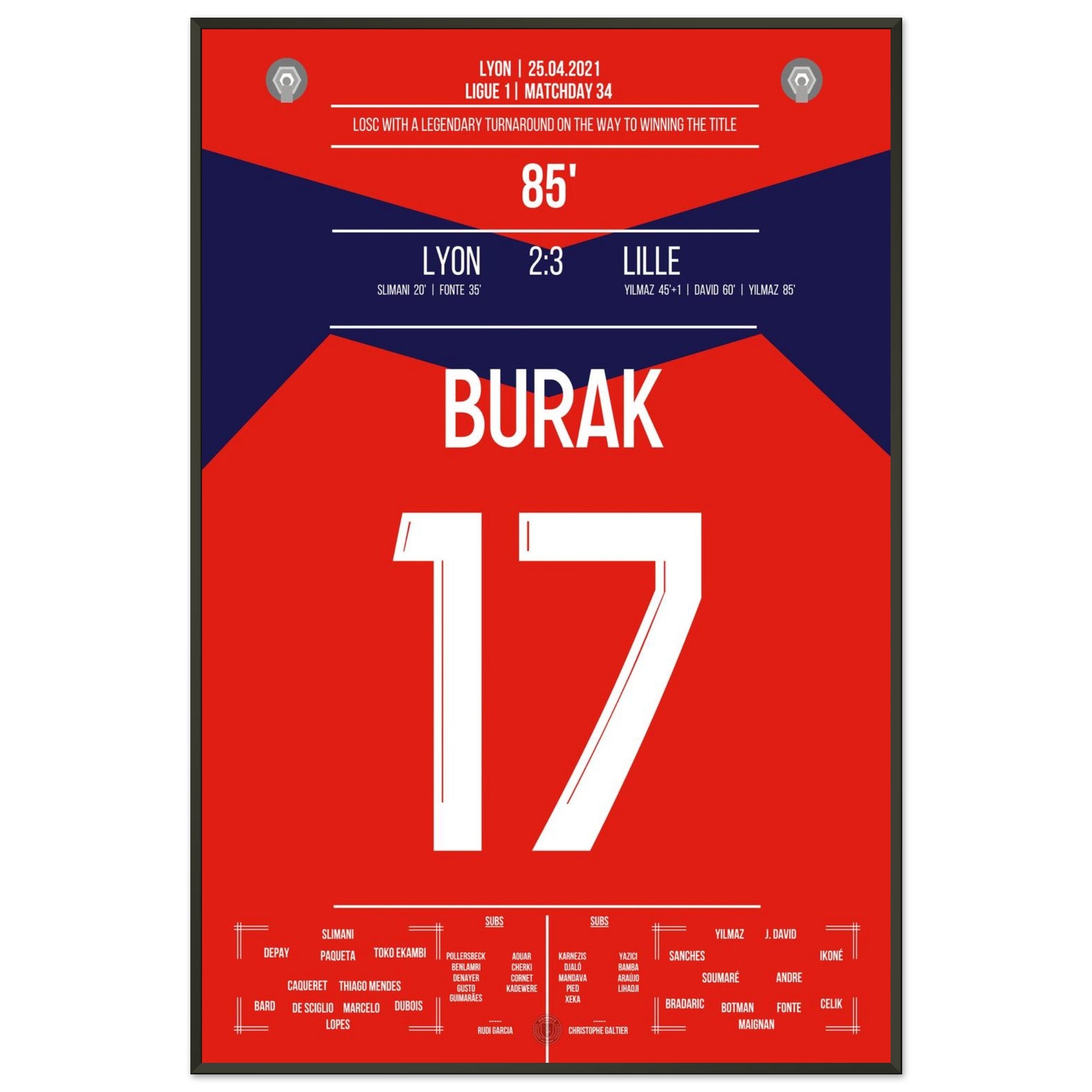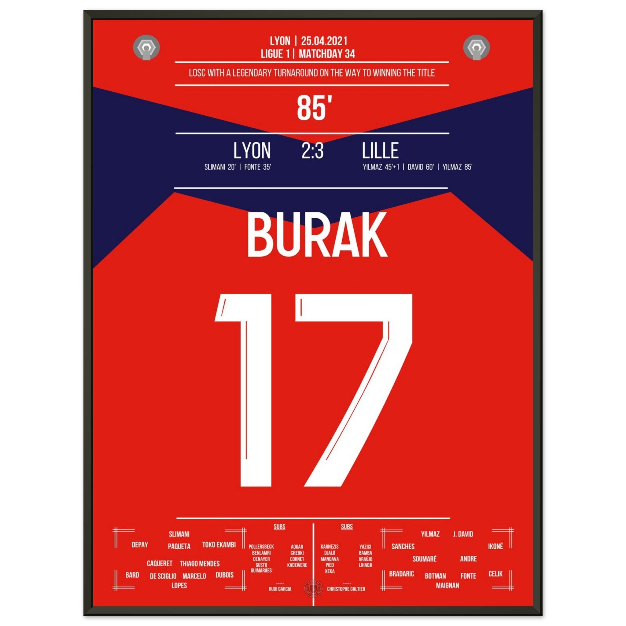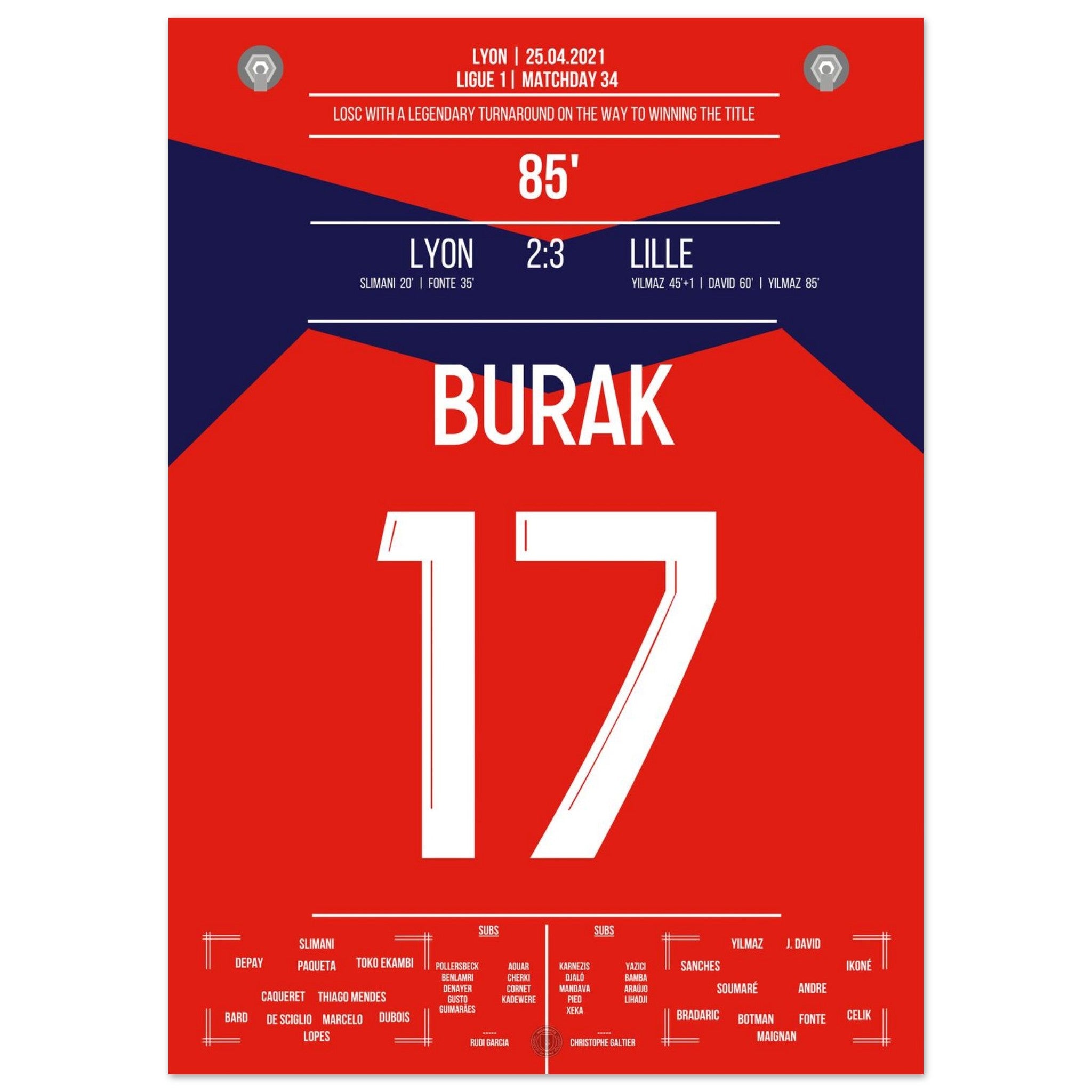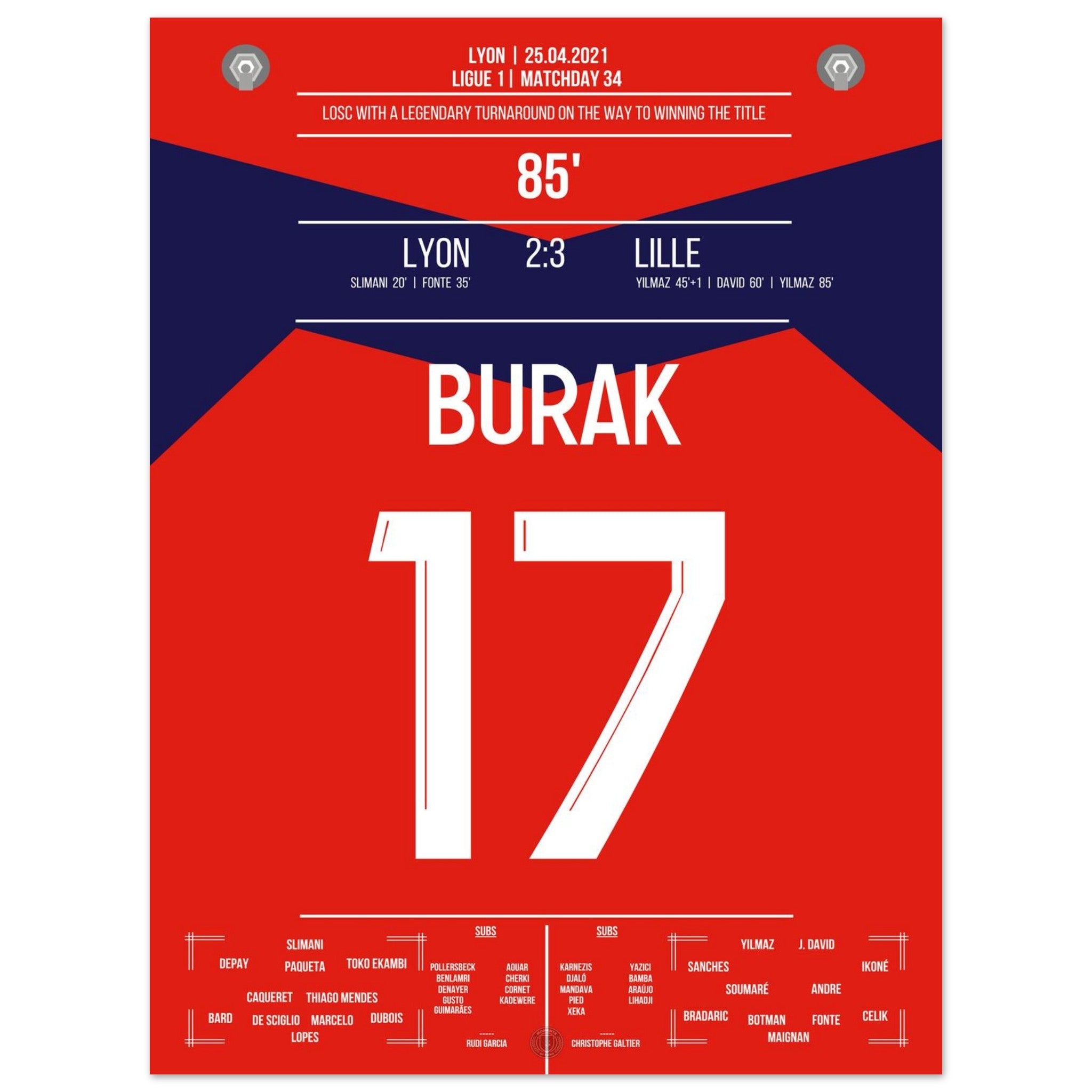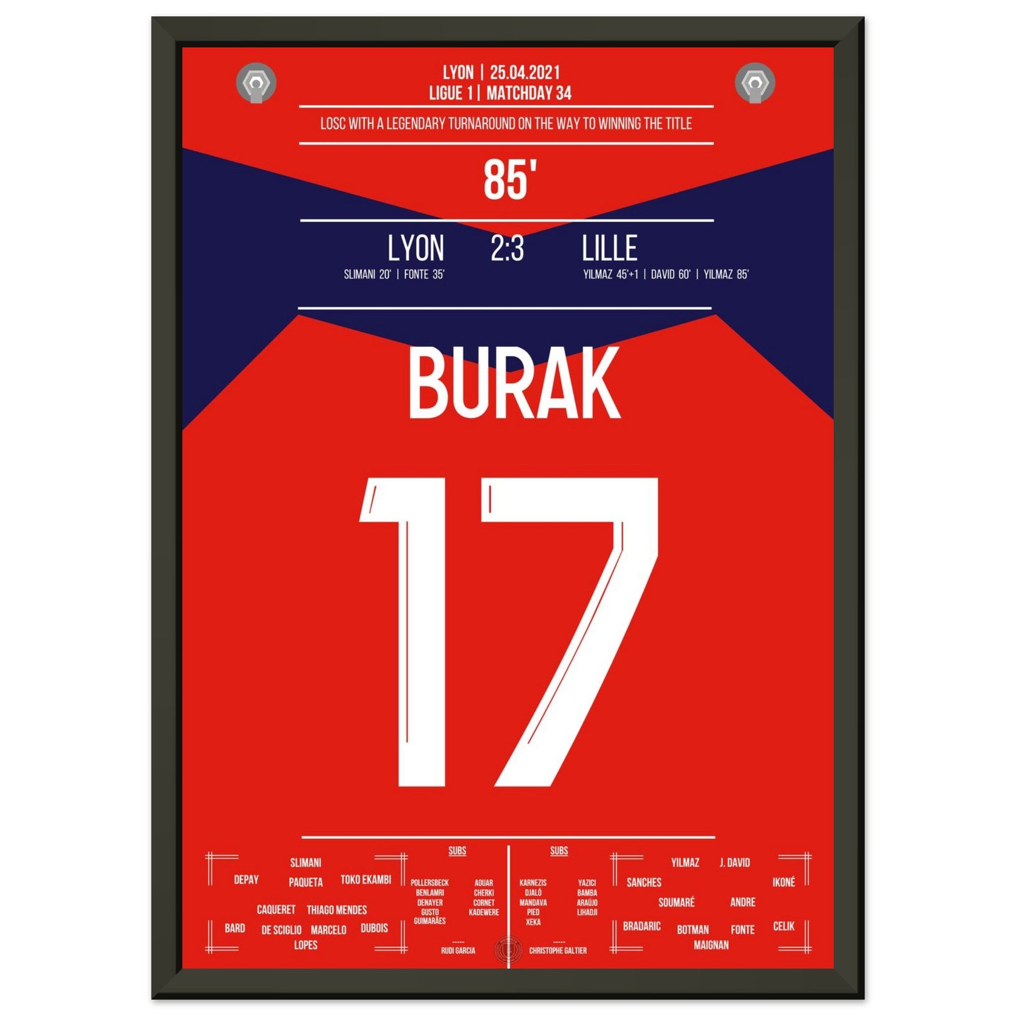 25. April 2021 – Lyon vs. Lille 2:3: In einem wilden Topspiel bringt Burak Yılmaz Lille zurück ins Titelrennen. Mit einem Doppelpack und unbändigem Willen dreht der türkische Torjäger das Spiel fast im Alleingang. Sein legendärer Freistoß – pure Entschlossenheit. Ein Poster für echte Meister-Momente.