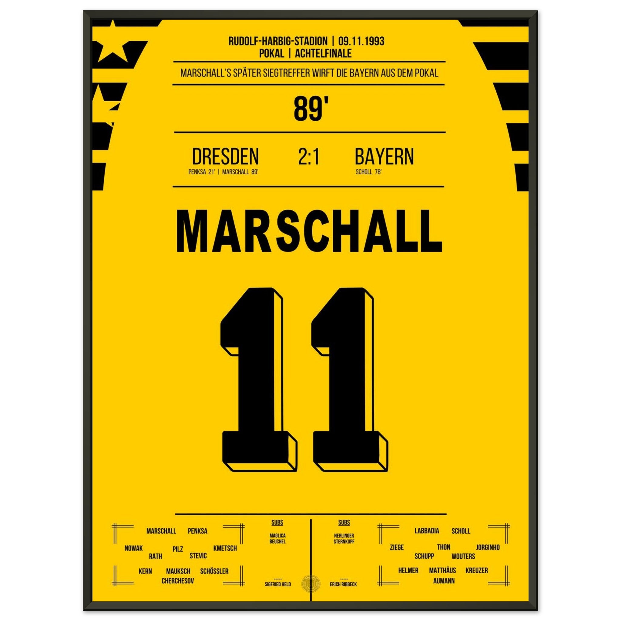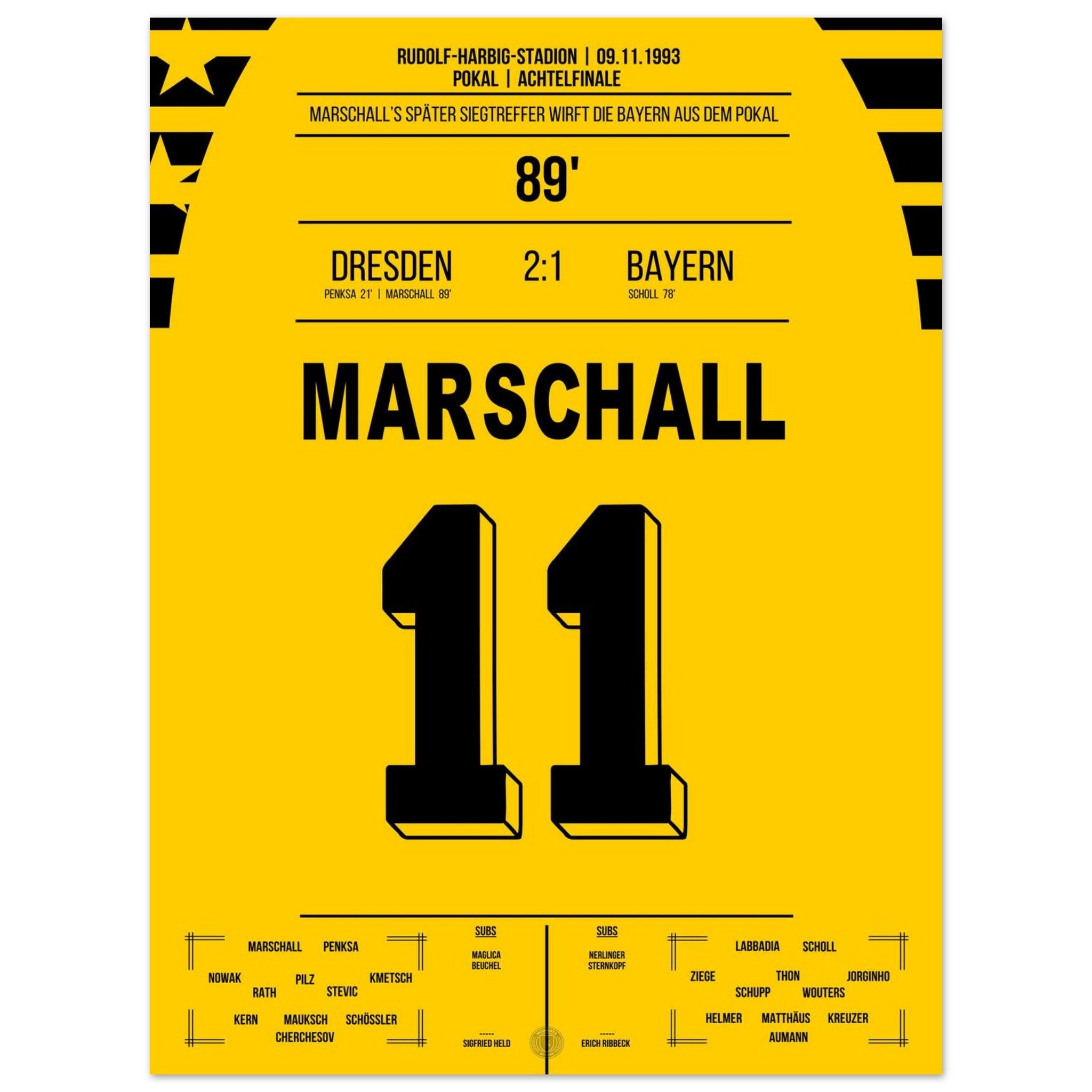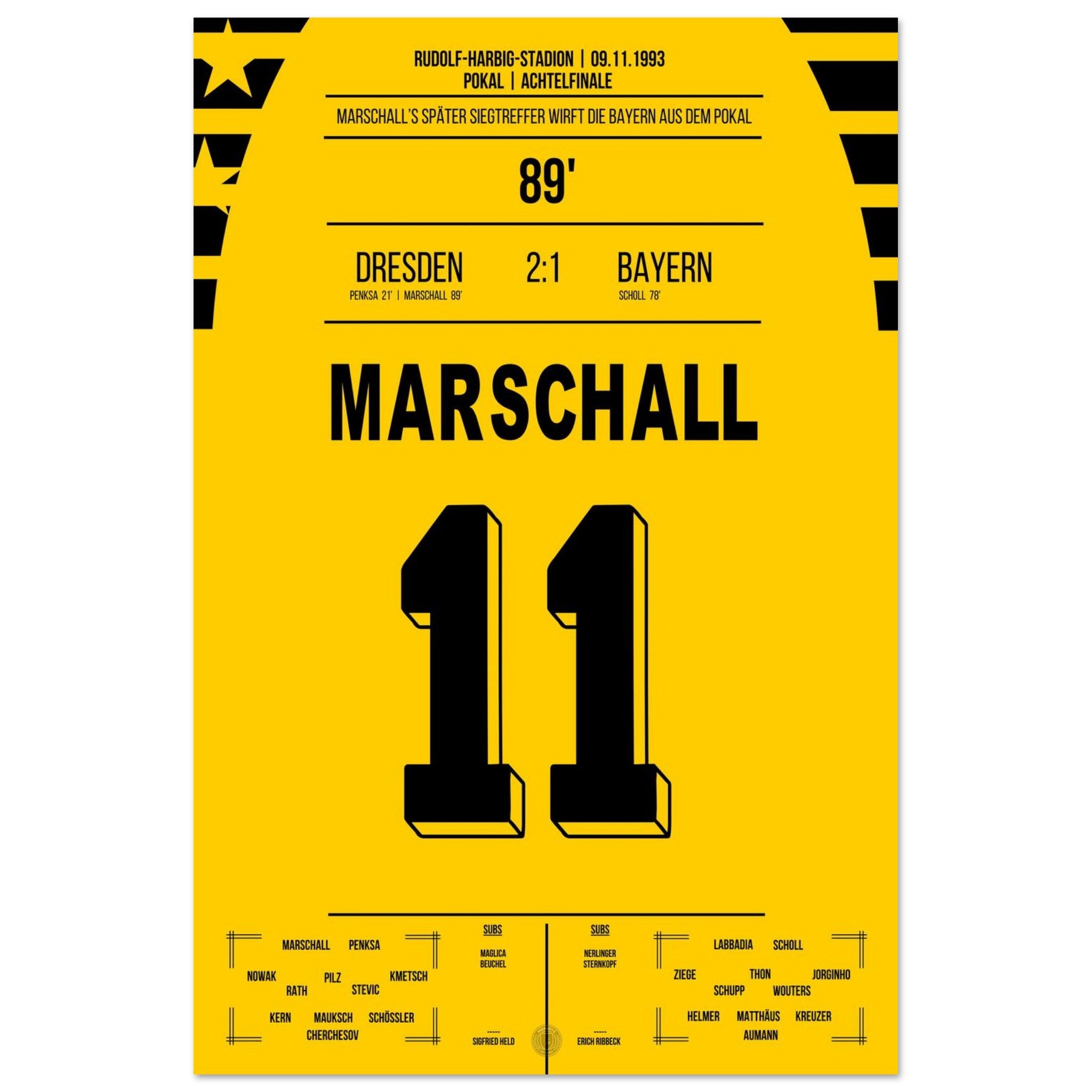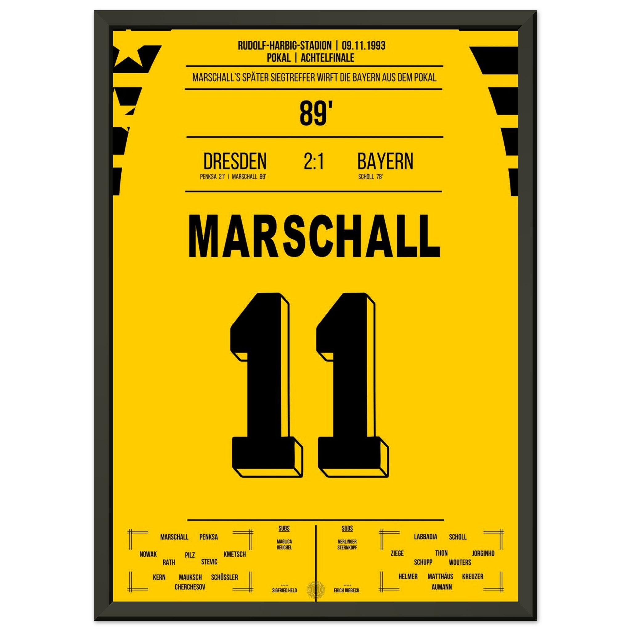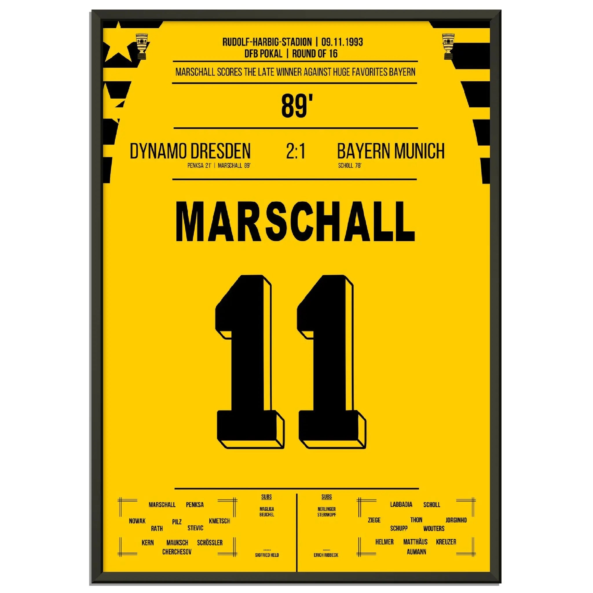 1. Dezember 1993 – Dresden vs. Bayern 2:1: Im Pokal-Achtelfinale trifft Olaf Marschall gegen den Favoriten aus München und bringt den Dresden auf die Siegerstraße. Es ist einer der größten Pokalmomente der Vereinsgeschichte und ein Schritt Richtung Halbfinale. Unser Poster fängt diesen historischen Treffer eindrucksvoll ein.