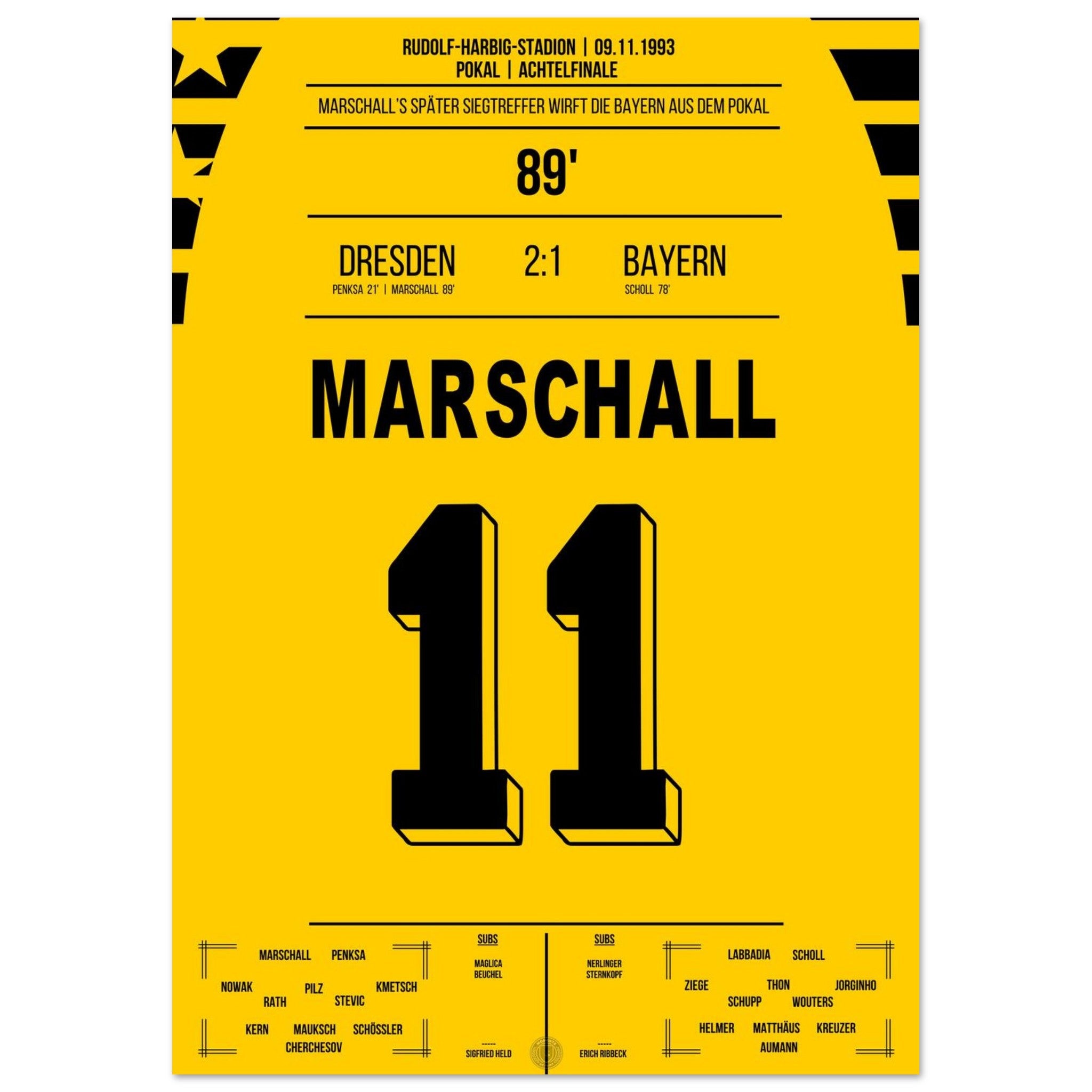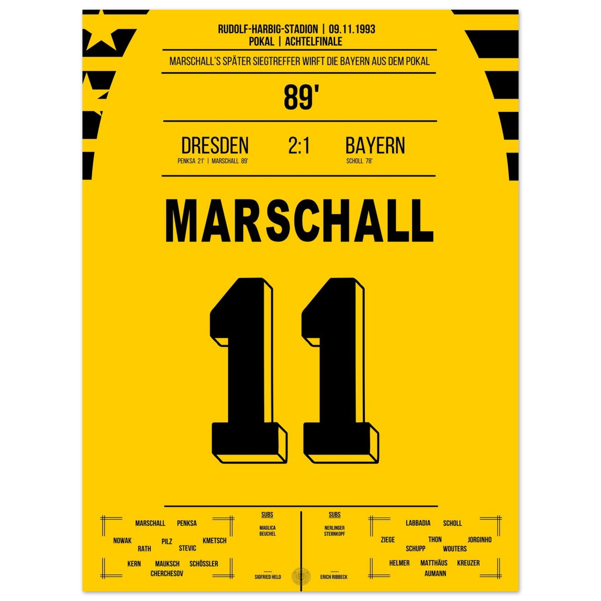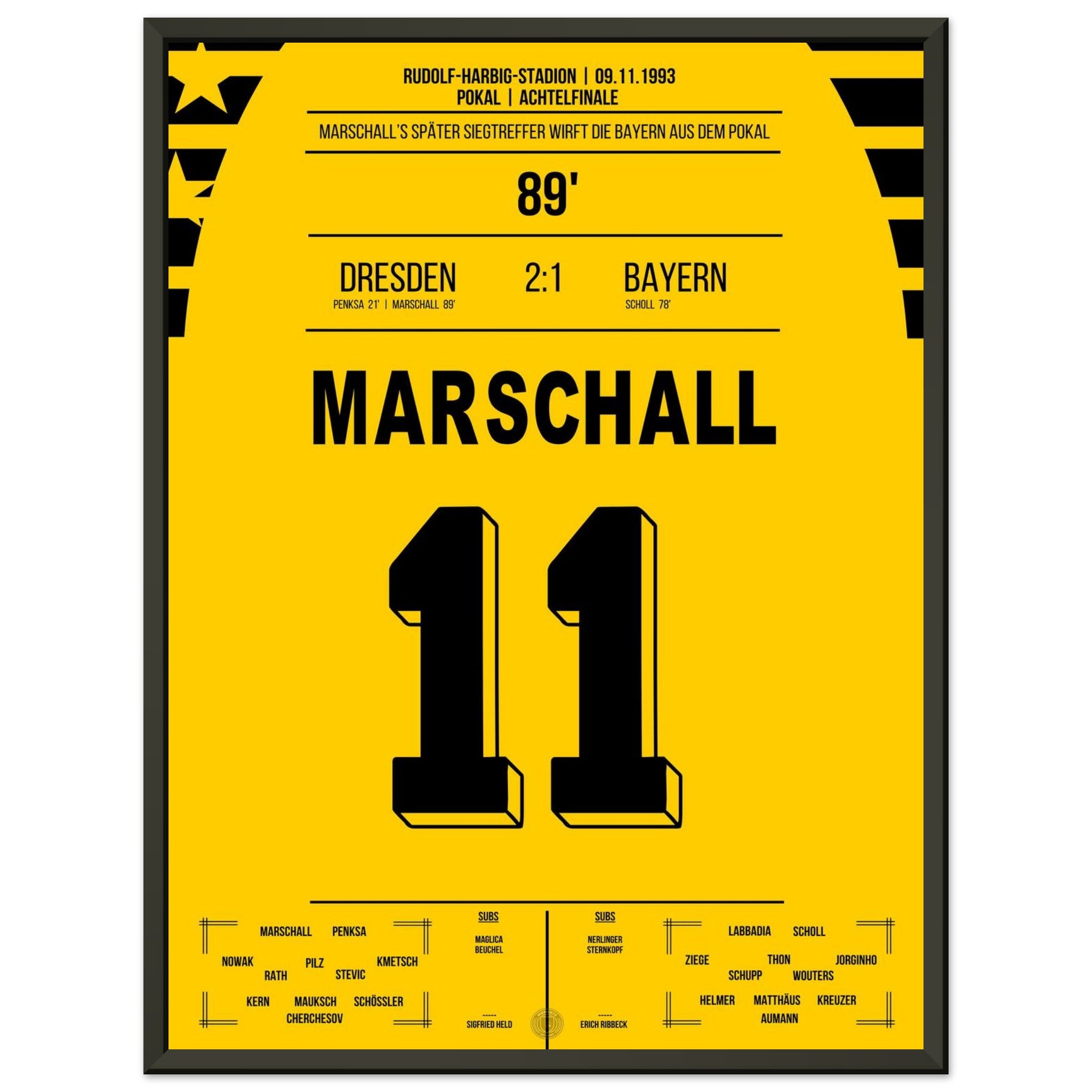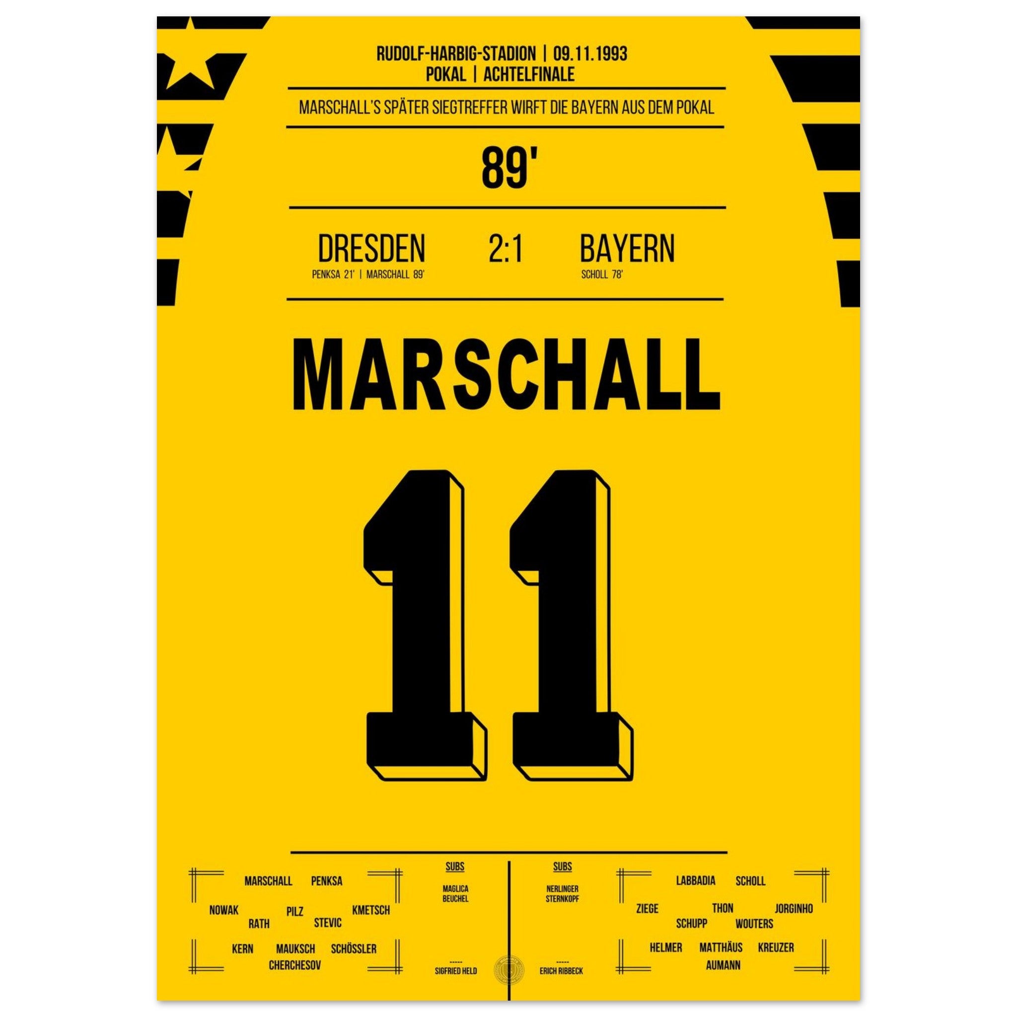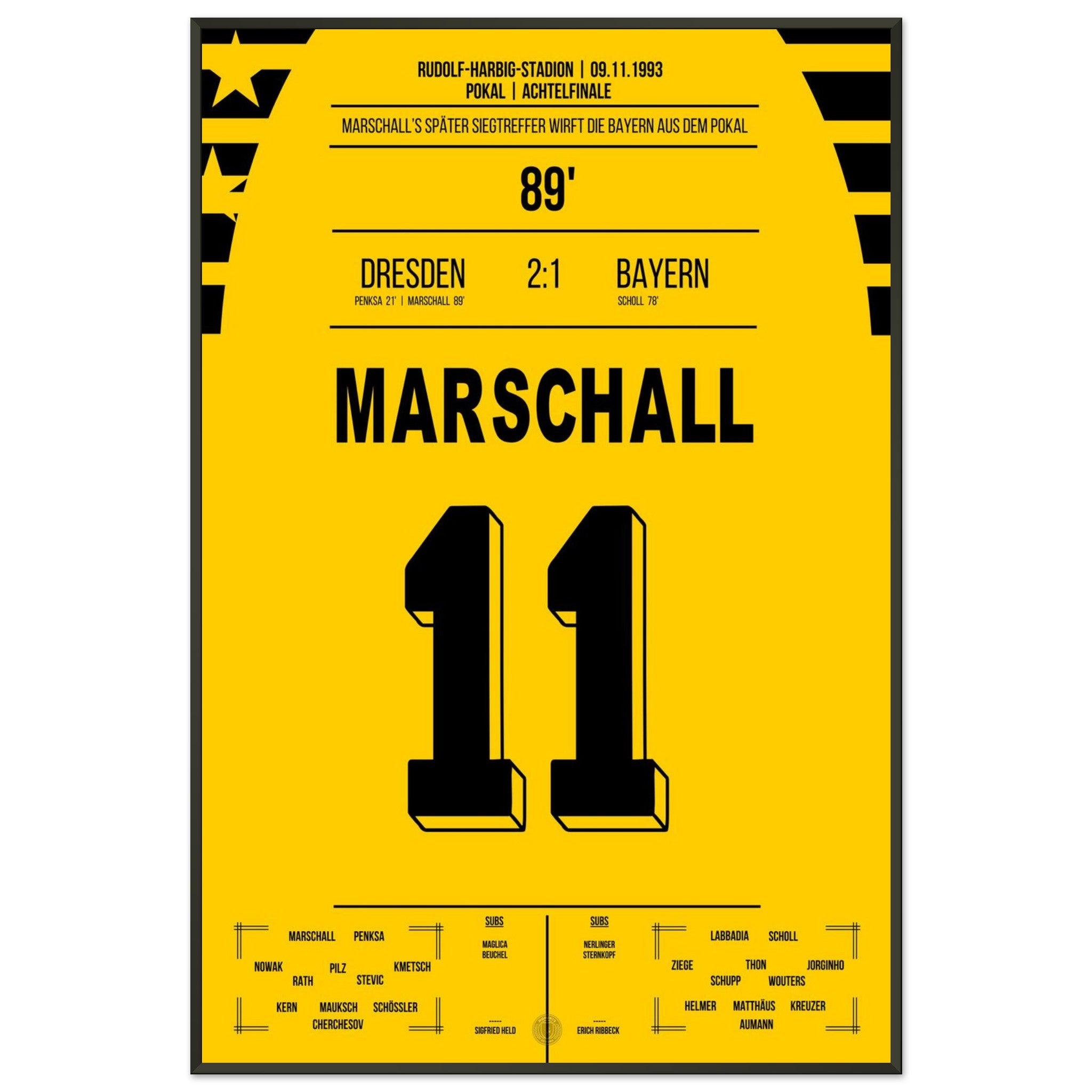 1. Dezember 1993 – Dresden vs. Bayern 2:1: Im Pokal-Achtelfinale trifft Olaf Marschall gegen den Favoriten aus München und bringt den Dresden auf die Siegerstraße. Es ist einer der größten Pokalmomente der Vereinsgeschichte und ein Schritt Richtung Halbfinale. Unser Poster fängt diesen historischen Treffer eindrucksvoll ein.
