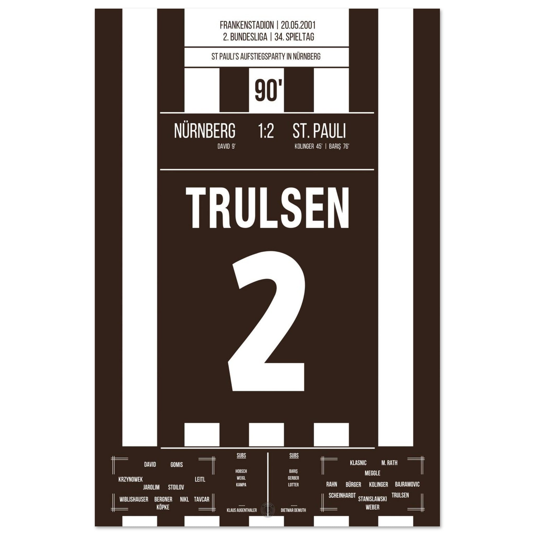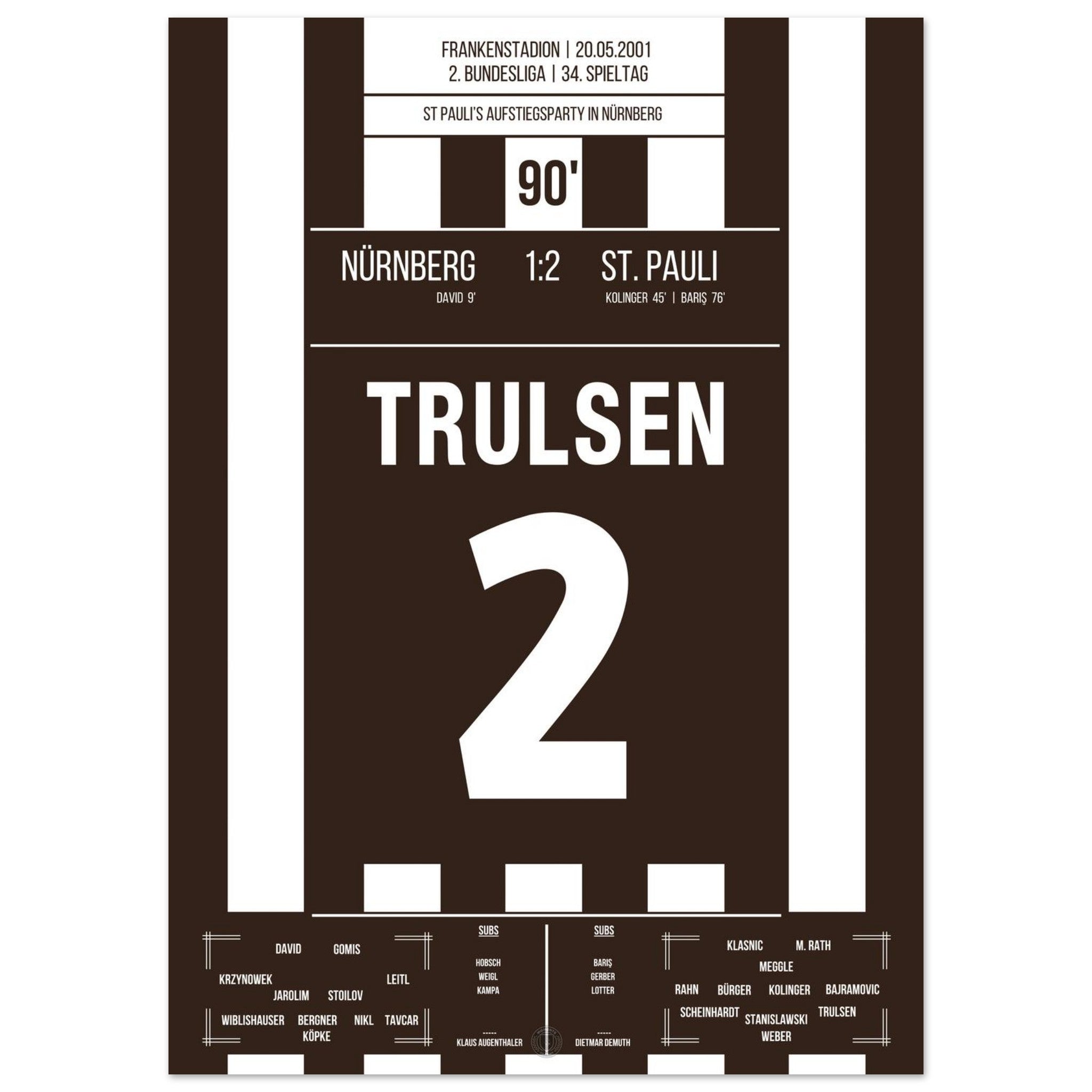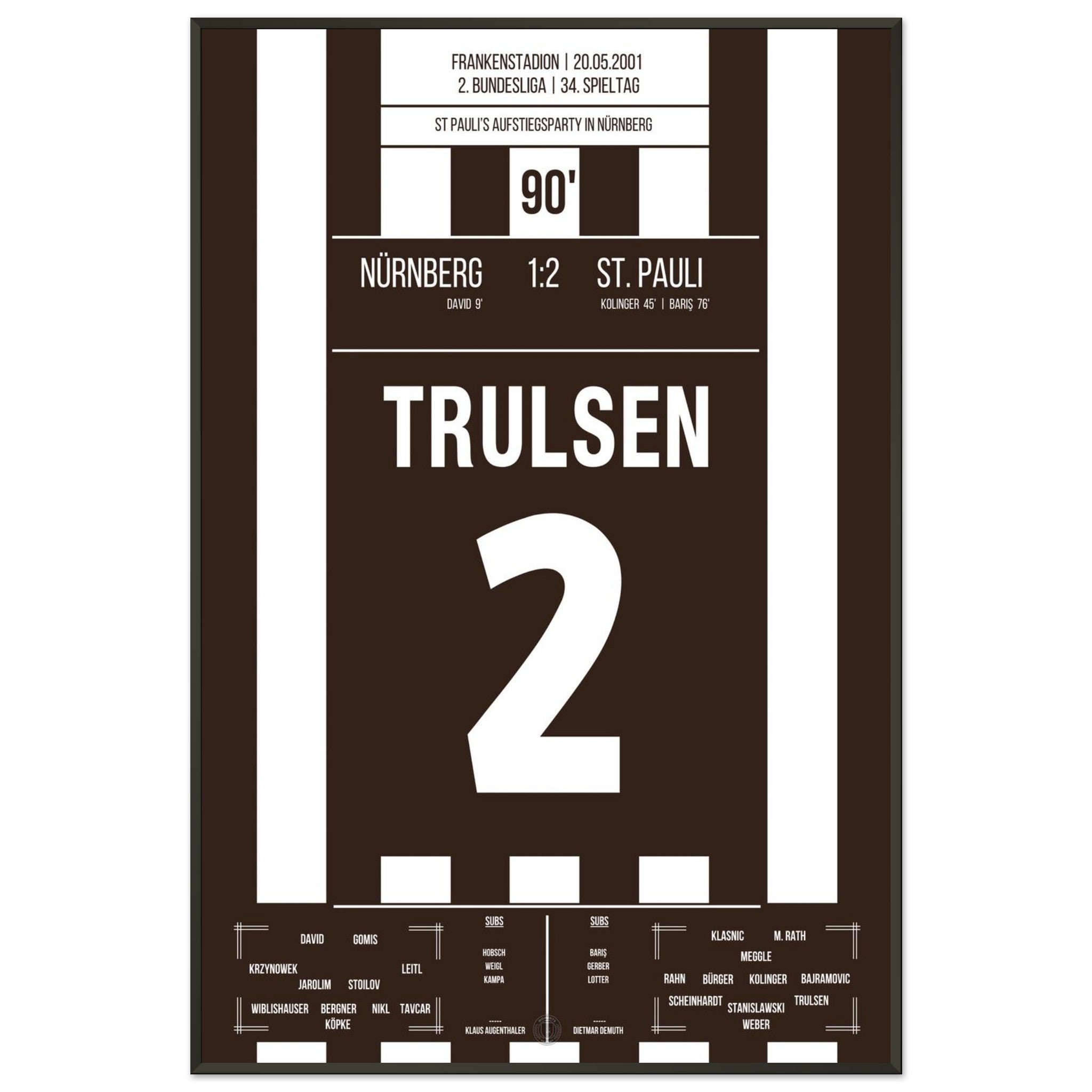 20. Mai 2001 – Nürnberg vs. St. Pauli 1:2: Am letzten Spieltag krönt sich St. Pauli mit einem Auswärtssieg in Nürnberg zum Aufsteiger – Ekstase pur bei den Fans, Rückkehr in die Bundesliga perfekt. Unser Poster hält diesen emotionalen Aufstiegsmoment in Braun-Weiß fest.