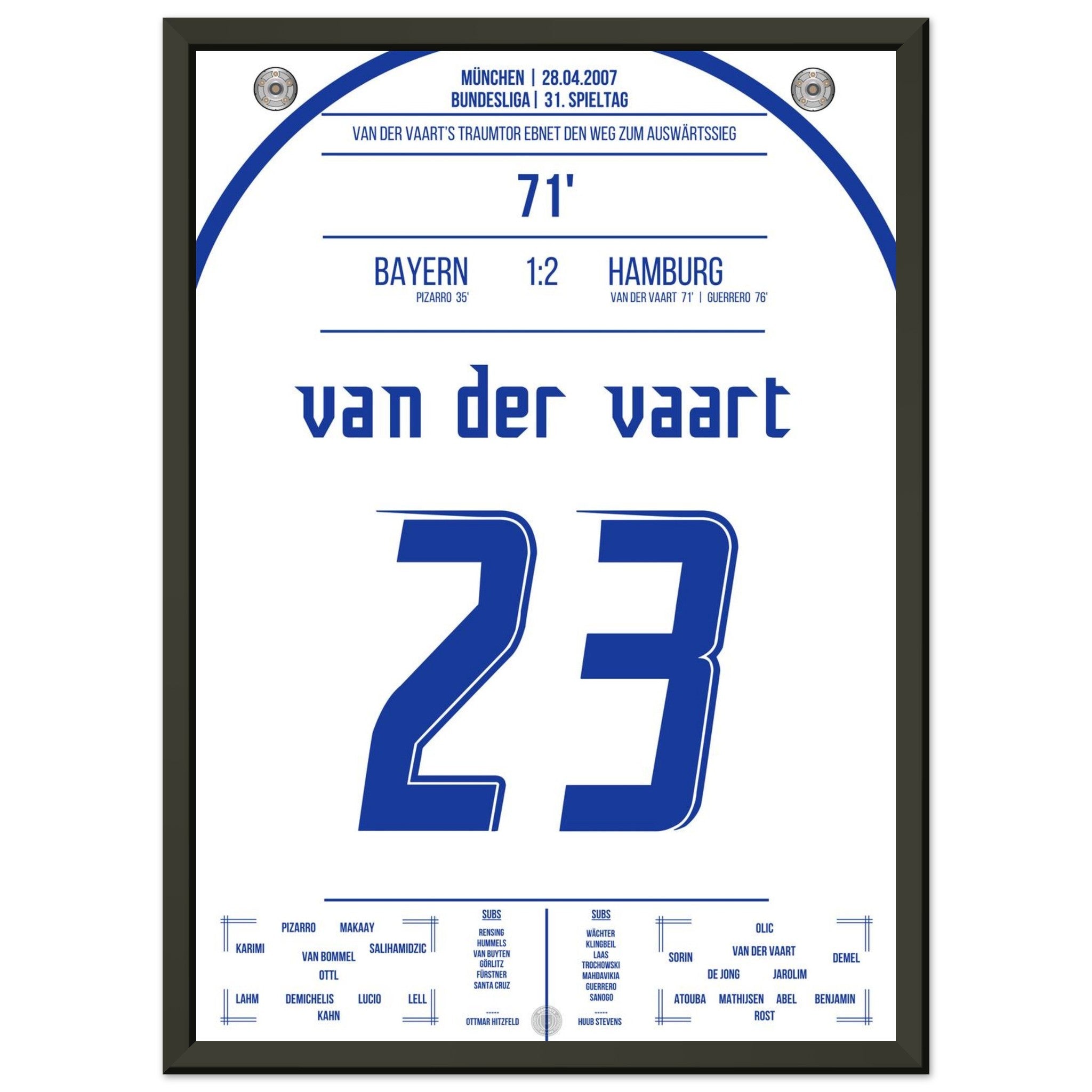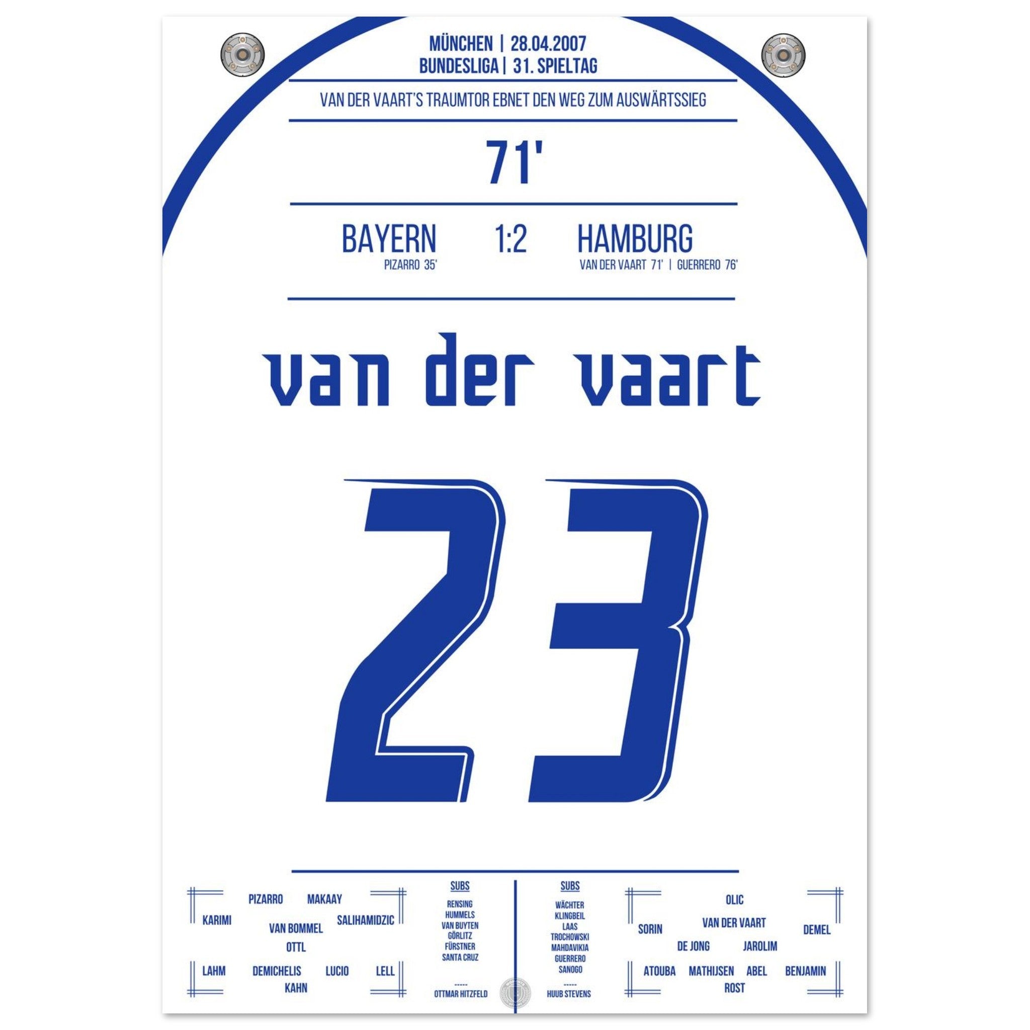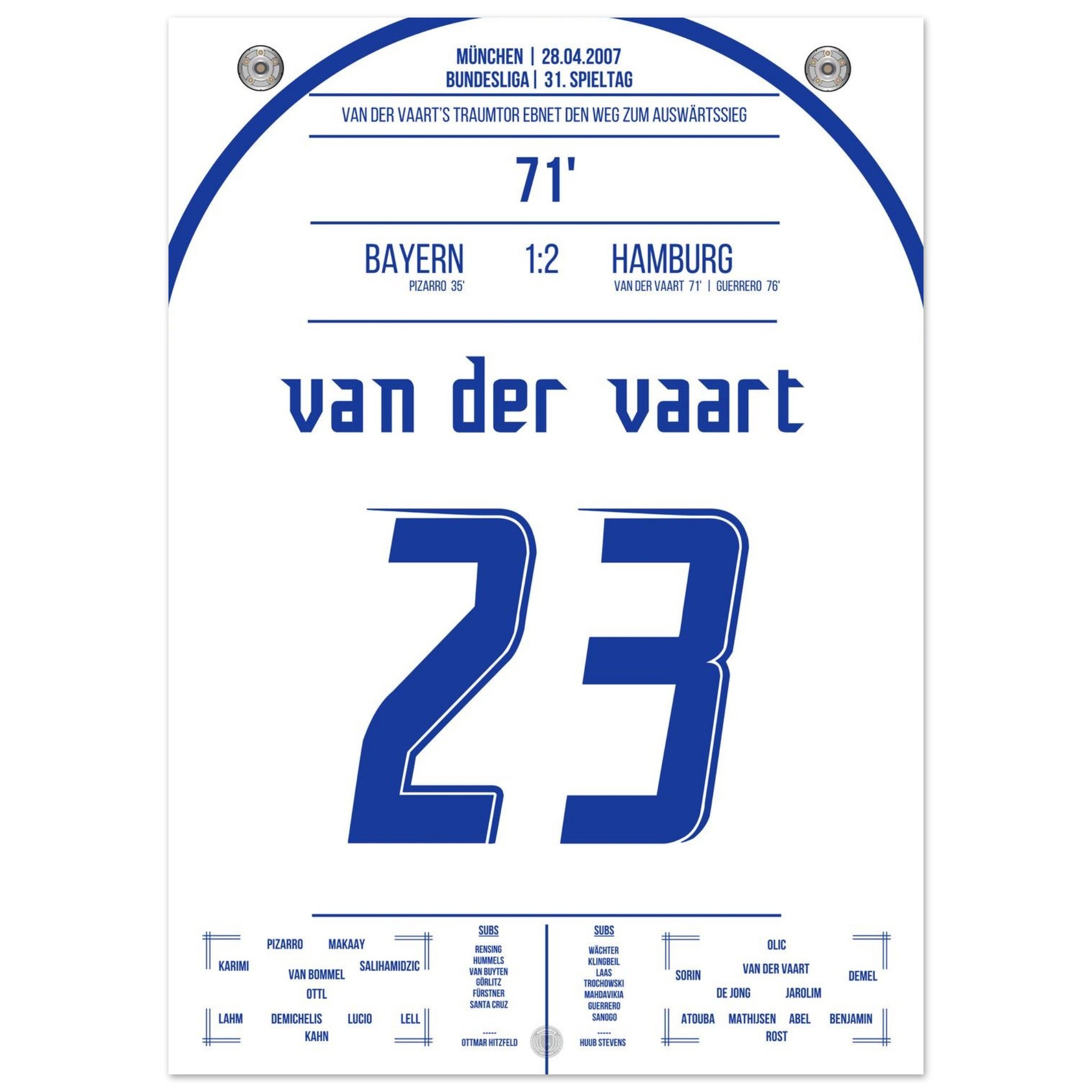 28. April 2007 – Bayern vs. Hamburg 1:2: Rafael van der Vaart schießt Hamburg mit einem traumhaften Freistoß in der 90. Minute zum Auswärtssieg in München. Ein magischer Moment für alle Rothosen – unser Poster bringt diese Sternstunde zurück auf die Wand.