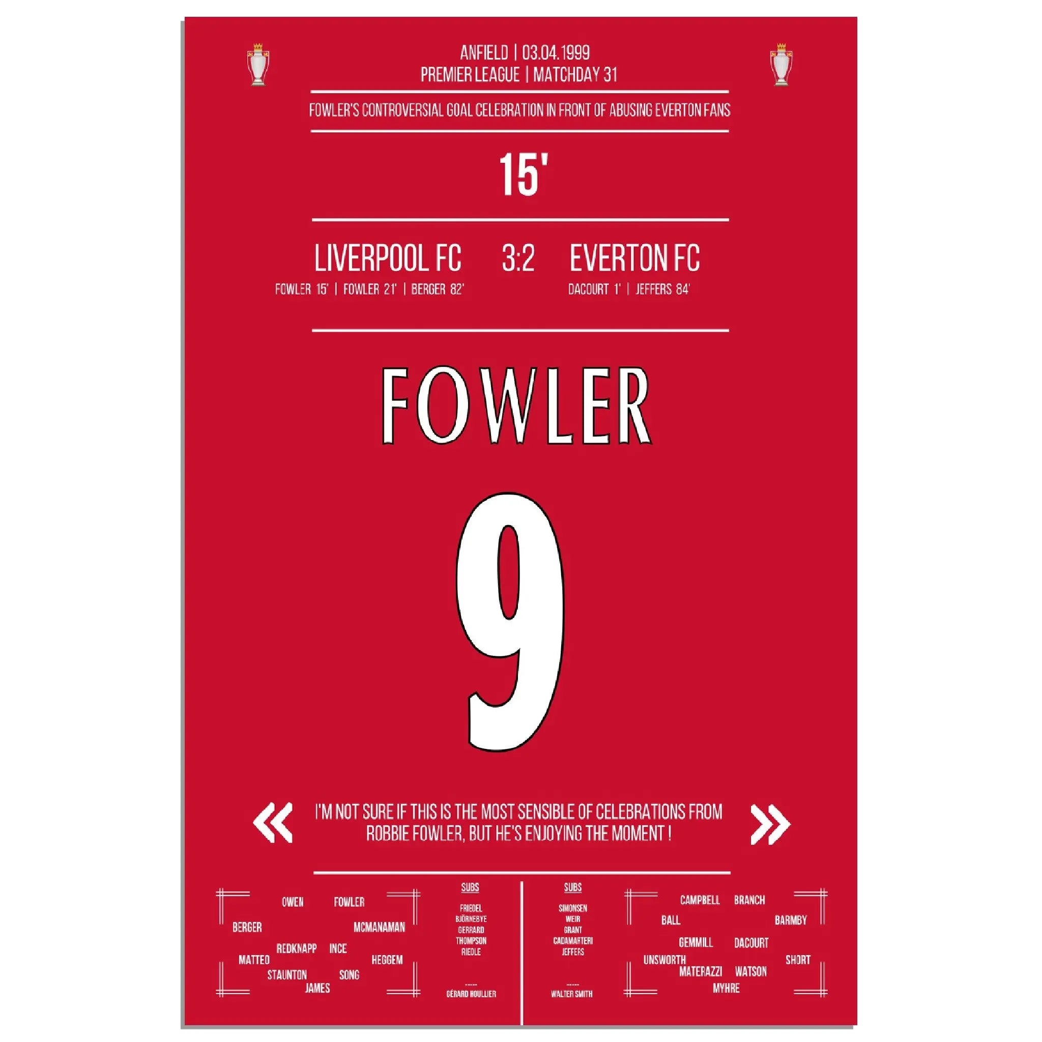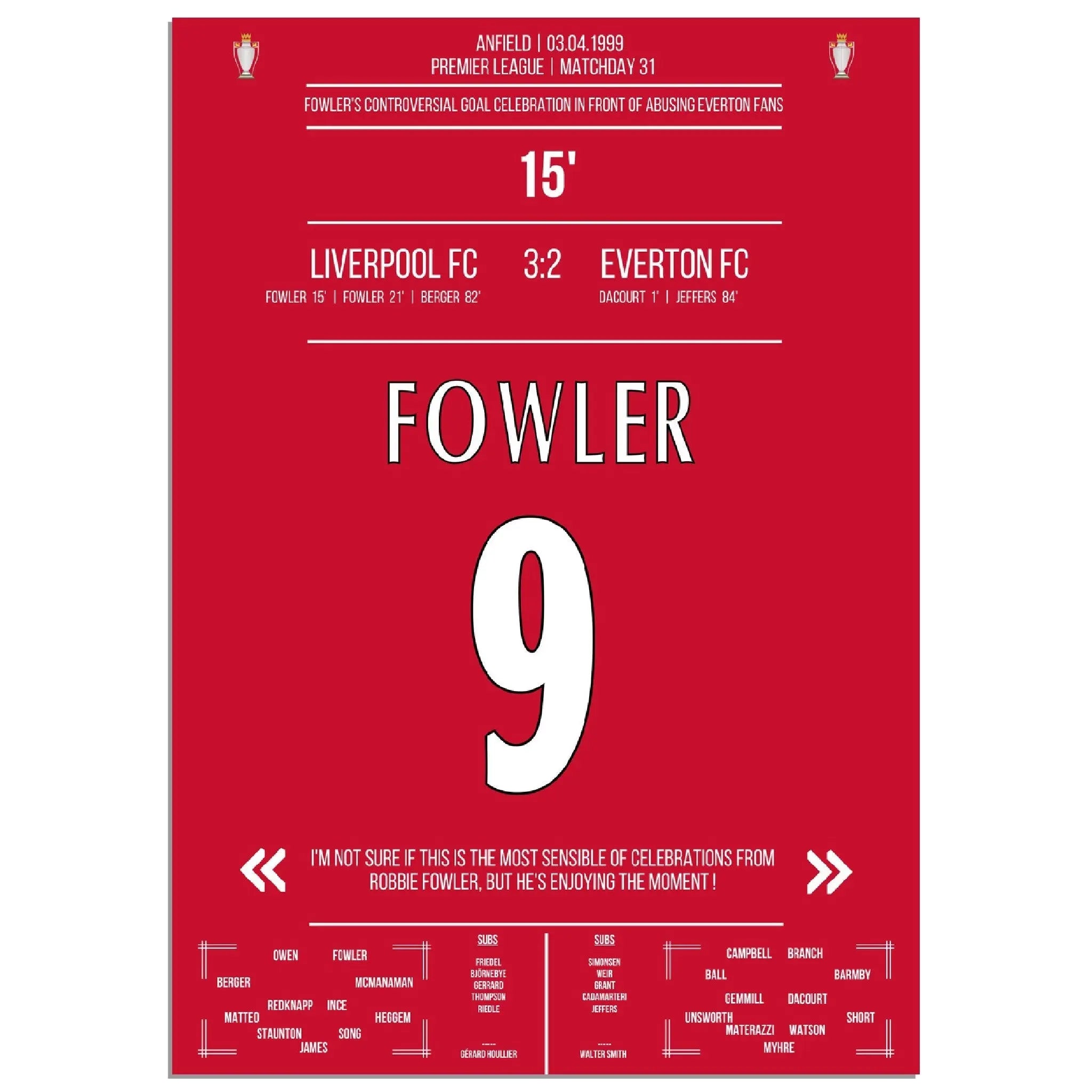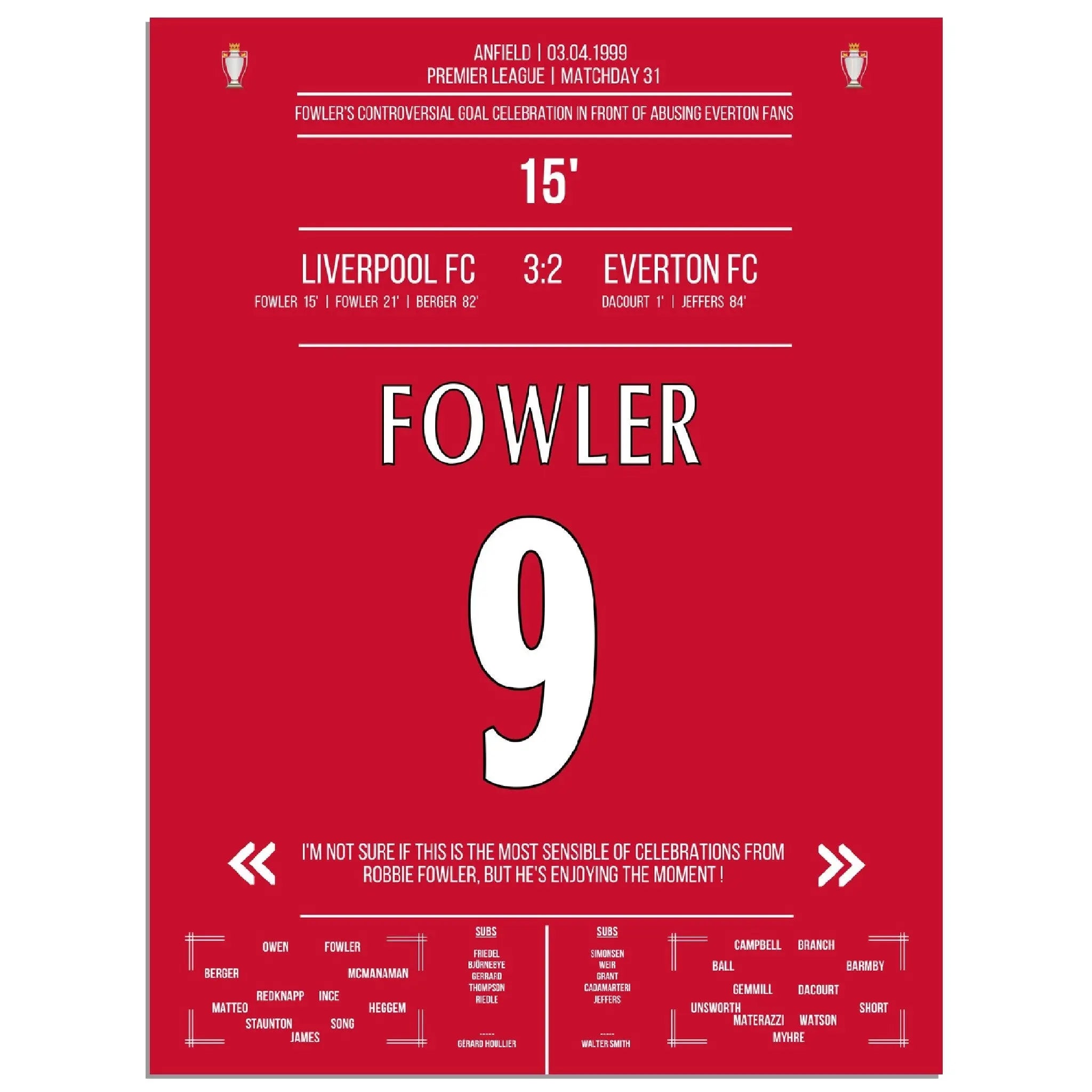 Fowler's celebración de gol excepcional Liverpool - Everton 1999 Premier League Merseyside Derby