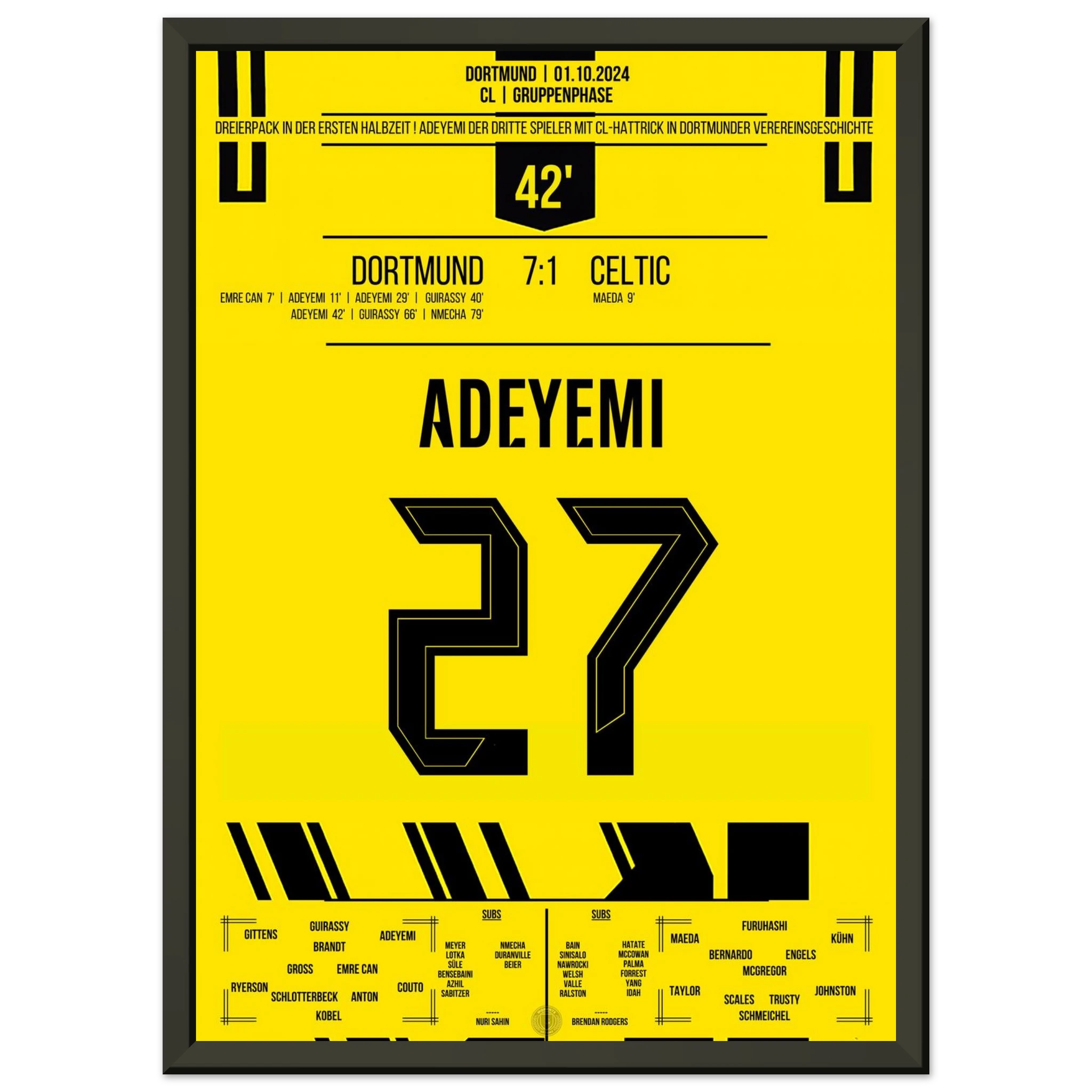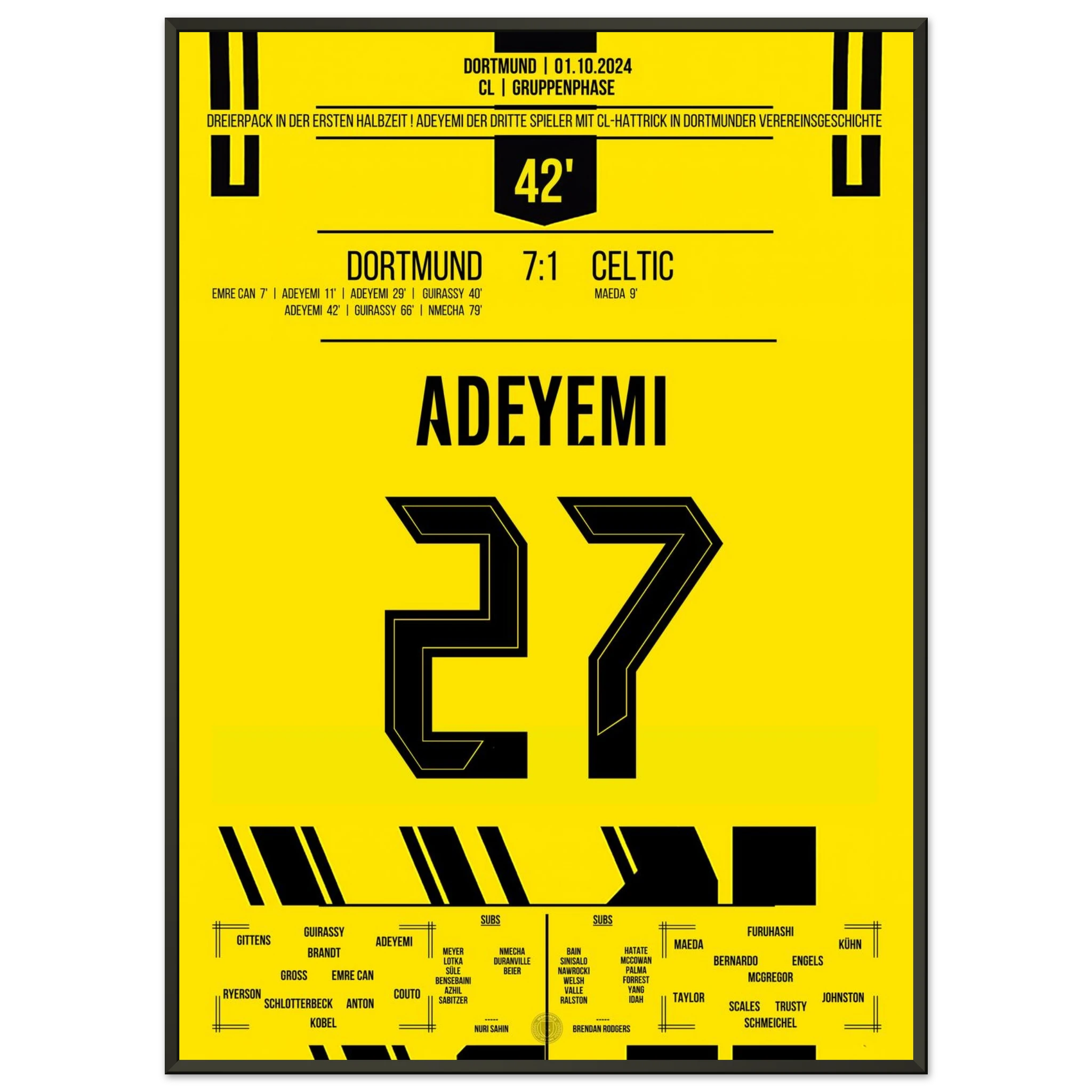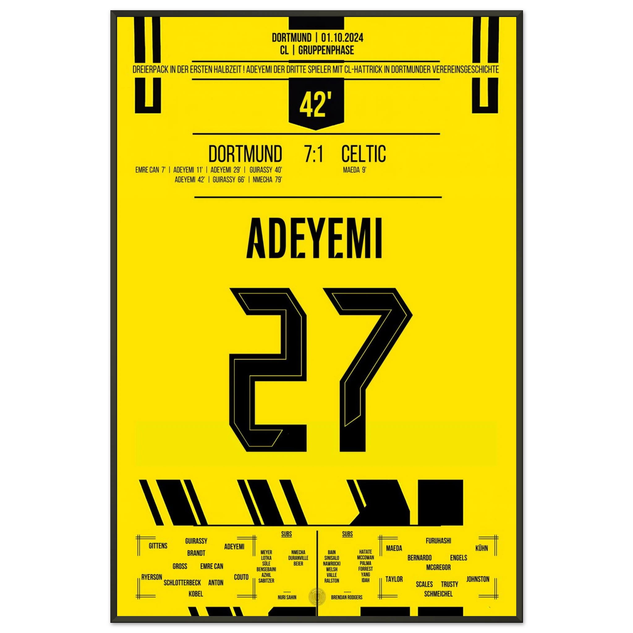 Unser Poster feiert Adeyemis magische Nacht – pure Explosivität in Schwarz und Gelb, festgehalten für die Ewigkeit.