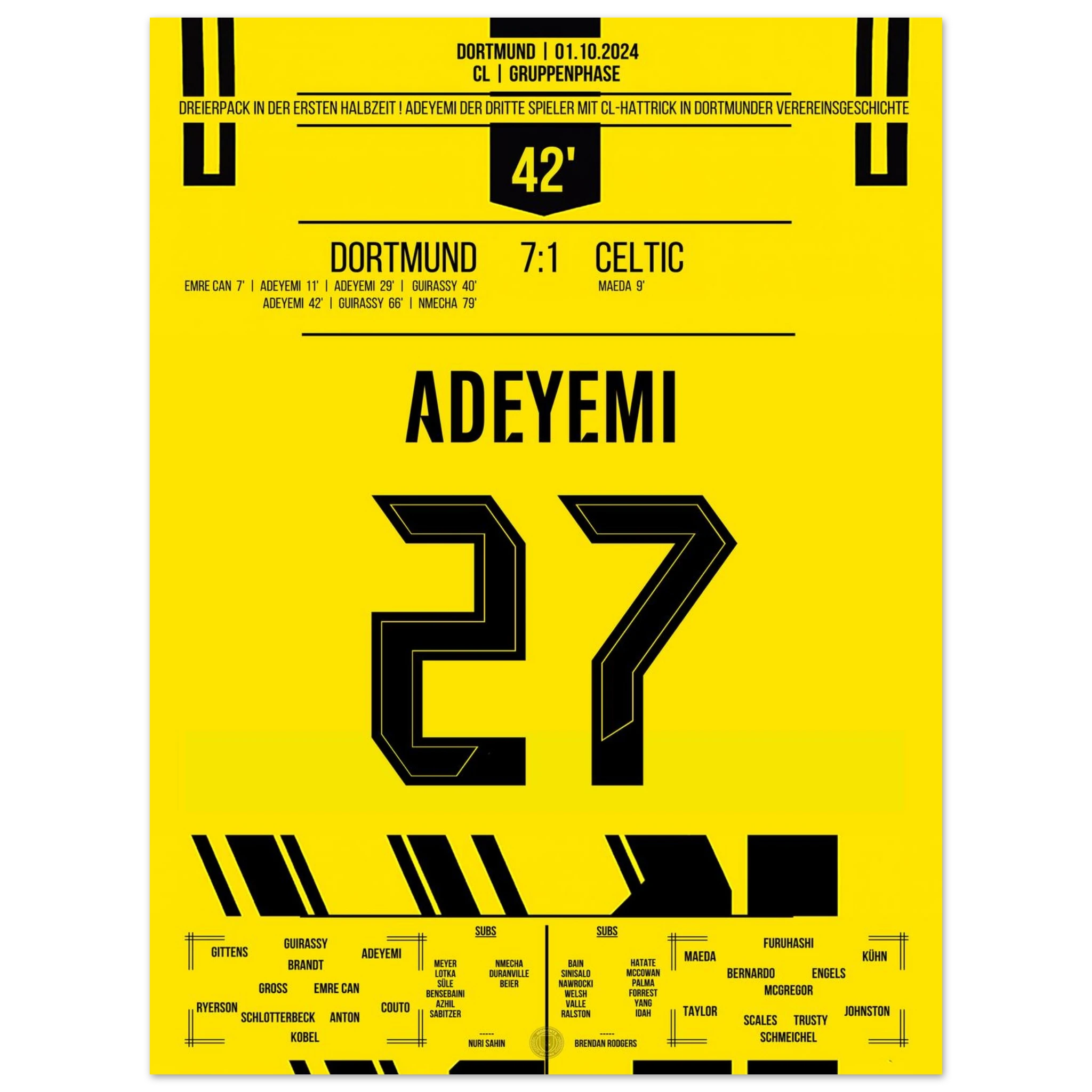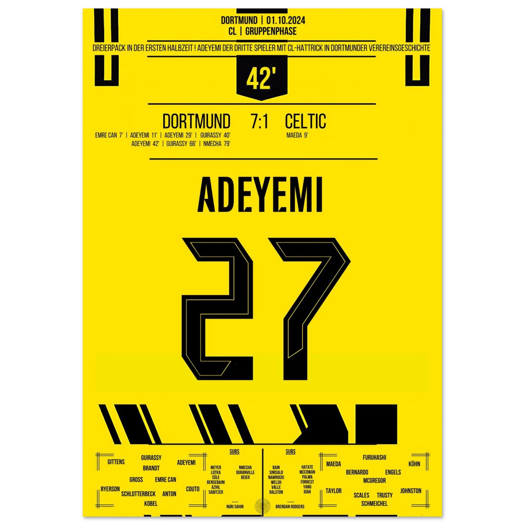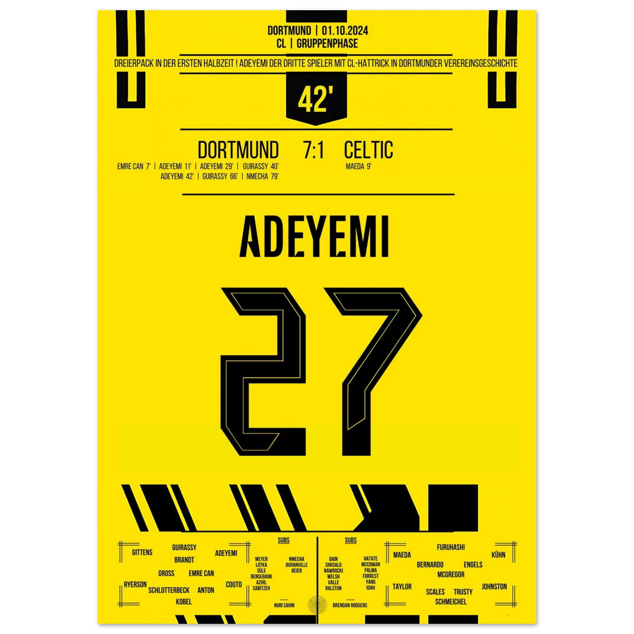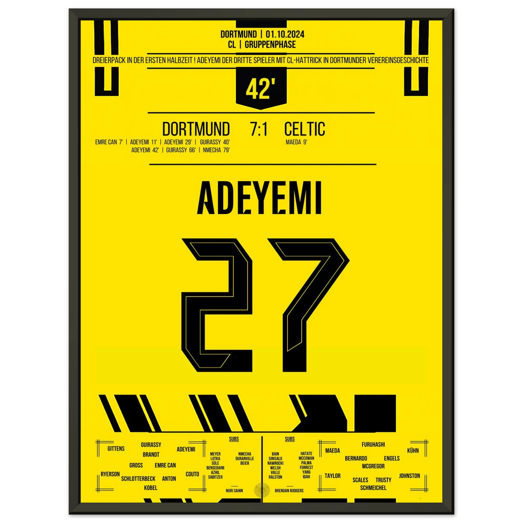 Unser Poster feiert Adeyemis magische Nacht – pure Explosivität in Schwarz und Gelb, festgehalten für die Ewigkeit.