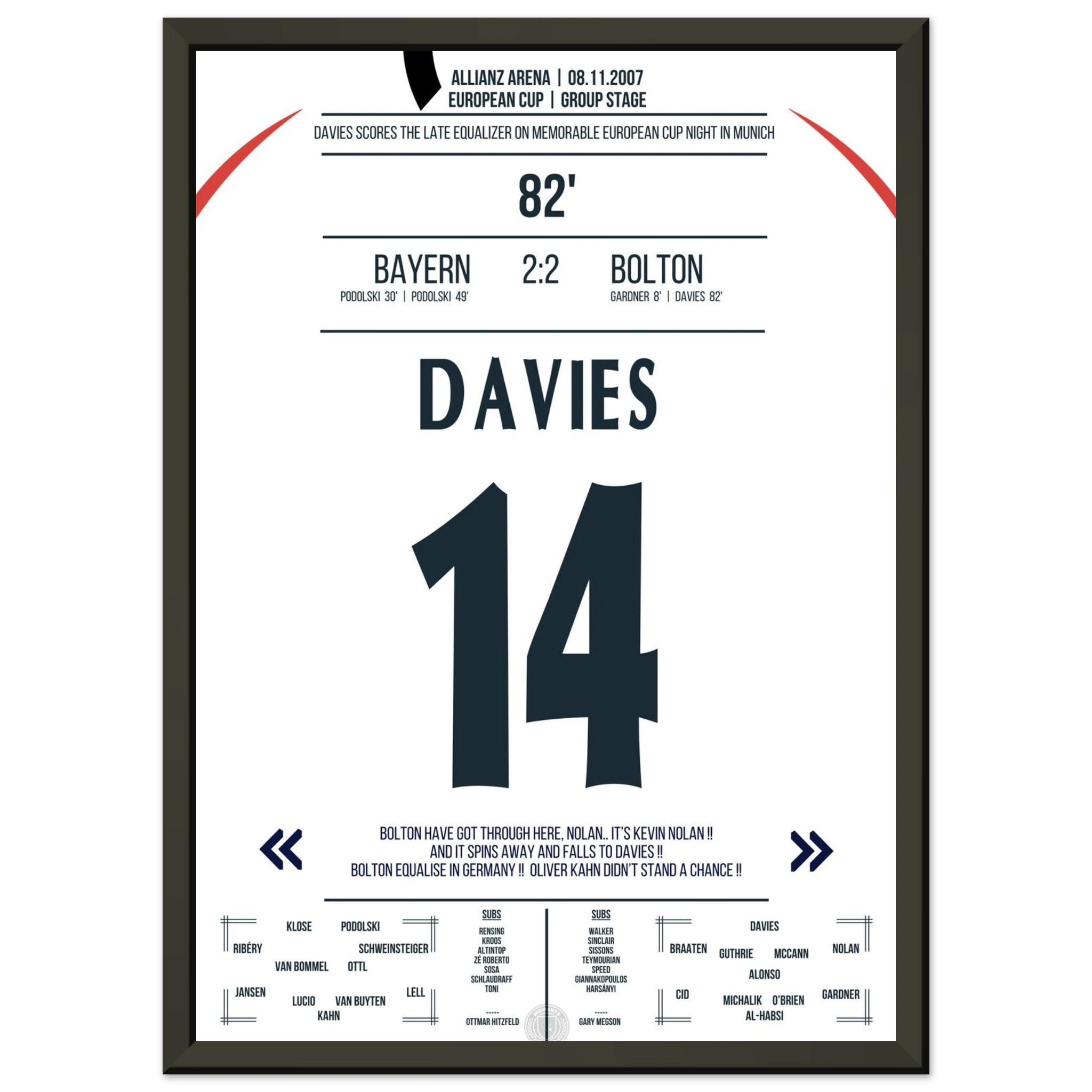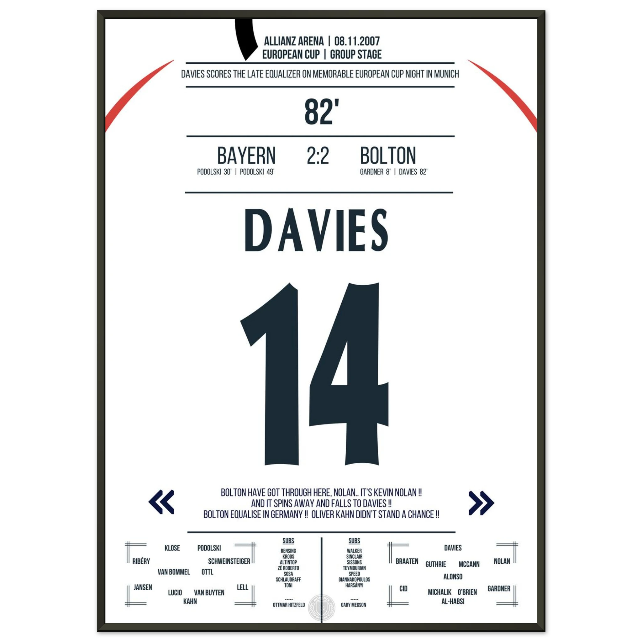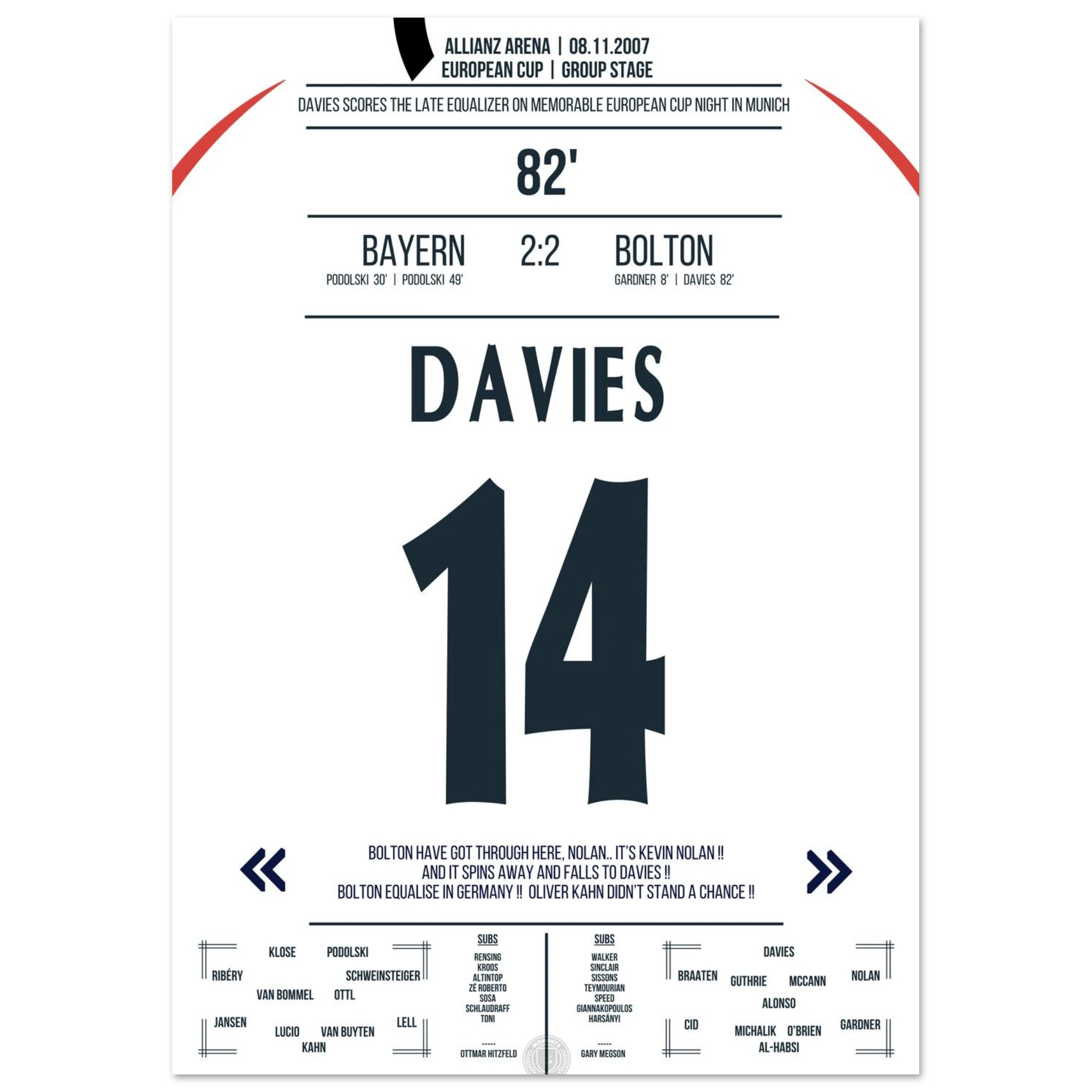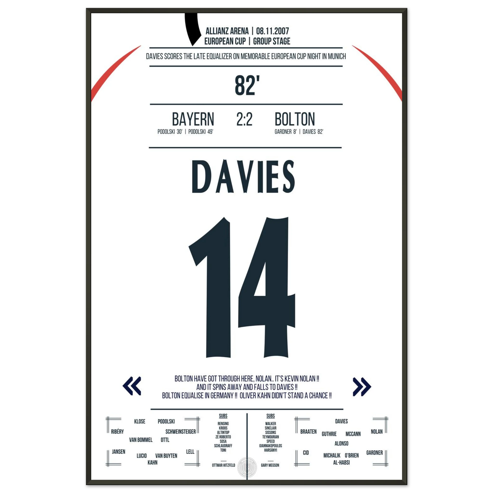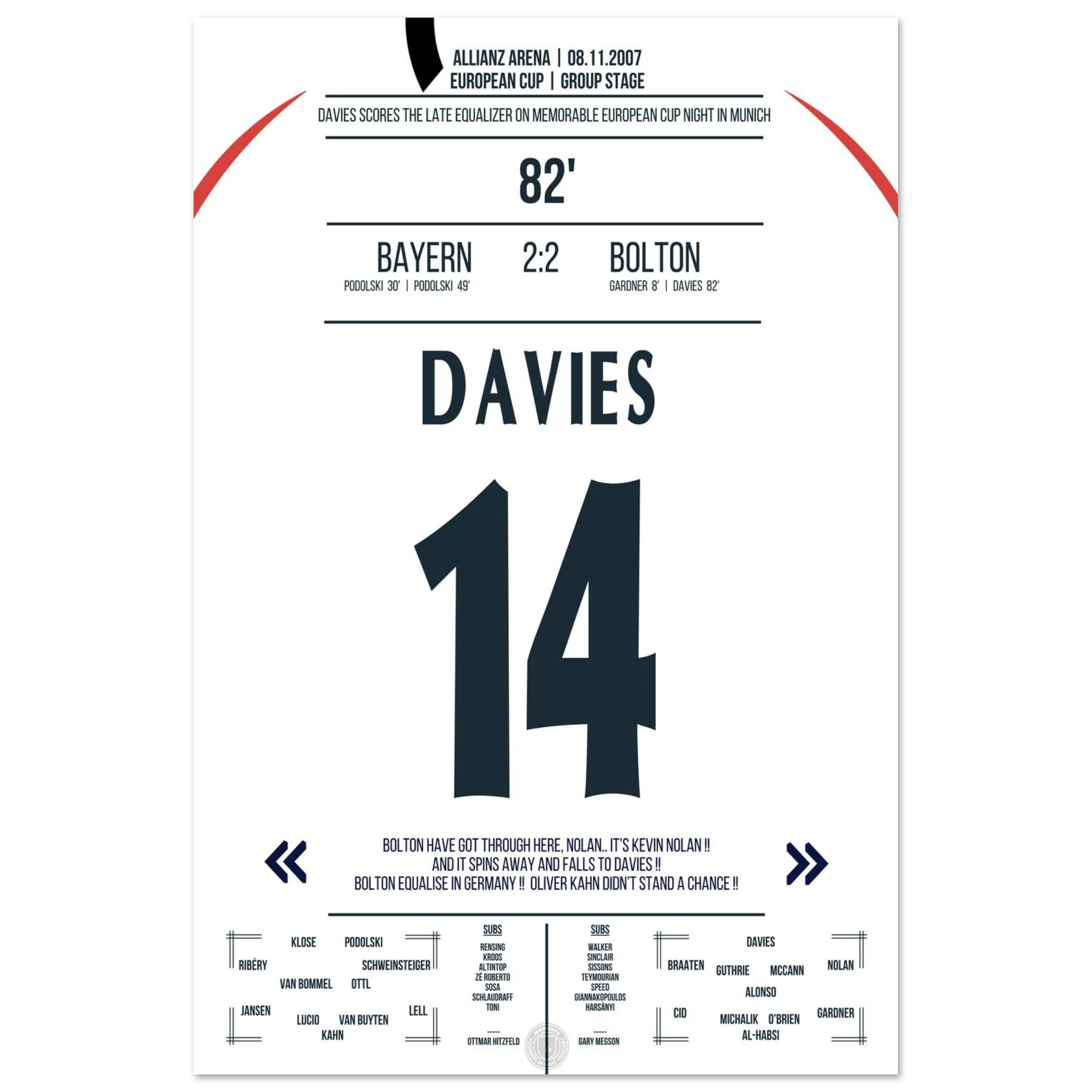 Ein denkwürdiger Europapokalabend in München: Trotz drückender Überlegenheit kassiert Bayern kurz vor Schluss den Ausgleich. In der 82. Minute trifft Kevin Davies nach einem energischen Konter und sichert Bolton ein überraschendes 2:2 gegen den Favoriten.