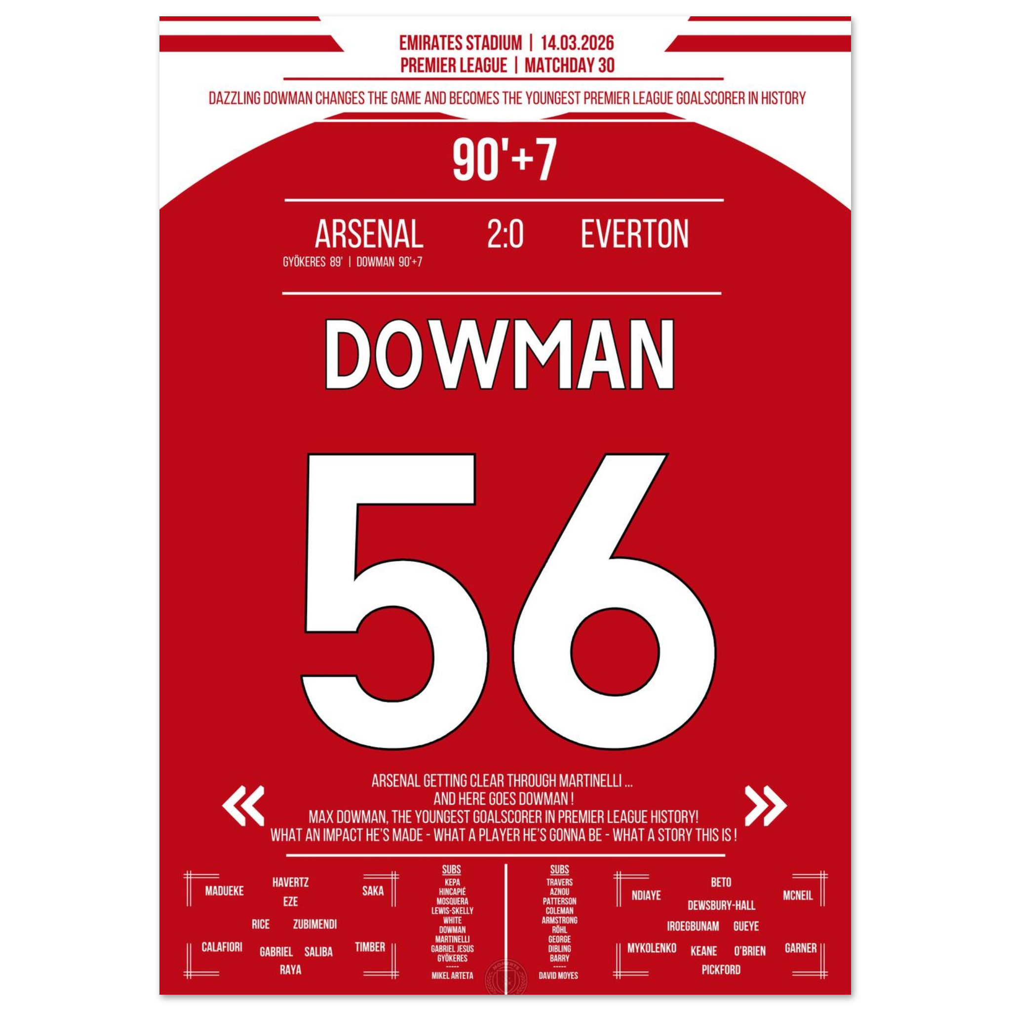 March 14, 2026 – Arsenal vs. Everton 2:0 – Dowman's historic moment! ⚽