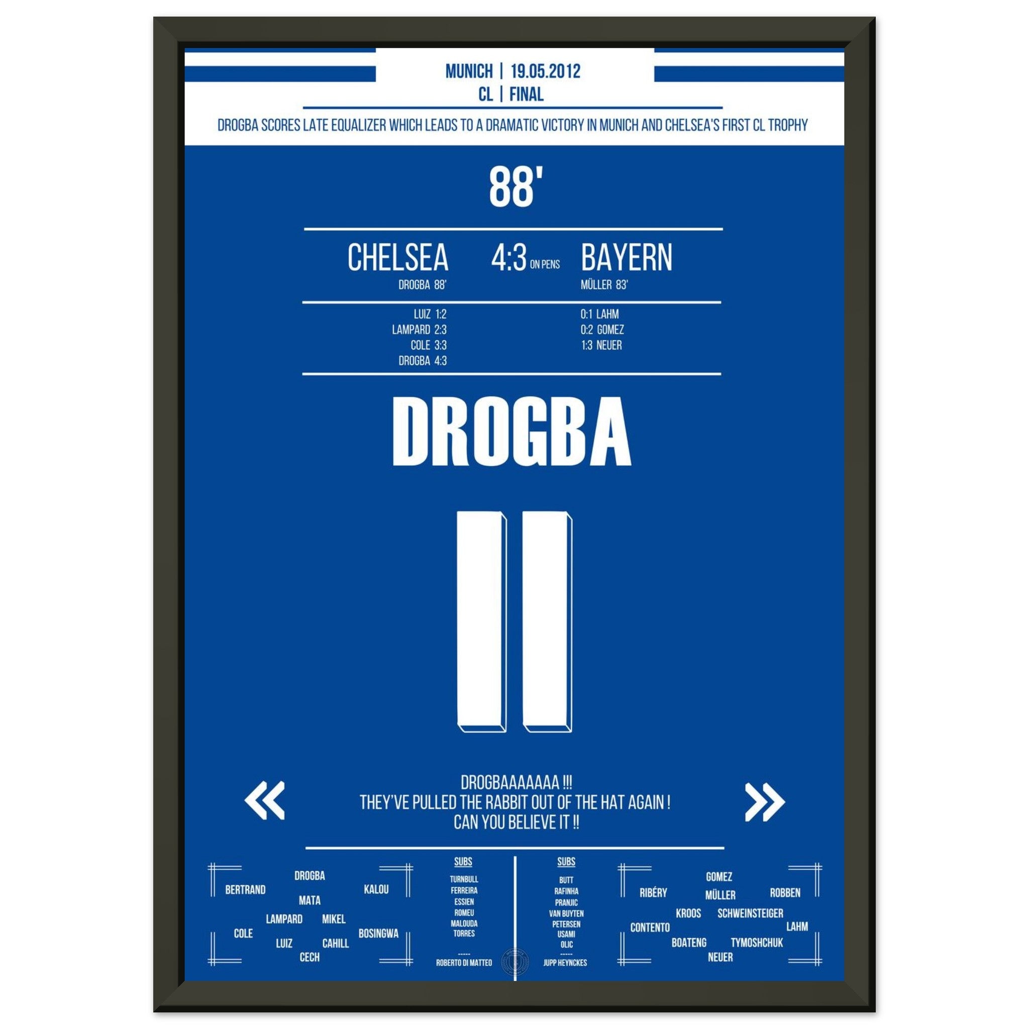 Aquí viene nuestra impresión premium de este momento de fútbol inolvidable para la mejor experiencia del fanático. Impresa en papel premium semibrillante de alto gramaje, esta obra de arte brilla con colores realzados y un brillo sutil que resalta cada detalle.