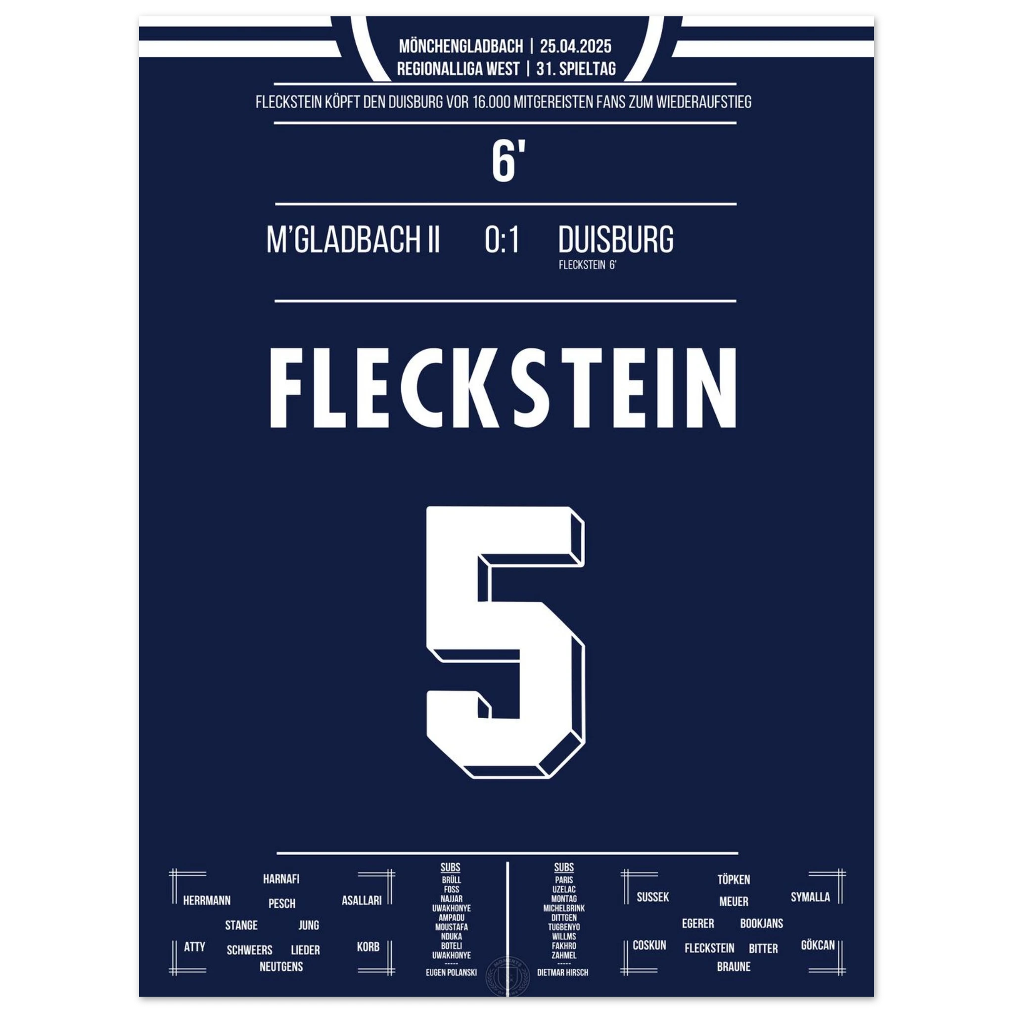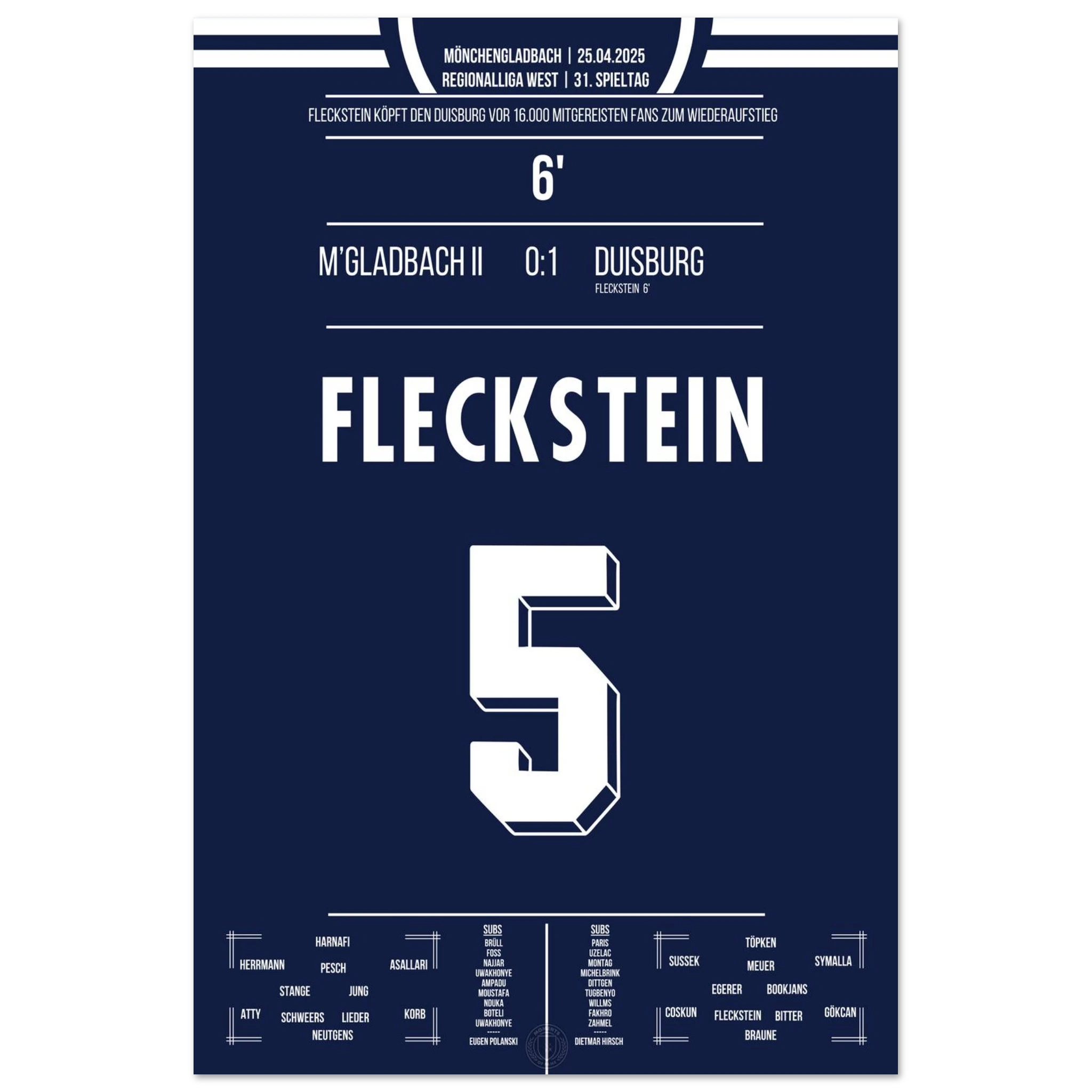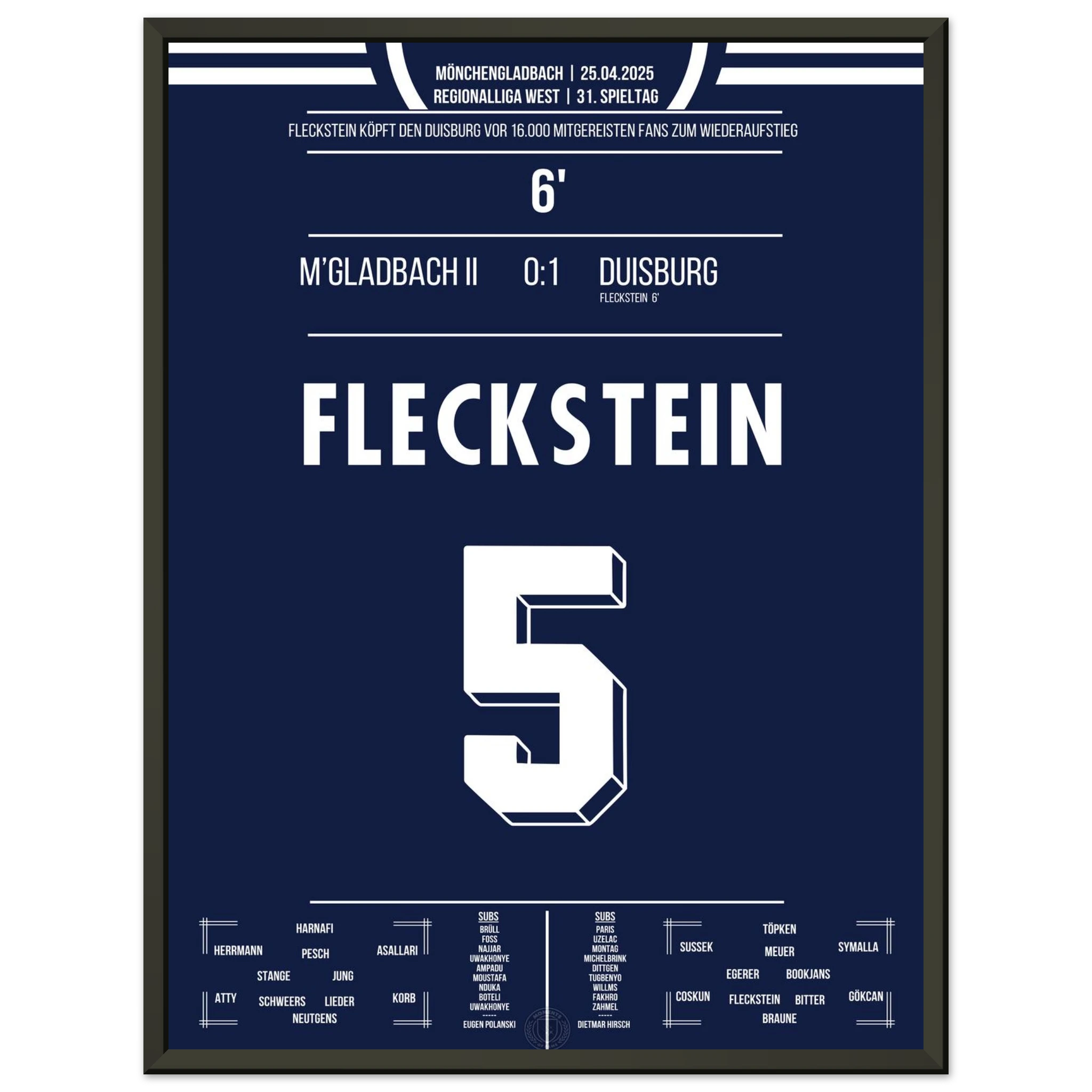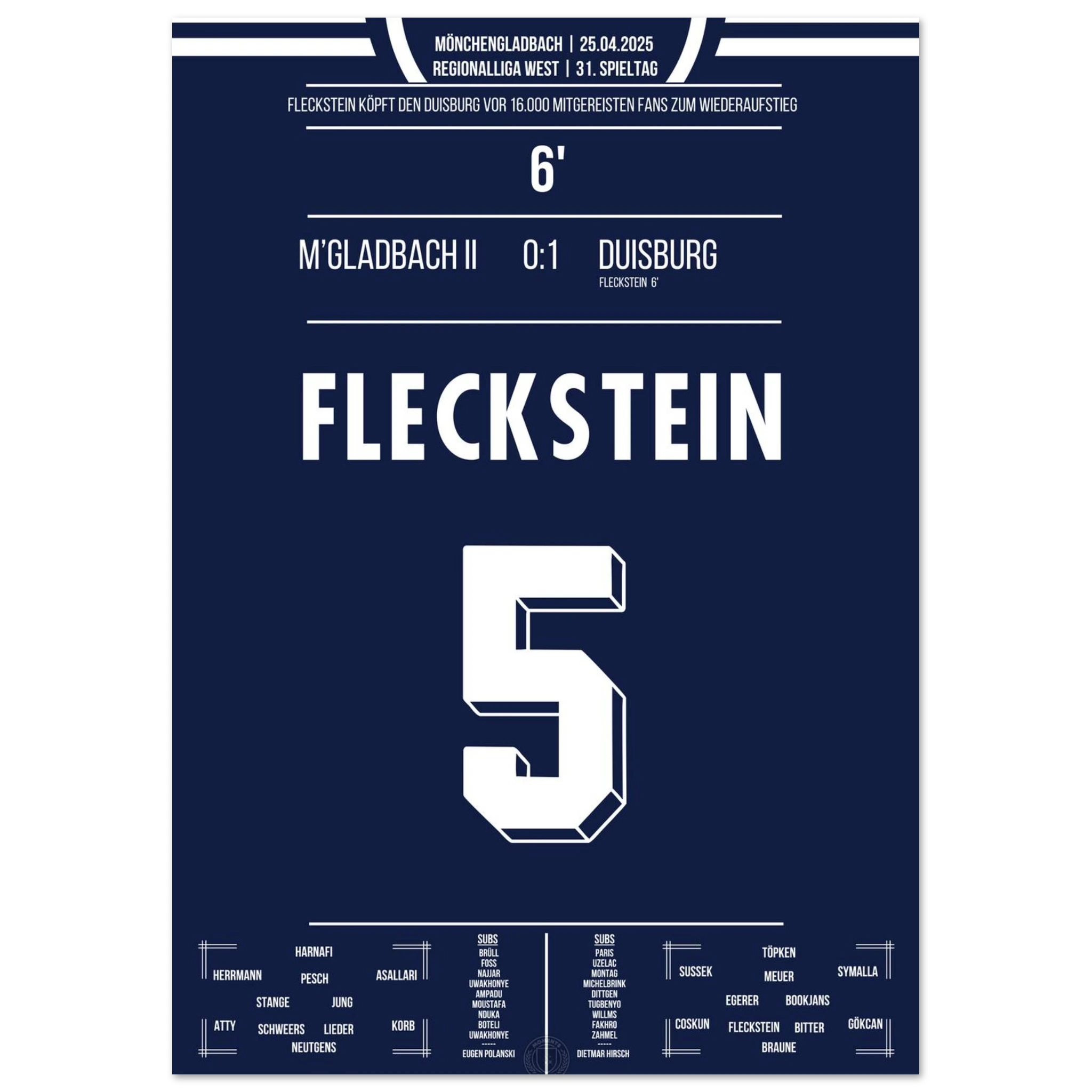 18. Mai 2024 – Mönchengladbach II vs. Duisburg 0:1: In der 93. Minute köpft Marvin Fleckstein die Zebras zum entscheidenden Auswärtssieg am letzten Spieltag und sichert damit den Aufstieg in die 3. Liga. Ein dramatischer Schlusspunkt einer nervenaufreibenden Saison. Unser Poster verewigt diesen emotionalen Aufstiegsmoment.