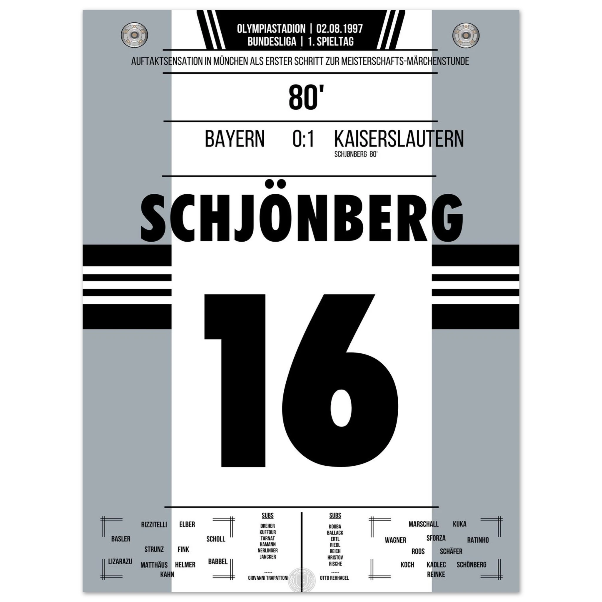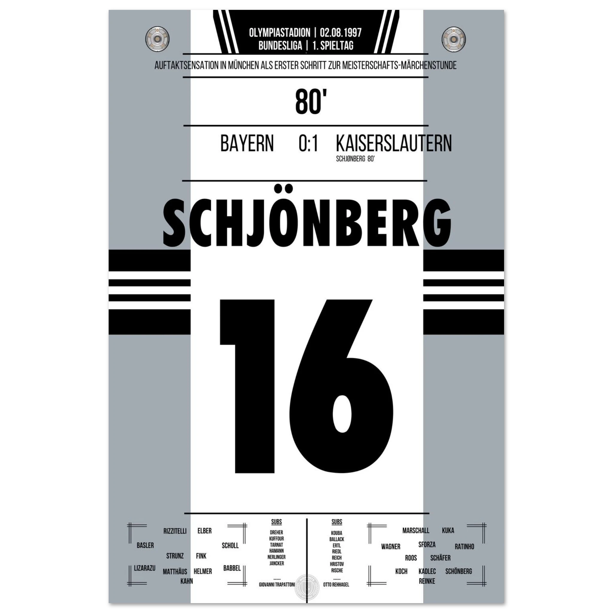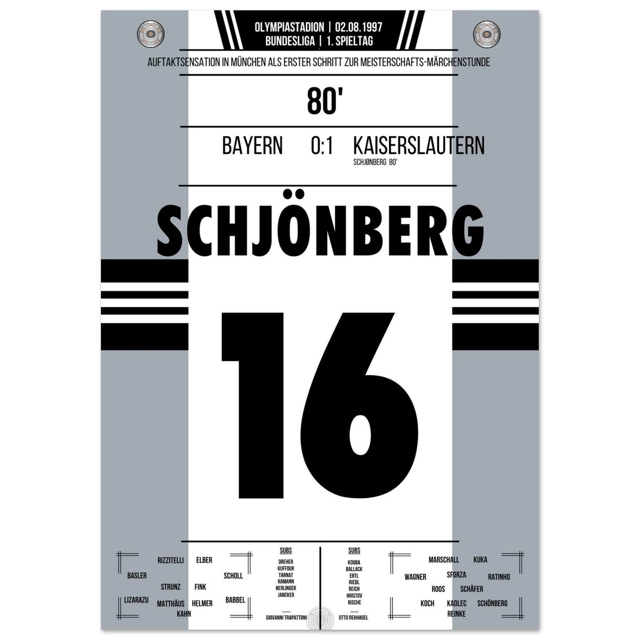 2. August 1997 – München vs. Kaiserslautern 0:1: In der 80. Minute trifft Michael Schjønberg nach einer Ecke zum 1:0 und sorgt für eine der größten Überraschungen der Bundesliga-Geschichte – Aufsteiger Kaiserslautern schlägt den Titelverteidiger Bayern am ersten Spieltag. Der Start in eine sensationelle Meisterschaftssaison. Unser Poster verewigt diesen historischen Moment.