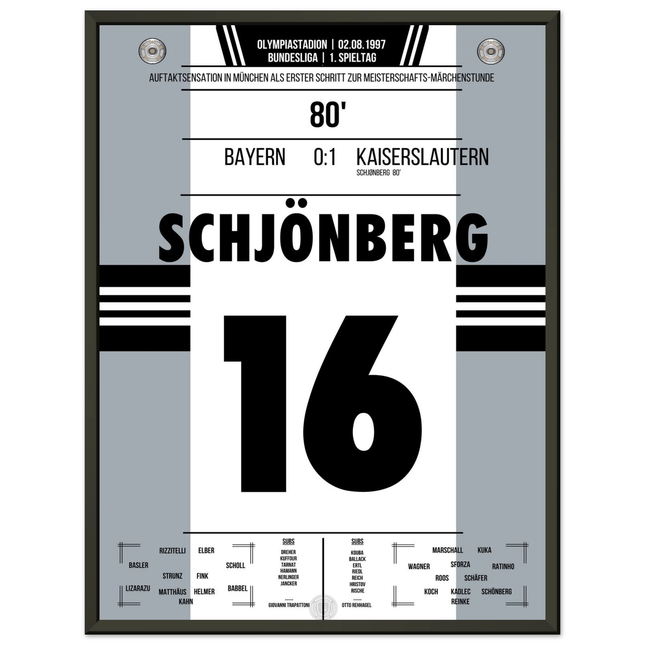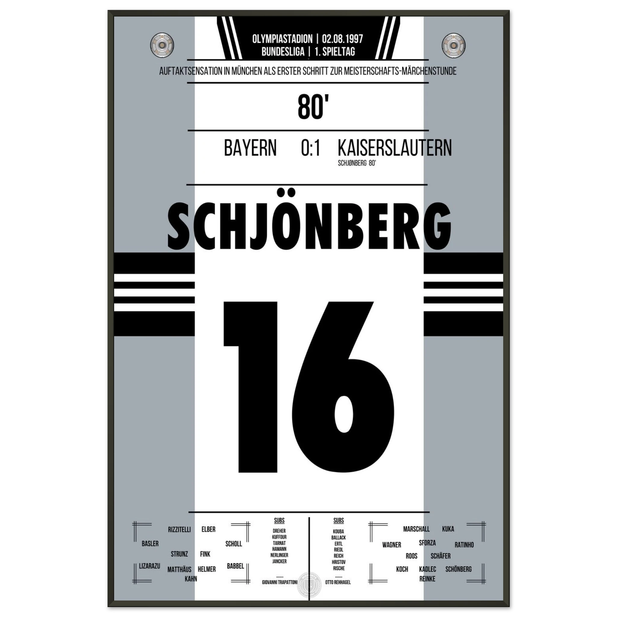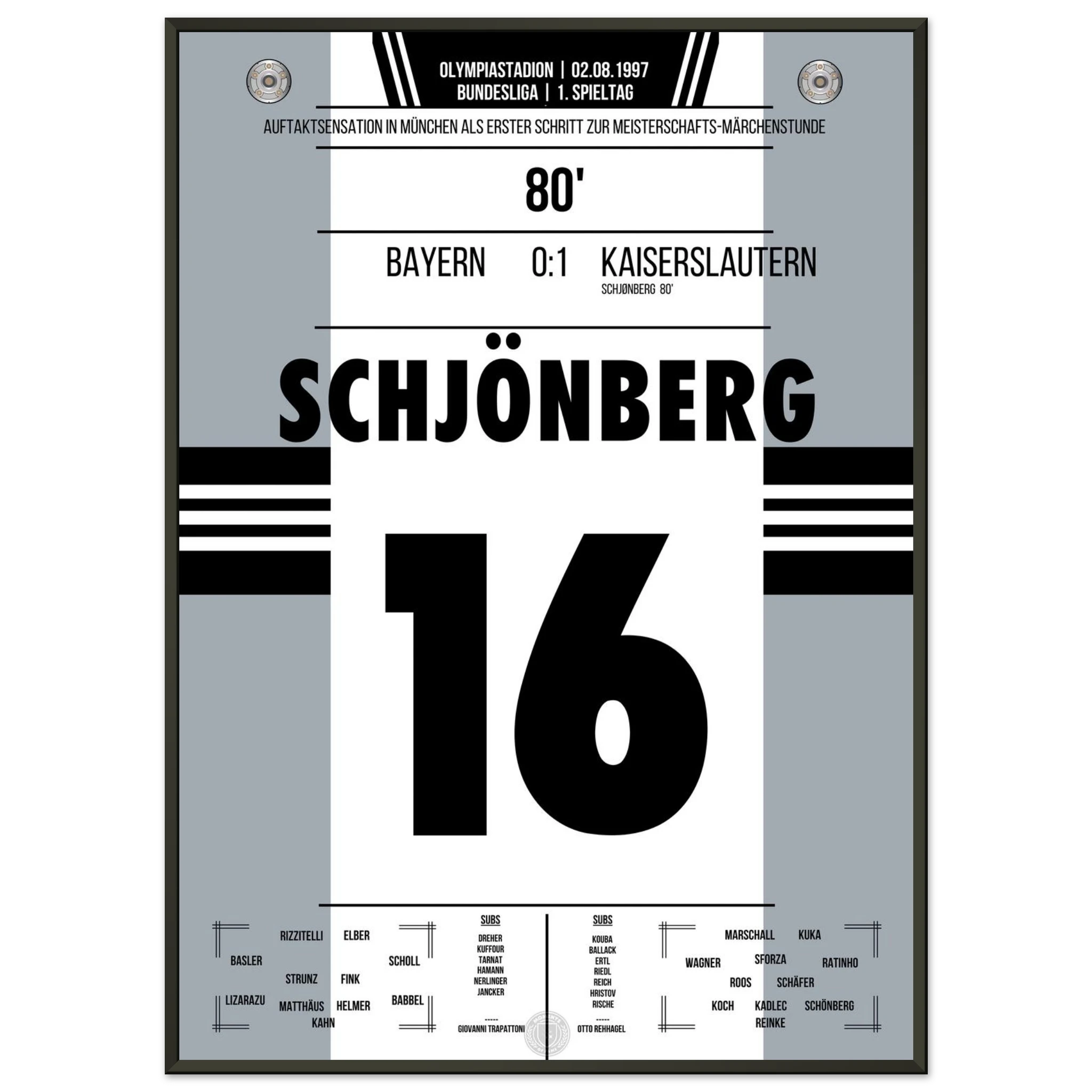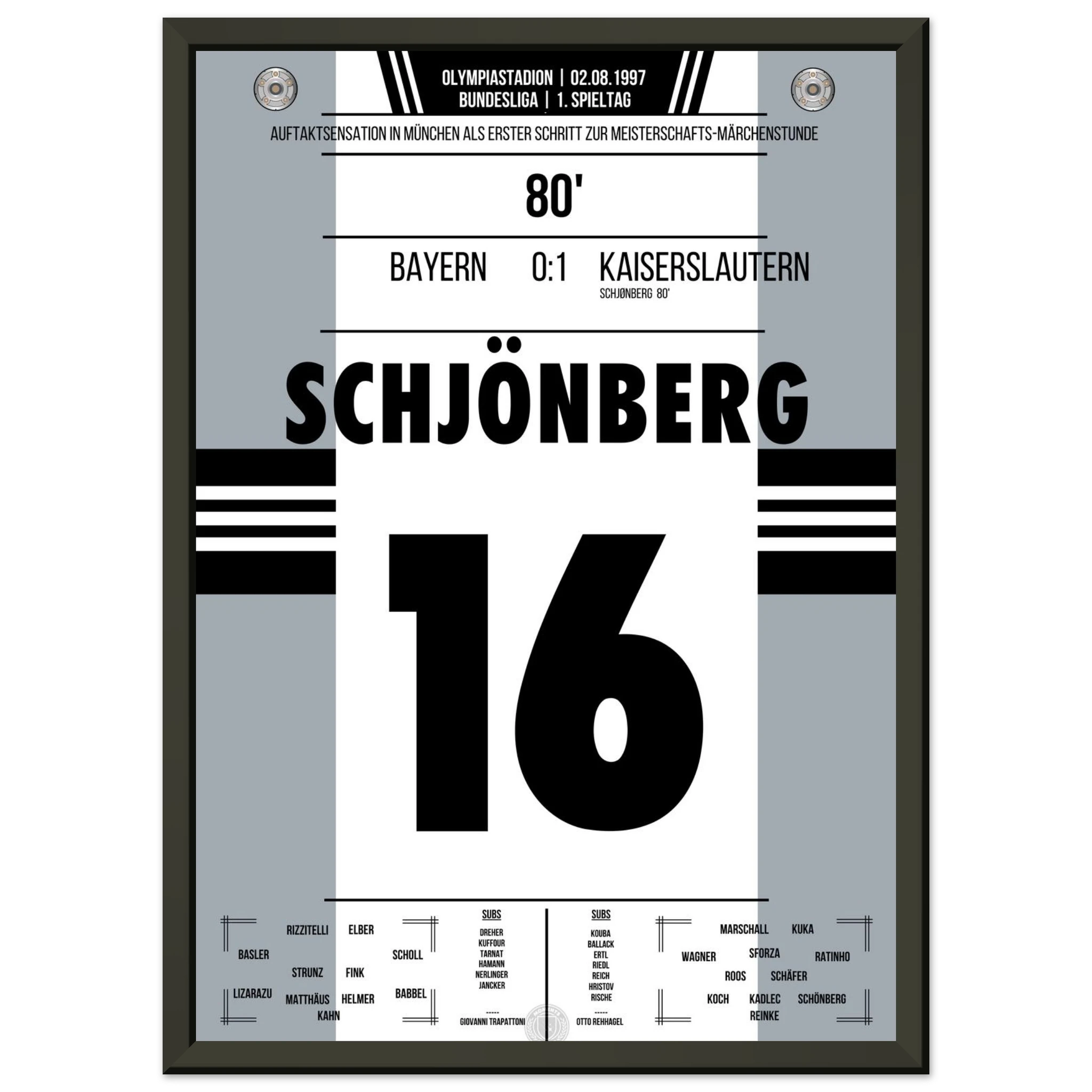 2. August 1997 – München vs. Kaiserslautern 0:1: In der 80. Minute trifft Michael Schjønberg nach einer Ecke zum 1:0 und sorgt für eine der größten Überraschungen der Bundesliga-Geschichte – Aufsteiger Kaiserslautern schlägt den Titelverteidiger Bayern am ersten Spieltag. Der Start in eine sensationelle Meisterschaftssaison. Unser Poster verewigt diesen historischen Moment.