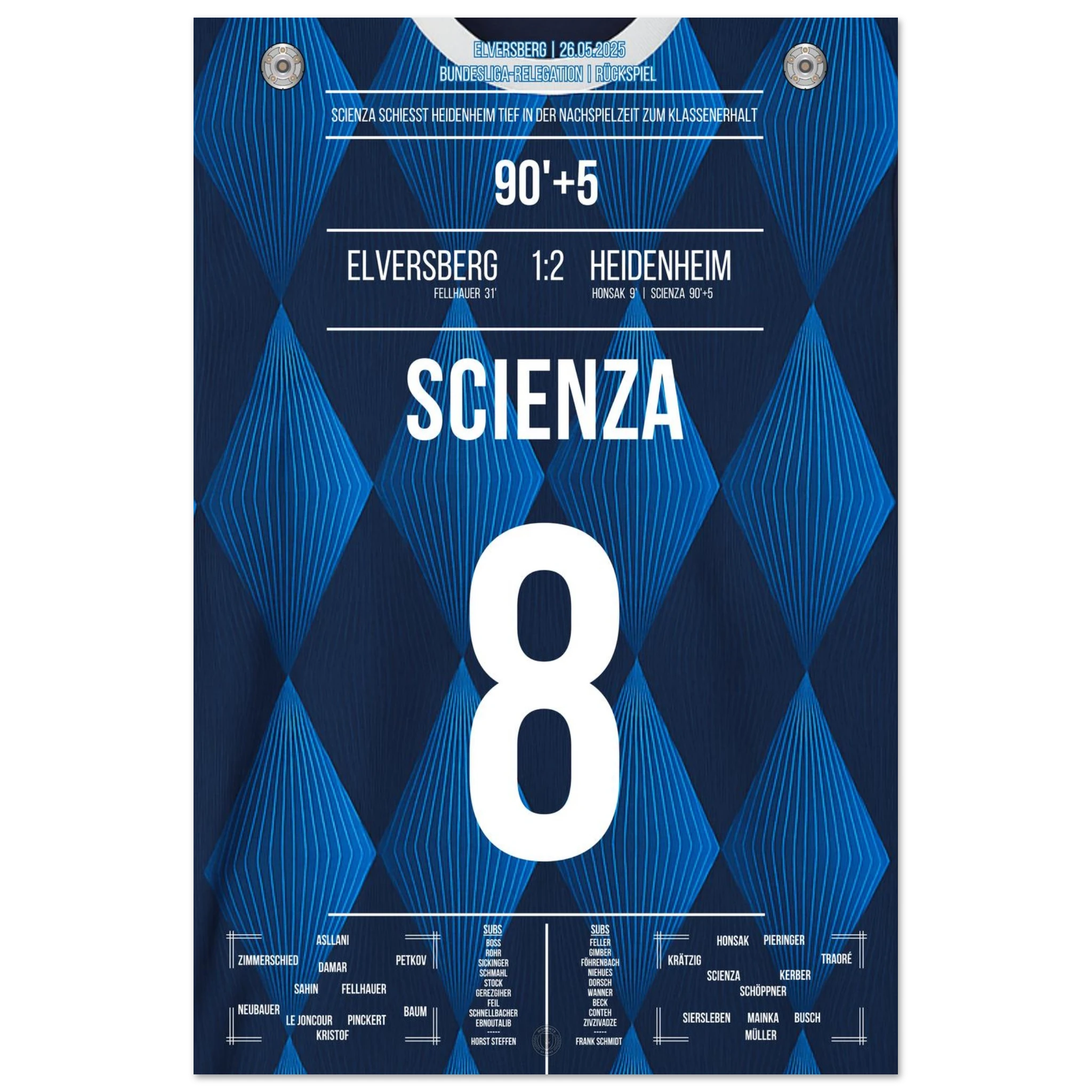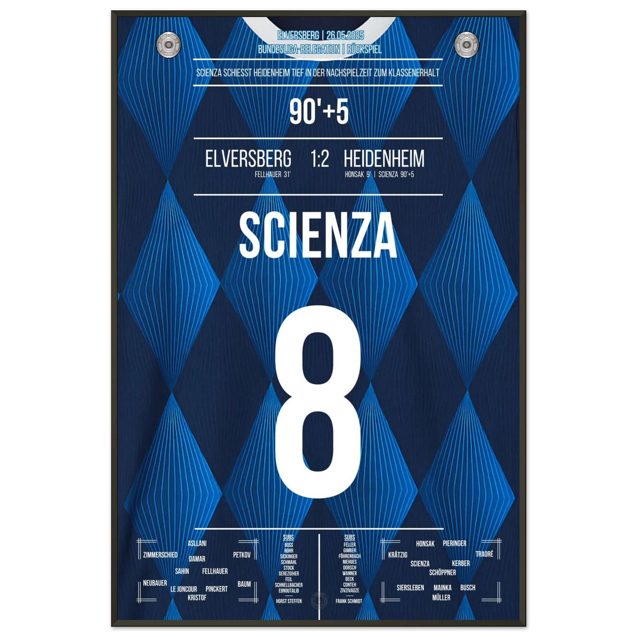 26. Mai 2025 – Elversberg vs. Heidenheim 1:2: In der 95. Minute trifft Manuel Scienza zum späten 2:1-Sieg im Relegationsrückspiel in Elversberg. Mit seinem Treffer hält er Heidenheim in der Bundesliga. Unser Poster hält diesen emotionalen Moment für die Ewigkeit fest.