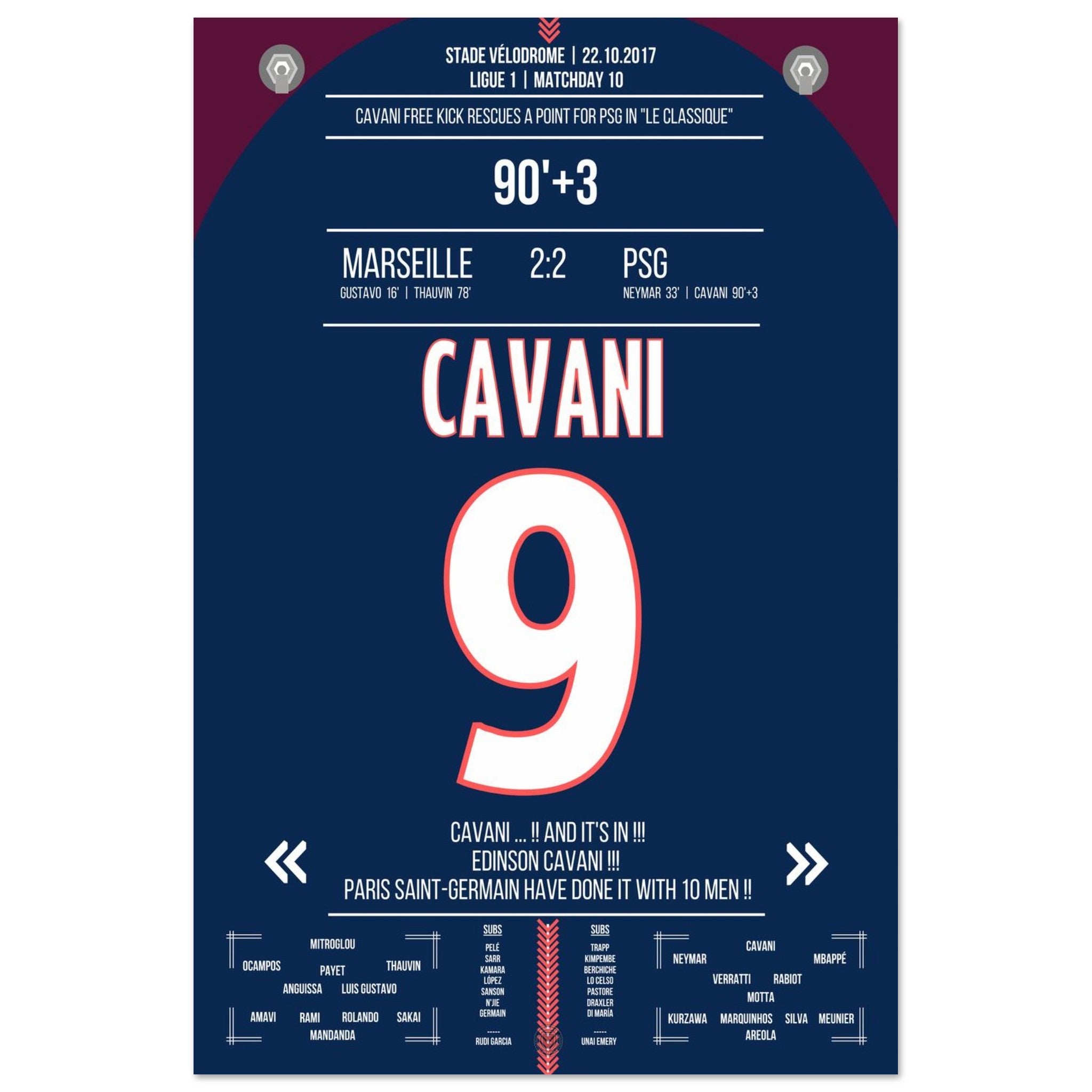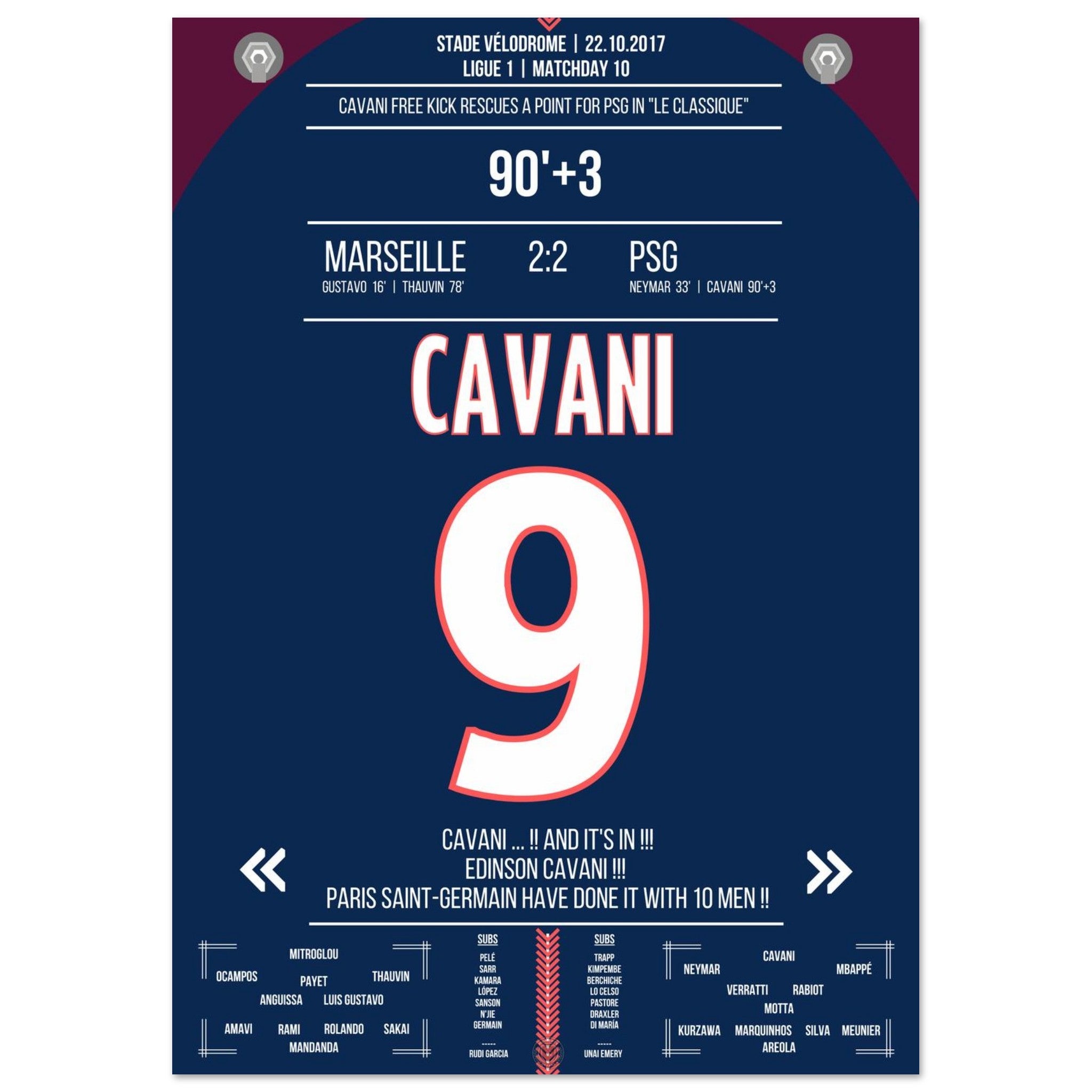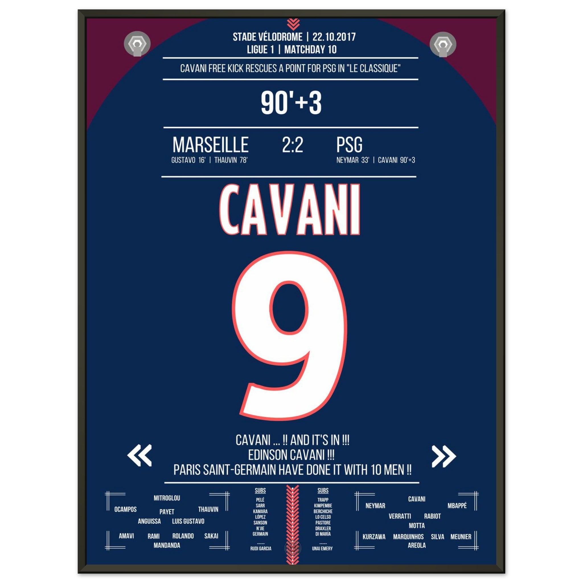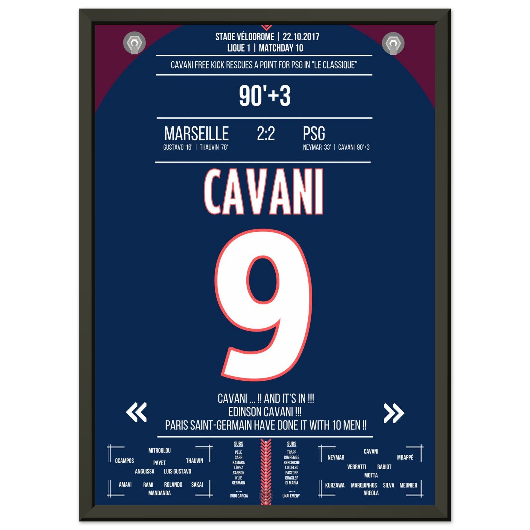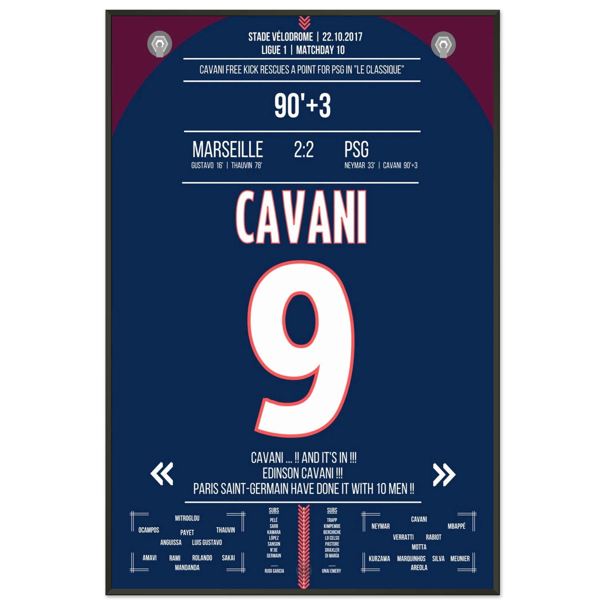 Aquí viene nuestra impresión premium de este momento de fútbol inolvidable para la mejor experiencia del fanático. Impresa en papel premium semibrillante de alto gramaje, esta obra de arte brilla con colores realzados y un brillo sutil que resalta cada detalle.