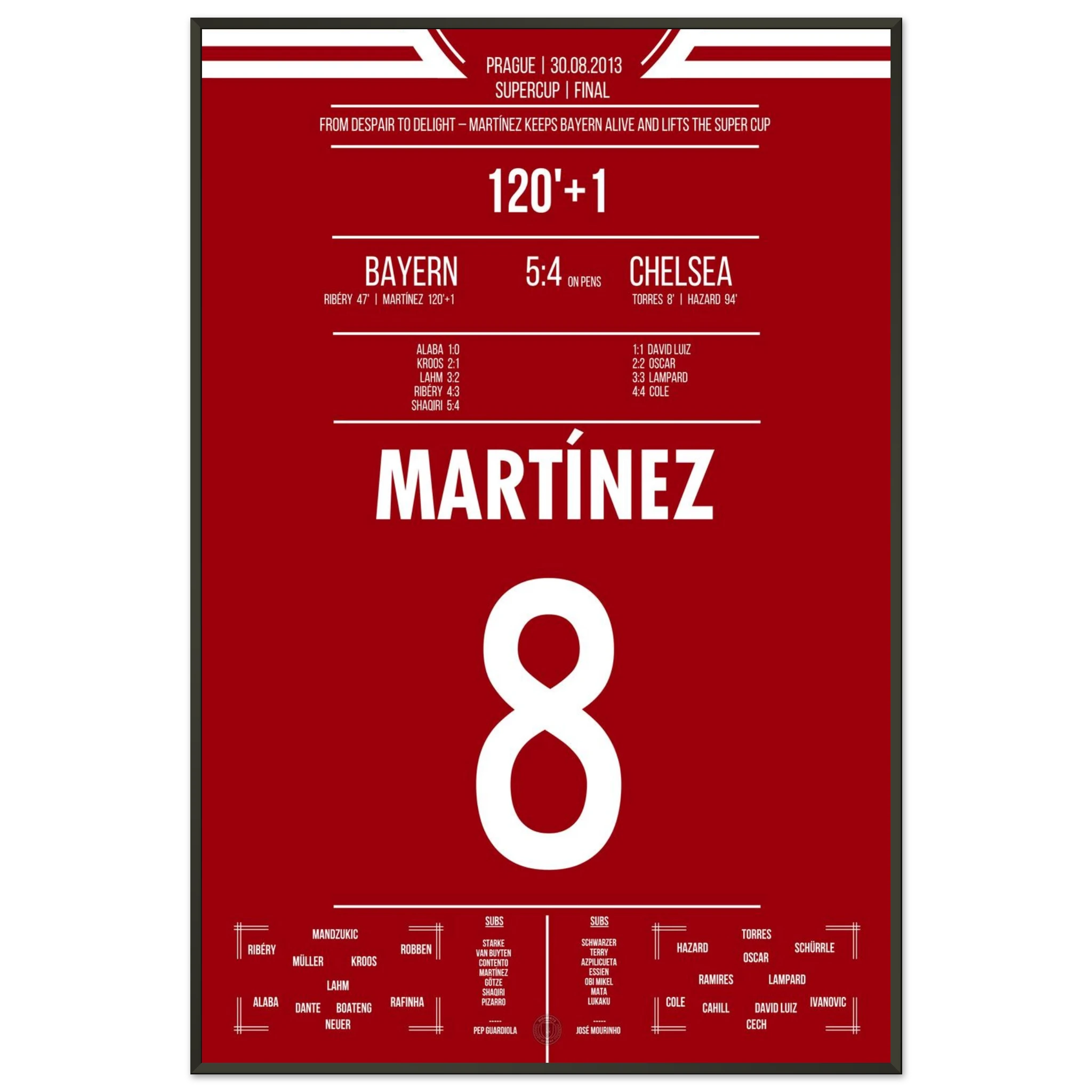 Im europäischen Supercup sorgt Javi Martínez in der 121. Minute für Ekstase: Mit seinem Treffer in der Nachspielzeit der Verlängerung rettet er München ins Elfmeterschießen. Dort behalten die Roten die Nerven und sichern sich den Titel gegen Chelsea.