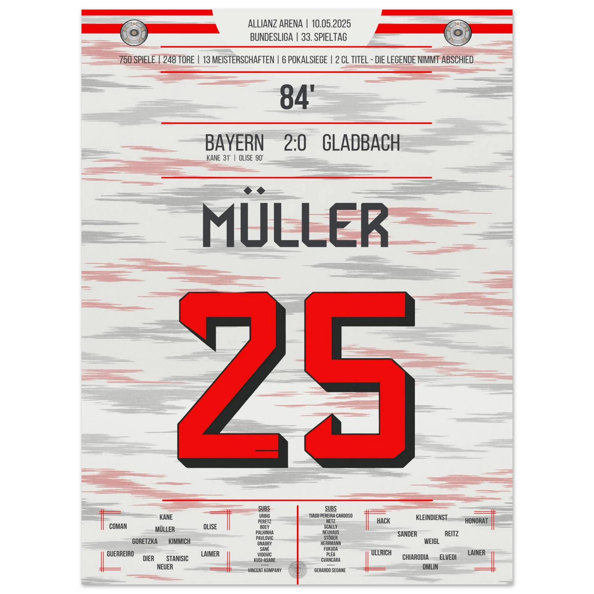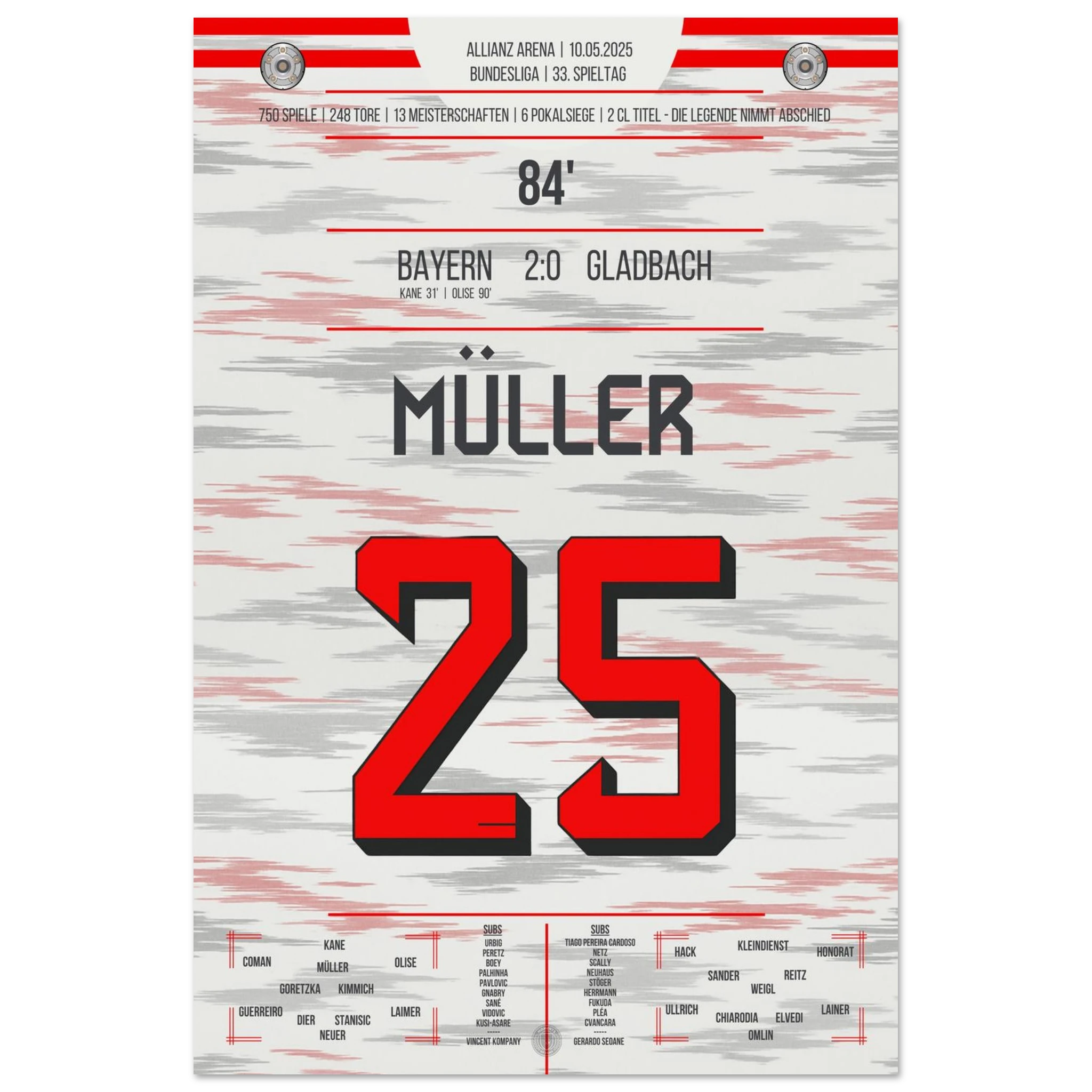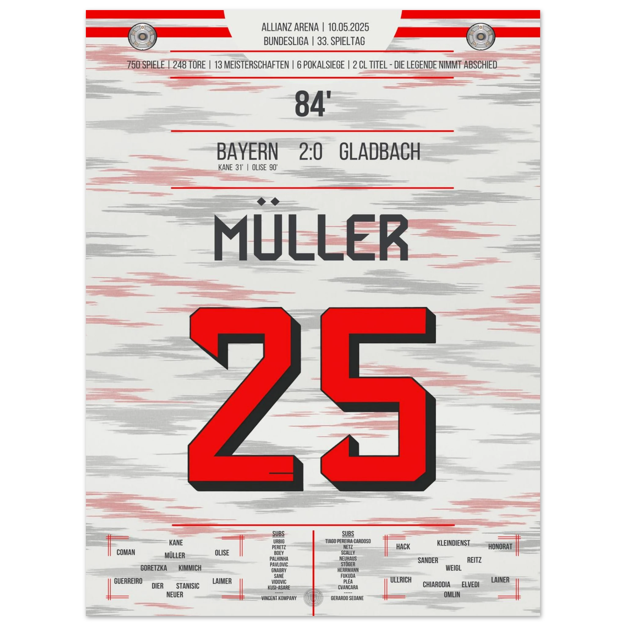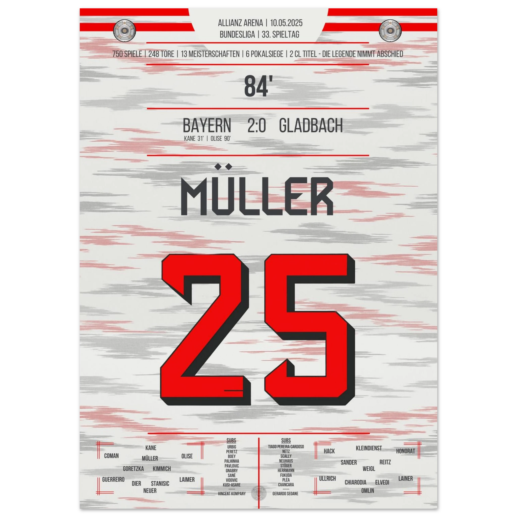 Müller trifft in der 84. Minute und setzt damit ein emotionales Zeichen in seinem Abschiedsspiel. Mit diesem Tor krönt er seine Karriere und sorgt für einen unvergesslichen Moment im Stadion.